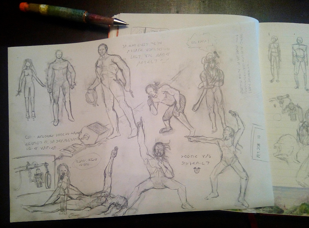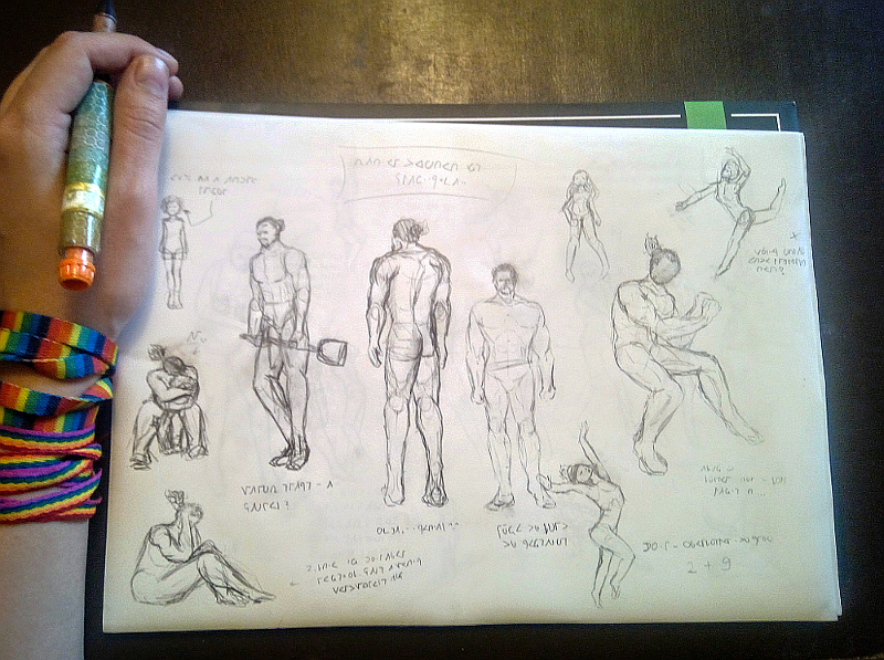 Ganze komplette Menschenetwasse. Warum? Ich bin so richtig² Mies im Menschen zeichnen und überhaupt, was Proportionen angeht. Und das obwohl ich bereits mehrere Anatomiebücher durchgetackert äh -geackert habe. Mehrmals. Und ich lerns einfach nicht, passende Proportionen sind bei mir Zufall. Ich zeichne hier also Menschen. Komplett. Schnell. In verschiedenen Positionen und Formen. Keine einzelnen Köpfe, keine Hände, keine Zehennägel, sondern komplette Menschen, mit allem drum und dran. Jedoch auch nicht ausgearbeitet, sondern wie schon gesagt schnell. Also eher so die Grundrisse. Das ist mir besonders wichtig, da ich mich beim Zeichnen immer in Details verliere. Denn für schnelle Comics (beim 24hComicday scheitern die meisten meiner Ideen an der Fähigkeit, Menschen schnell zu zeichnen, darum war der Hauptchar in meinem letzten 24h Comic auch ein Pixelfehler…) ist das leider hinderlich. Damit ich nicht in Versuchung komme, langsame (haha, ein Witz) und detaillierte Lines aufs Papier zu schmieren oder den Menschenteilen mords ausgearbeitete Klamotten zu verpassen, arbeite ich mit Bleistift auf Steinpapier (das verstopft nämlich meine Liner). Mir wird immer gesagt, wenn ich mir nur etwas mehr Zeit lassen würde, würden meine Bilder nicht so schief und falsch aussehen. Aber das ist der Punkt: Ich will, dass sie richtig aussehen, OBWOHL ich mir dafür wenig Zeit lasse.