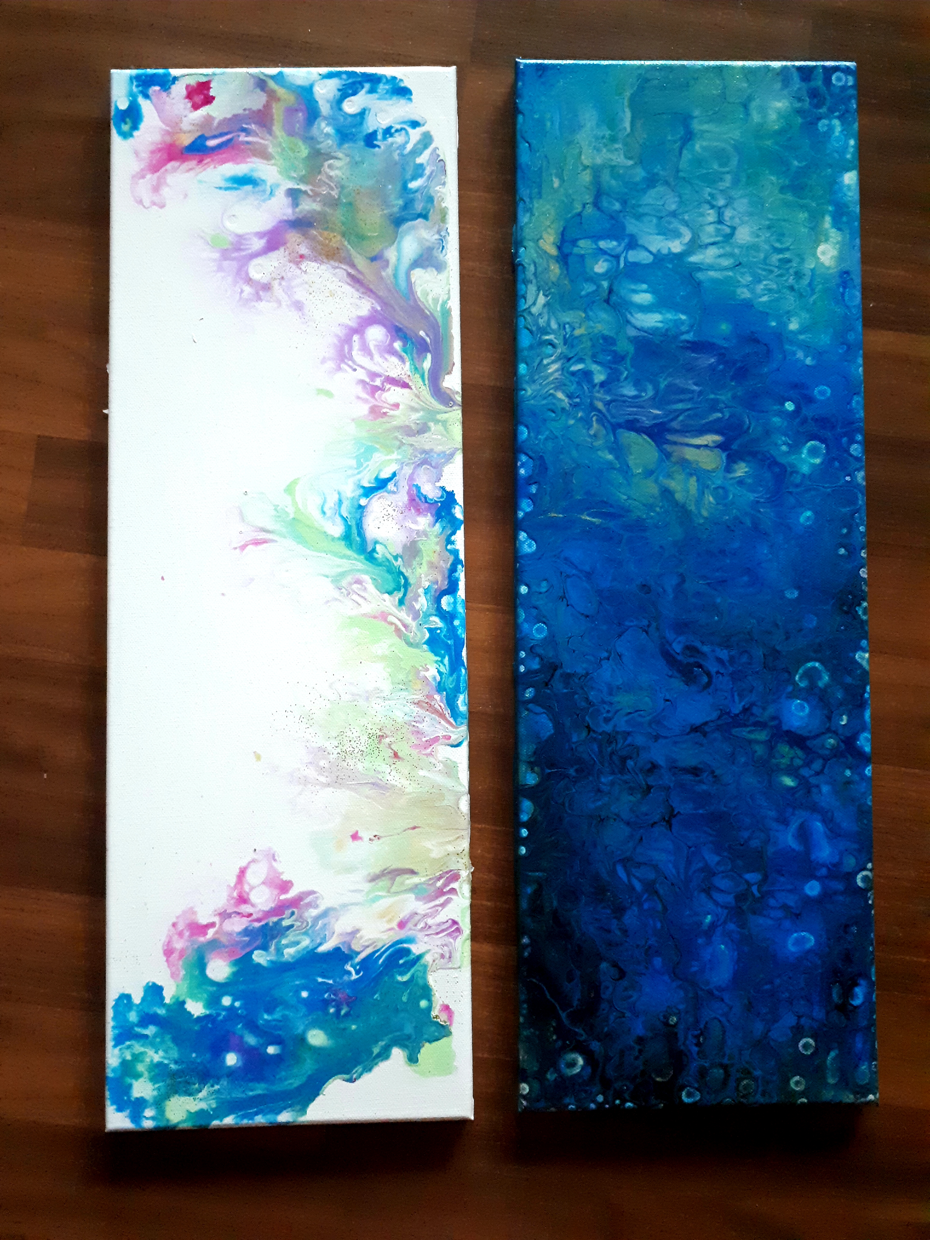 Es ist so dünnflüssig wie Wasser. Dadurch kann man sehr schlecht die Konsistenz der Farbmischung kontrollieren. Das von Nanunana war etwas dickflüssiger, damit kann man auch prima sehr flüssige Acrylfarben verarbeiten.