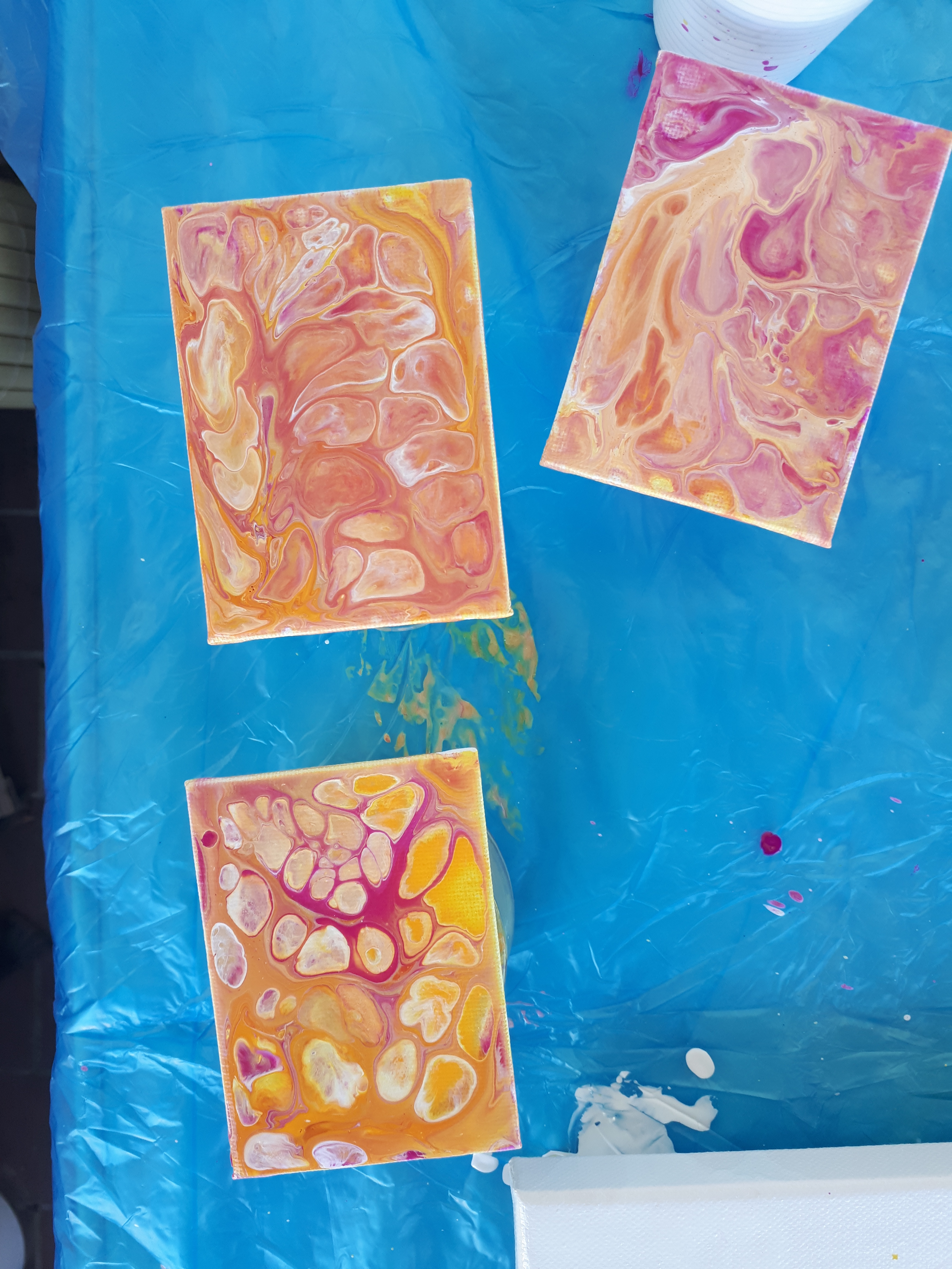 Links oben gegossen, rechts oben Farbrestpfütze, unten Flip cup.