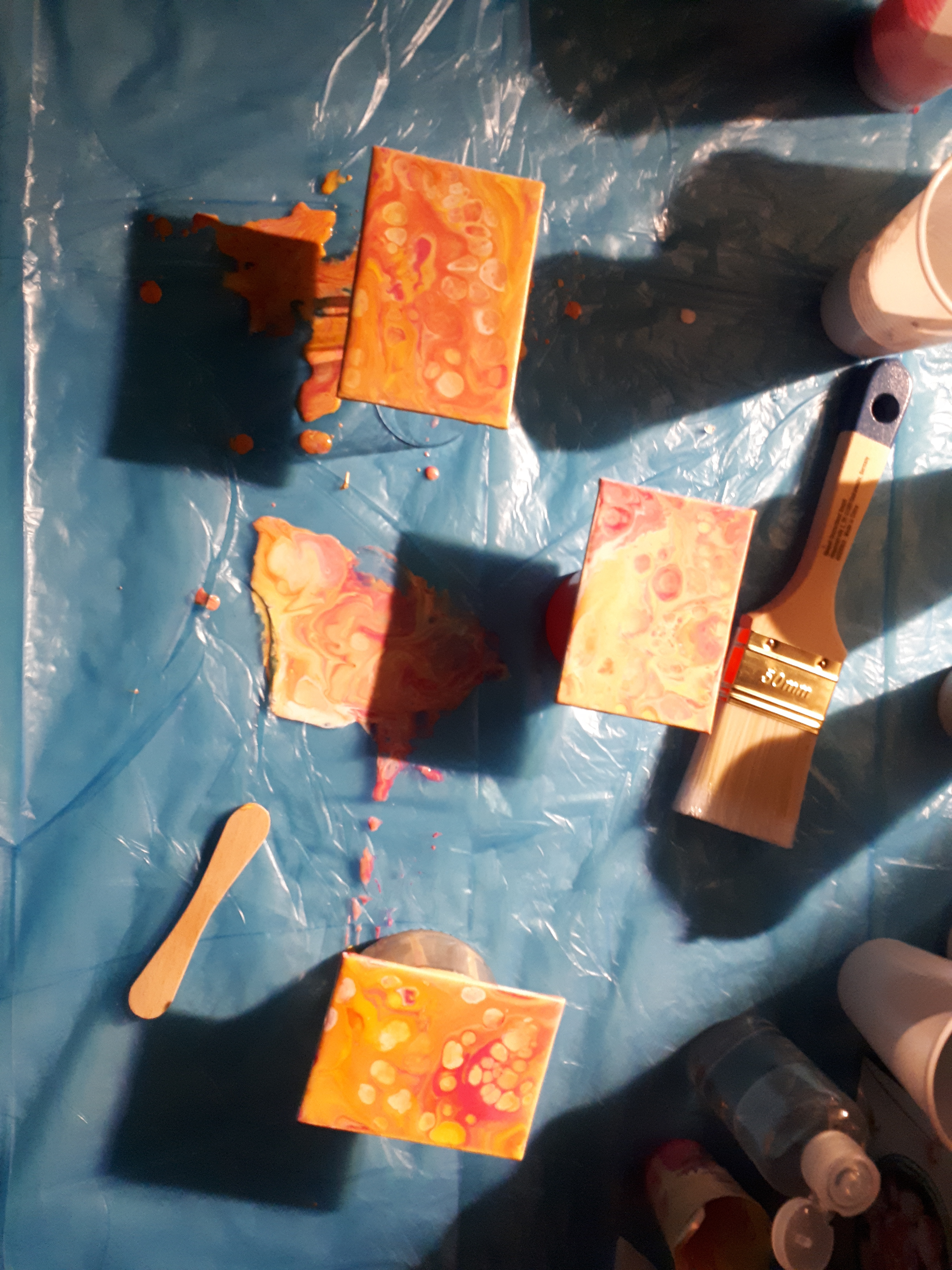 Das oberste hat ein wenig von der obersten und letzten Farbschicht aus meinem Schnapsbecher abbekommen, das untere wurde per Flip cup gemacht. Das mittlere habe ich in die Pfütze vom Flip cup gedrückt.