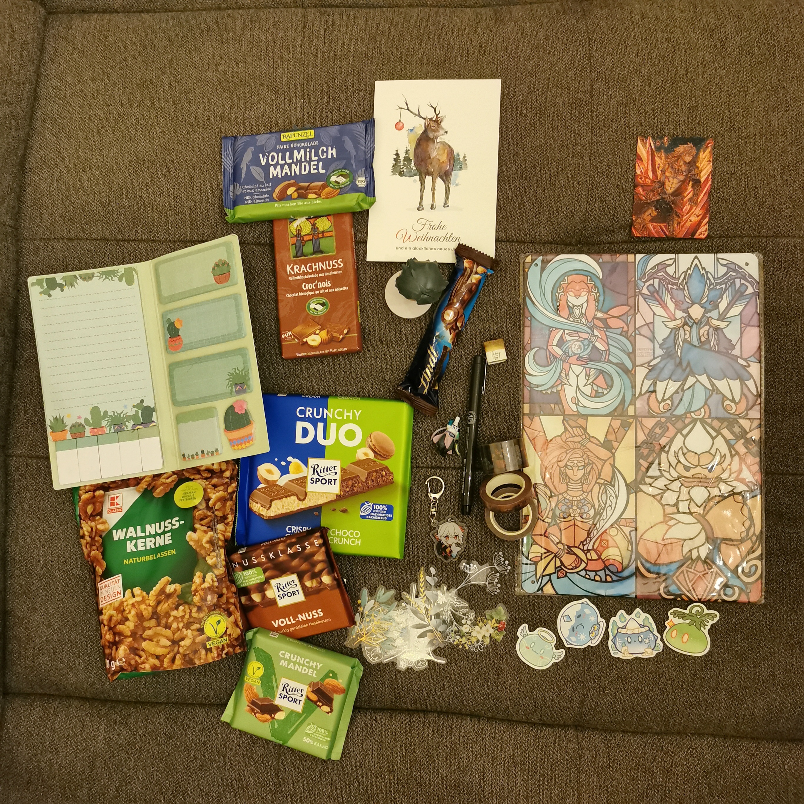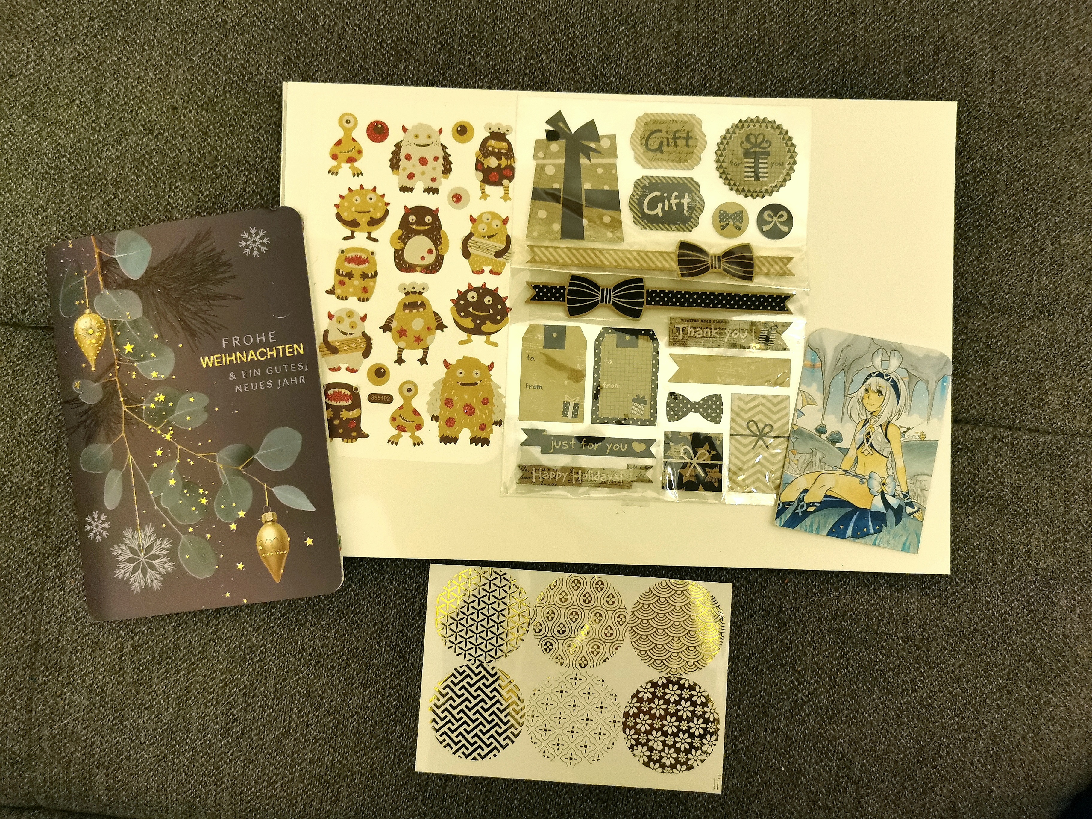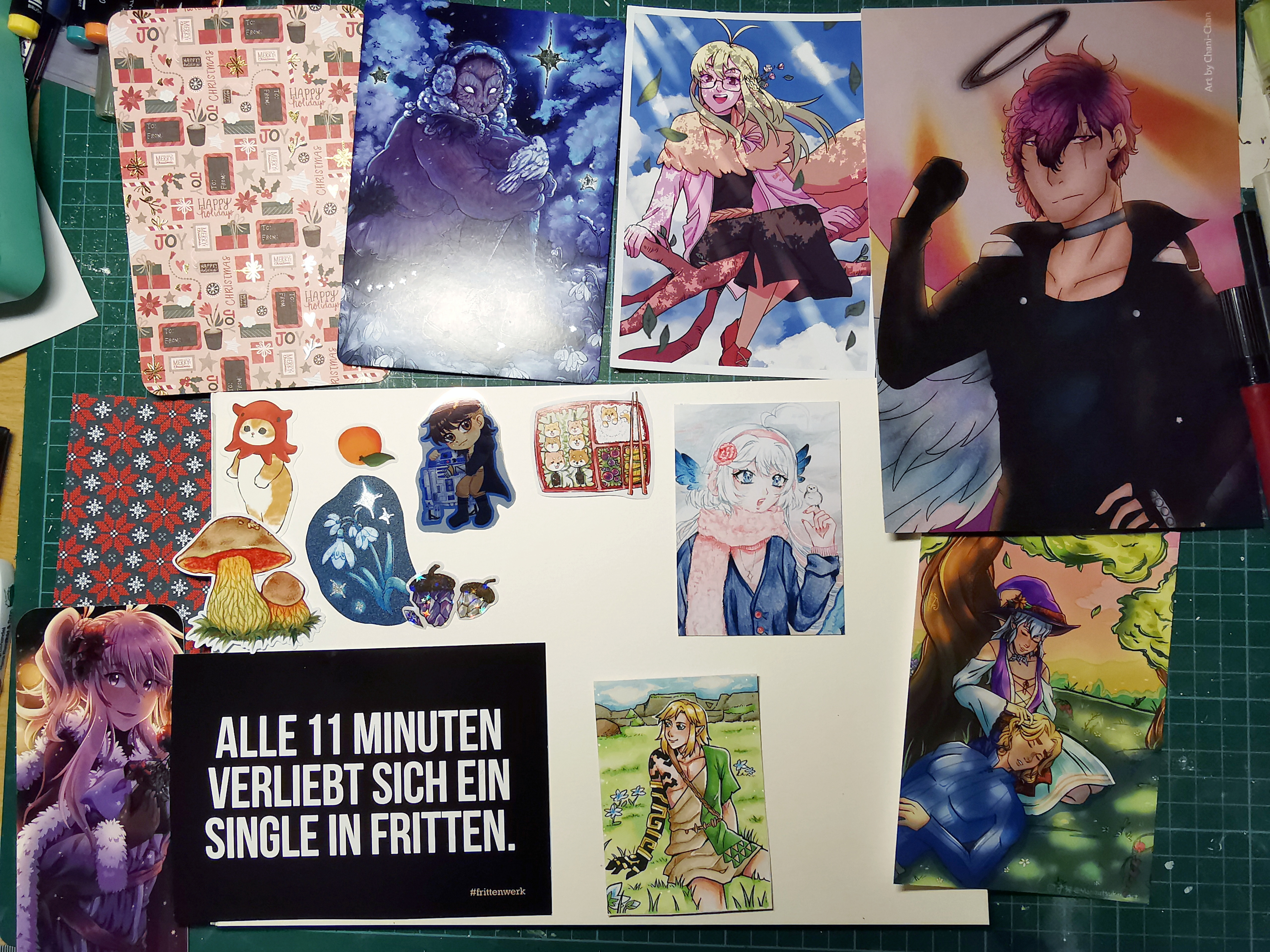 Heute vormittag saß ich noch mal eine Weile beim Arzt, aber nun bin ich dazu gekommen, die heutigen Karten zu öffnen und ja… Karten… Denn gegen Ende hatte ich doch ein paar Tauschpartner mehr, was aber immer ganz gut ist, falls doch mal irgendwo/wie was bei jemandem ist… Und somit kann ich heute und morgen 2 Karten öffnen und am 24 durch diverse Weihnachtswichteln sogar 4. Ich freue mich schon… Und heute durfte ich die Karten von @Chocoberry und @SushiMango ziehen.