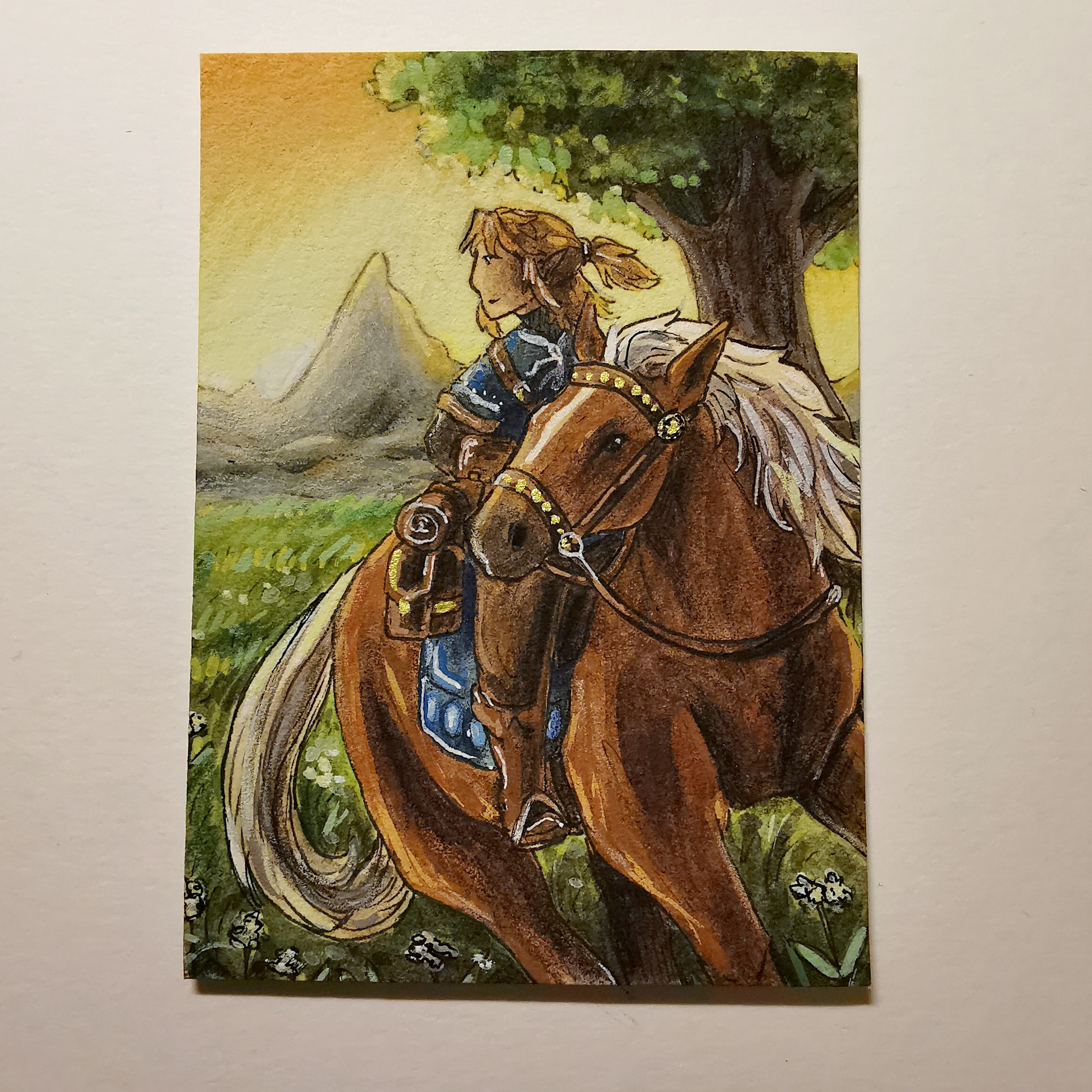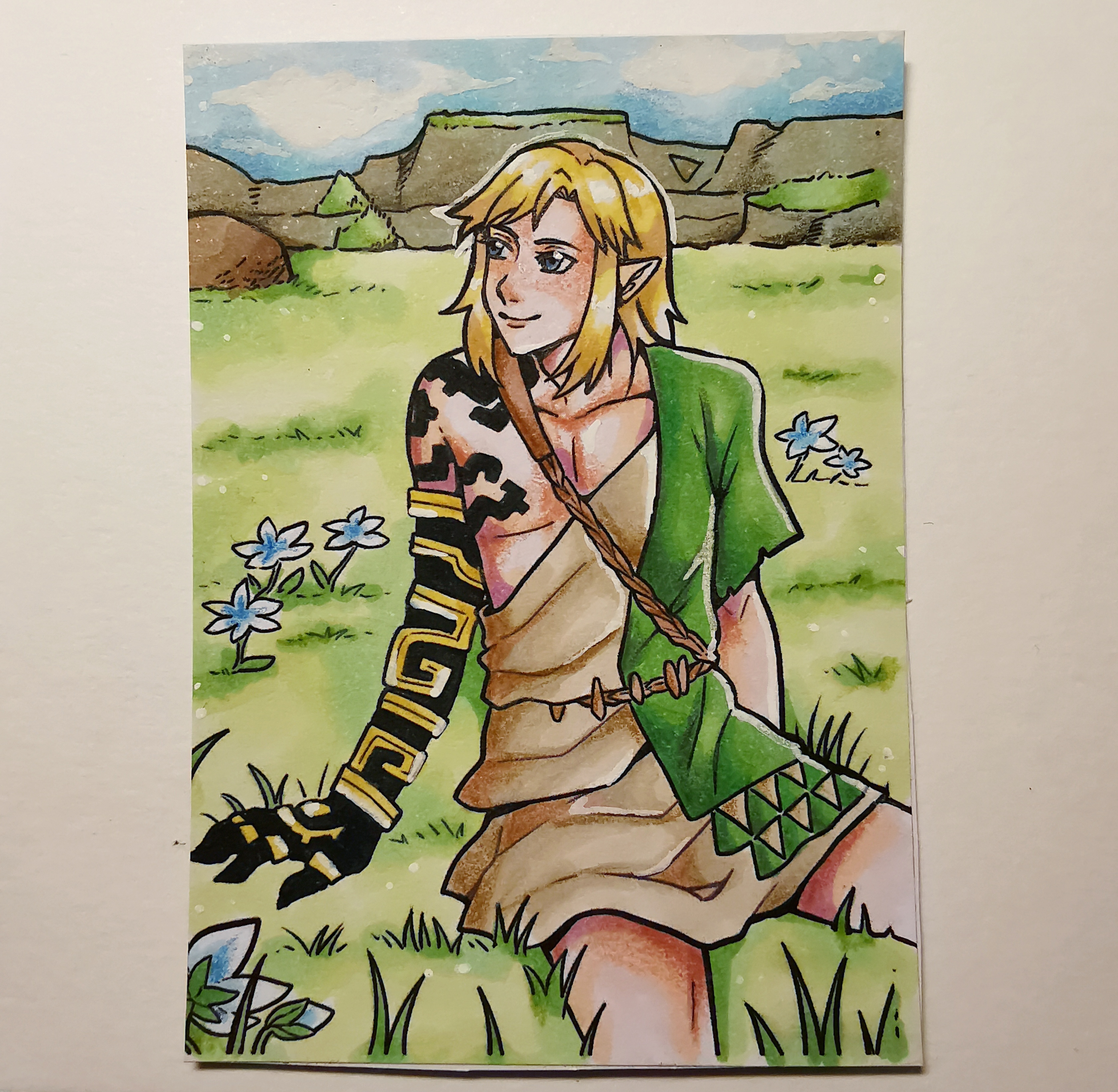 Und bei SuMa gibt es einen starken link… Und ein Wächter im Hintergrund. Die Wächter waren Gegner, die ich anfangs gemieden hatte, aber irgendwann hat man sich dann doch getraut und das Material brauchte man ja auch um die Kleidung hochzustufen etc… Ich finde den Wächter hast du so schön herrlich bedrohlich dargestellt und link schaut richtig hübsch in deinem Stil und sehr entschlossen, sich auf den Kampf einzulassen. Ich mag auch die Türkisen und pinken leuchteffekte an dem Felsen und wie das Türkis sich auf links haut wieder spiegelt. Richtig toll und mega hübsch coloriert.