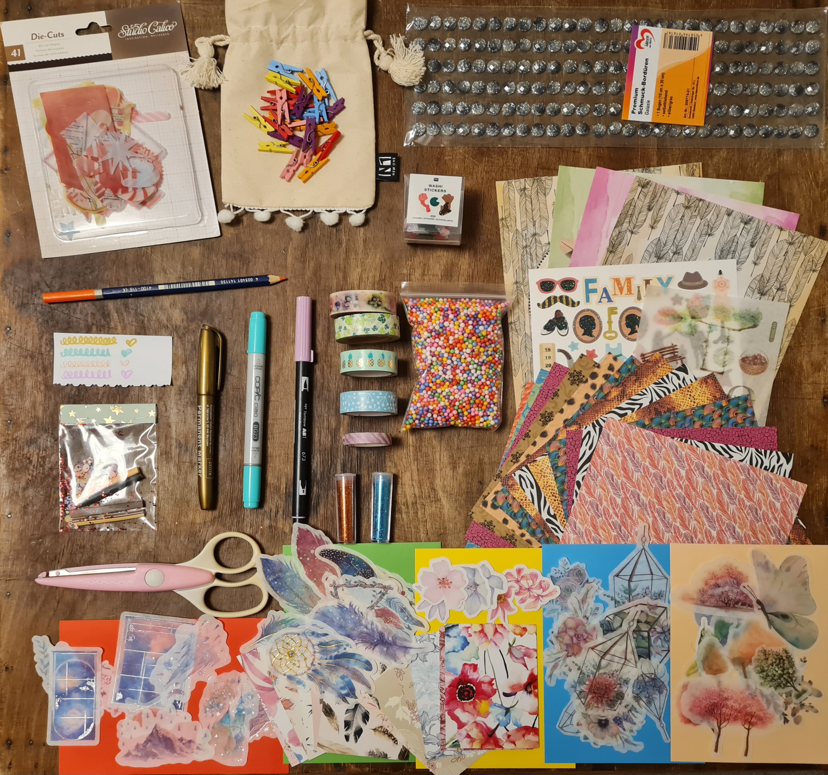 In jedem Kalender würde dann ein Copic mit reinkommen, ein Tombow Stift, ein Aquarellstift, verschiedene Bastelmaterialien (extra in Tüten abgepackt), Stickertüten (ca. 10 Stück pro Tüte je nach Größe), verschiedene Tapes, Stickerbogen (ganze Stickerbögen werden nicht zerschnitten und bleiben ganz), Motivpapier usw. dazu bekommt ihr noch 25 kleine Klammern zum Aufhängen (Bild unten)