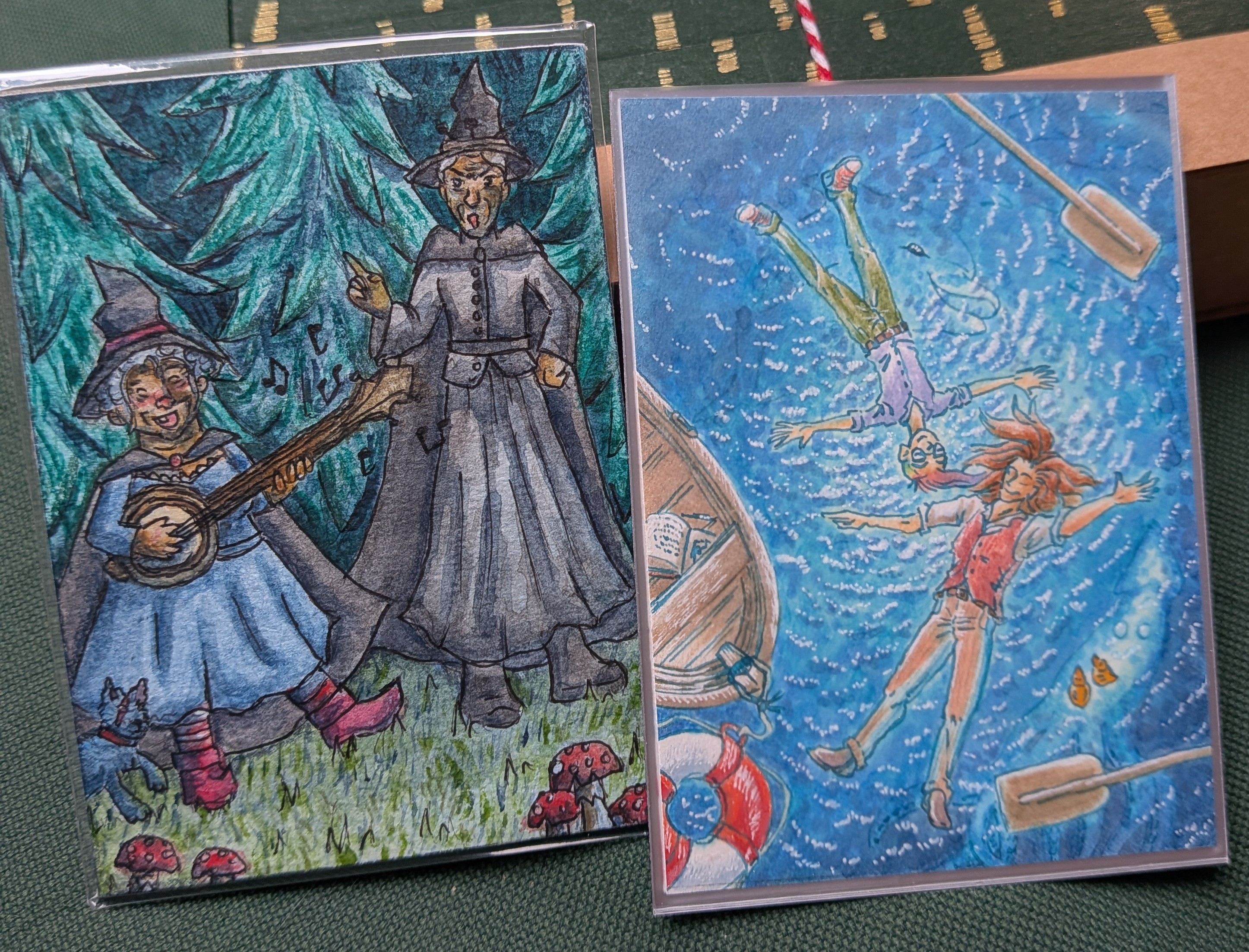 Auf der einen Karte sehen wir eine singende Nanny Ogg, Greebo, der ihr um die Beine schleicht und Oma Wetterwachs, die Nanny zurecht weißt, sie soll nicht so versautes Zeug singen. Passend dazu heißt die Karte “Das Igellied”