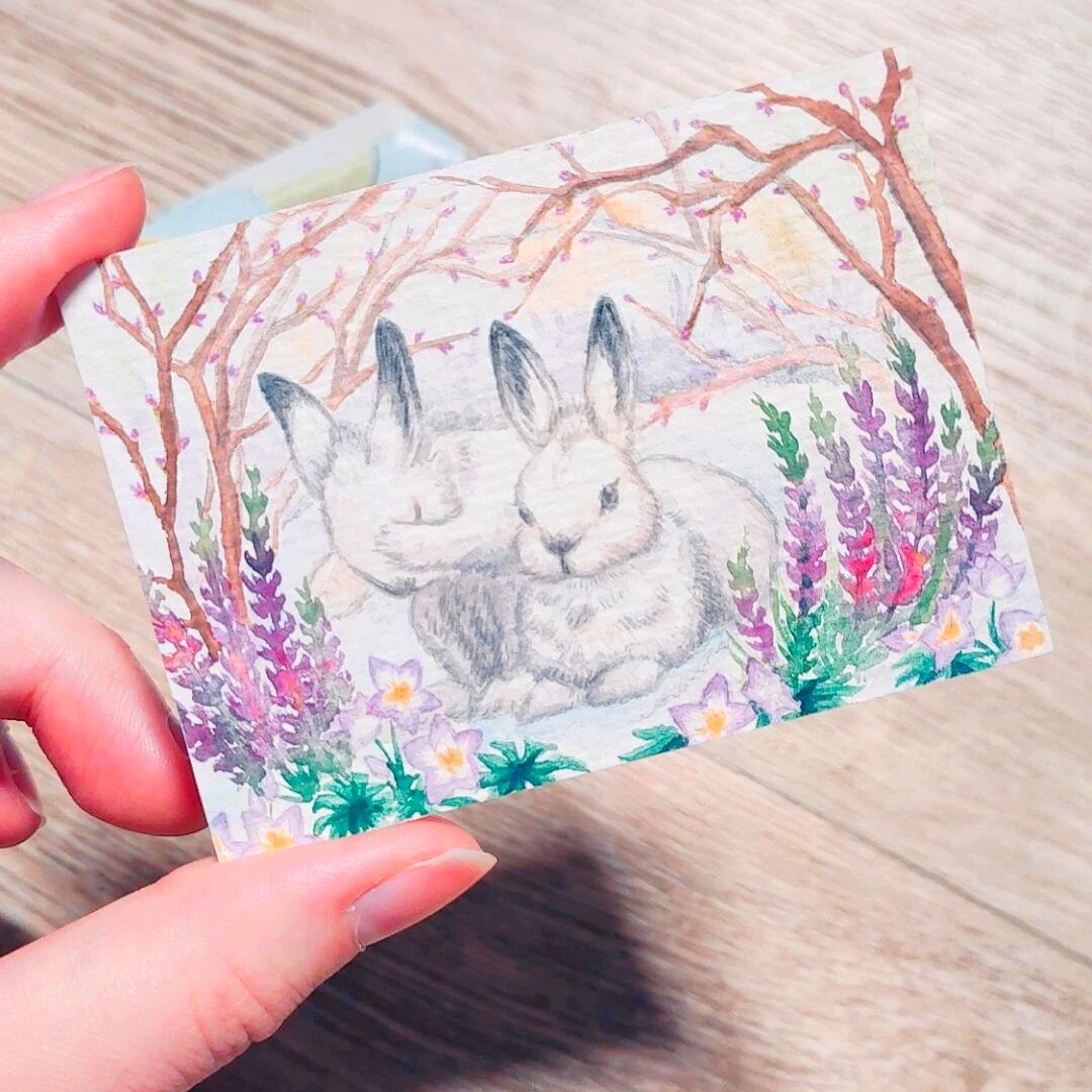 Die Farbgebung ist so sanft, die Hasis wirken so süß und die Blümchen und die Äste bilden sooo einen hübschen Rahmen um die Hasis, einfach der Wahnsinn. So eine hübsche Winte-r/Frühlingszene, einfach WoW