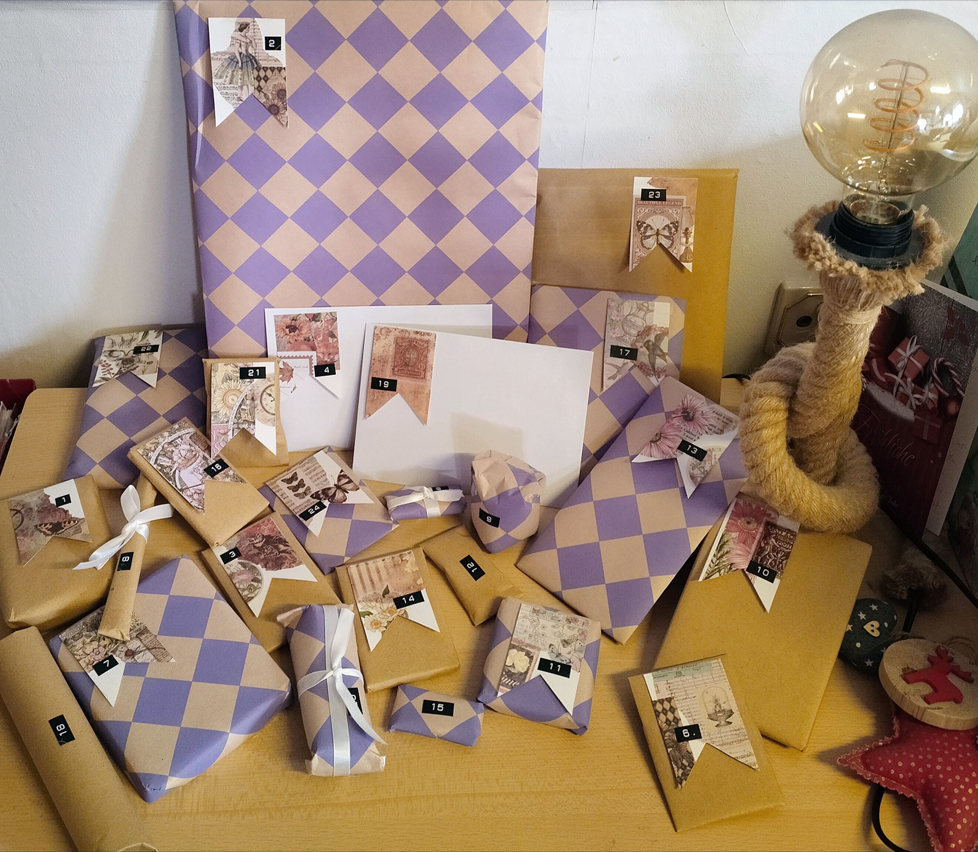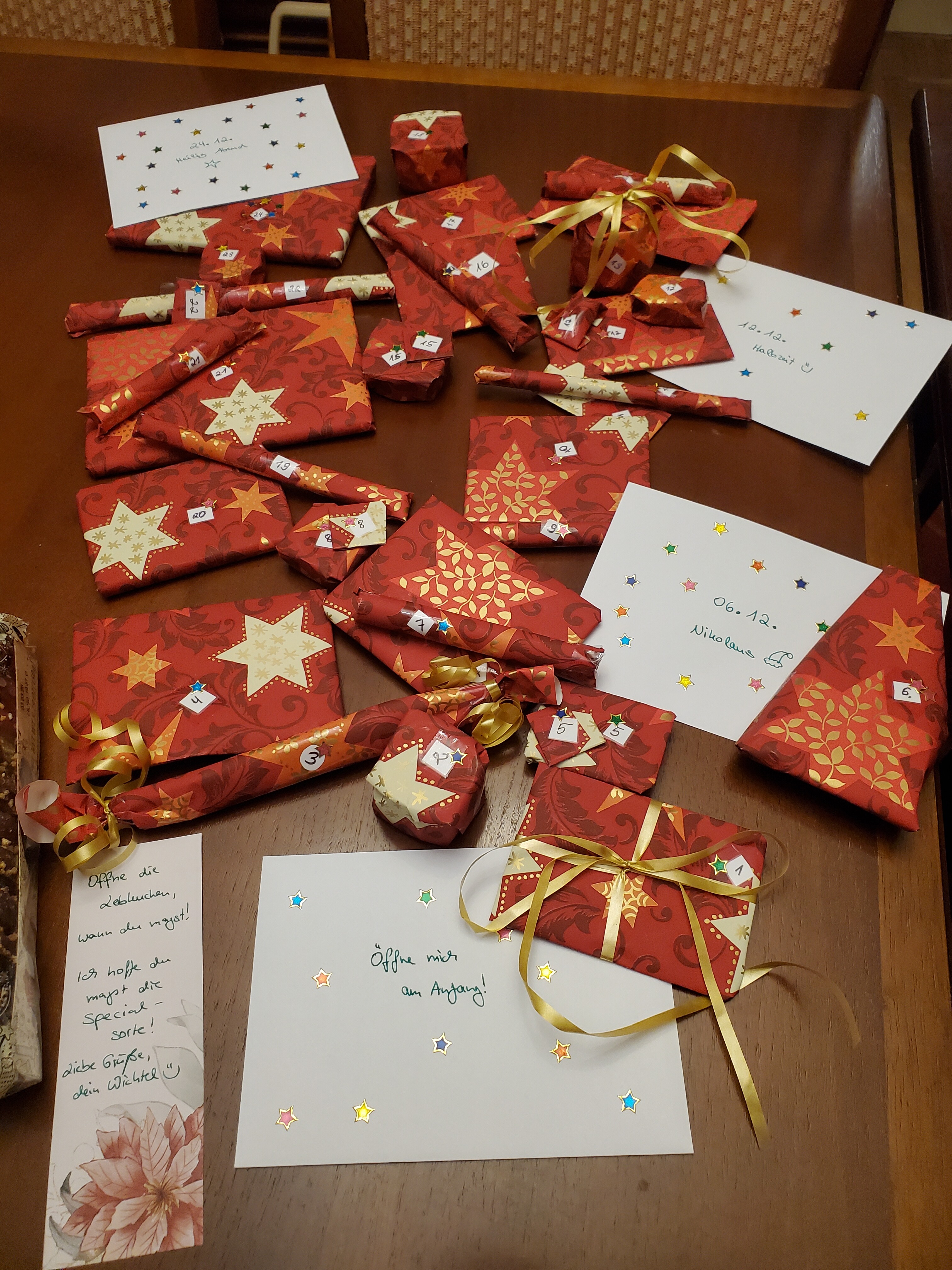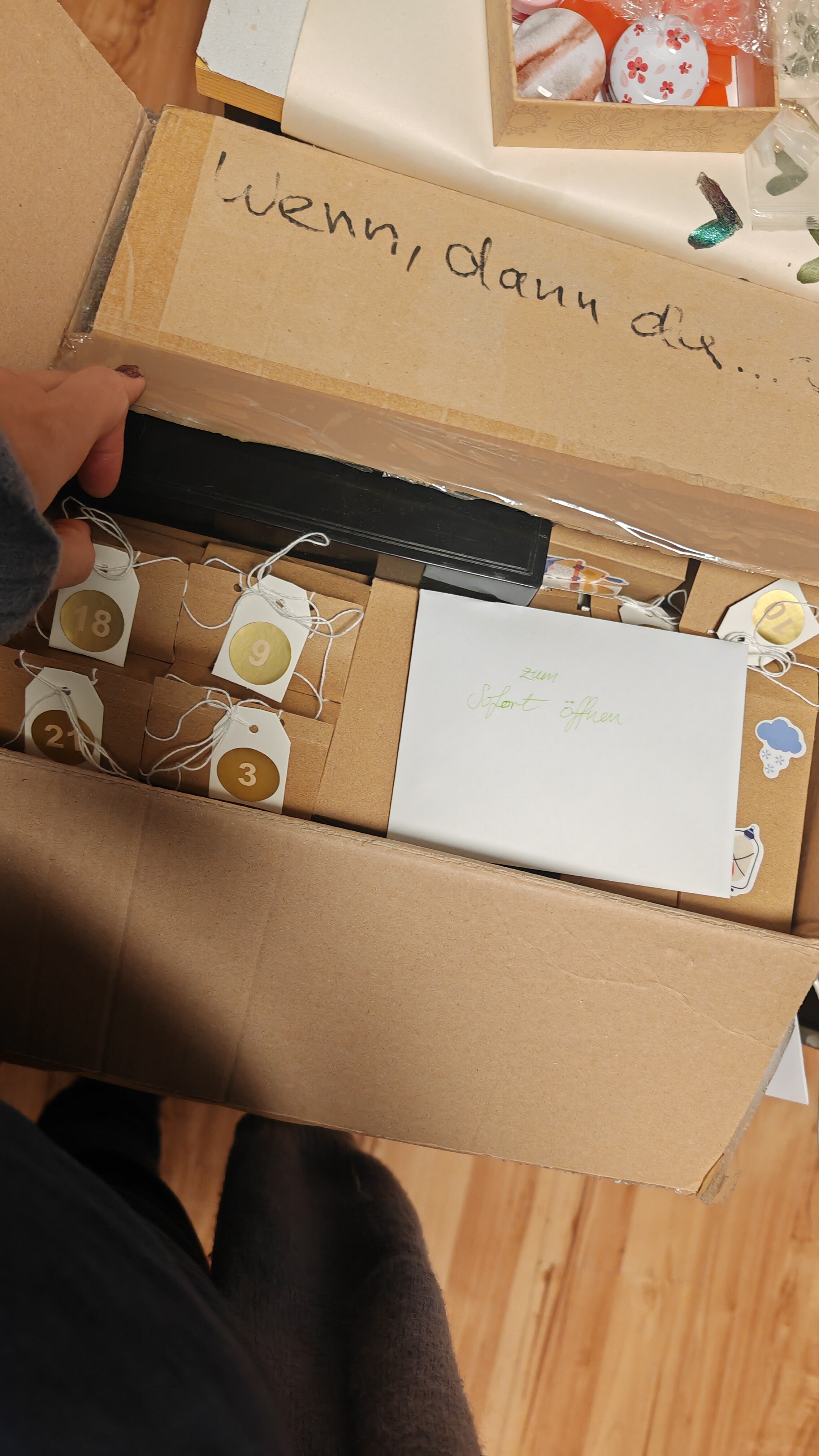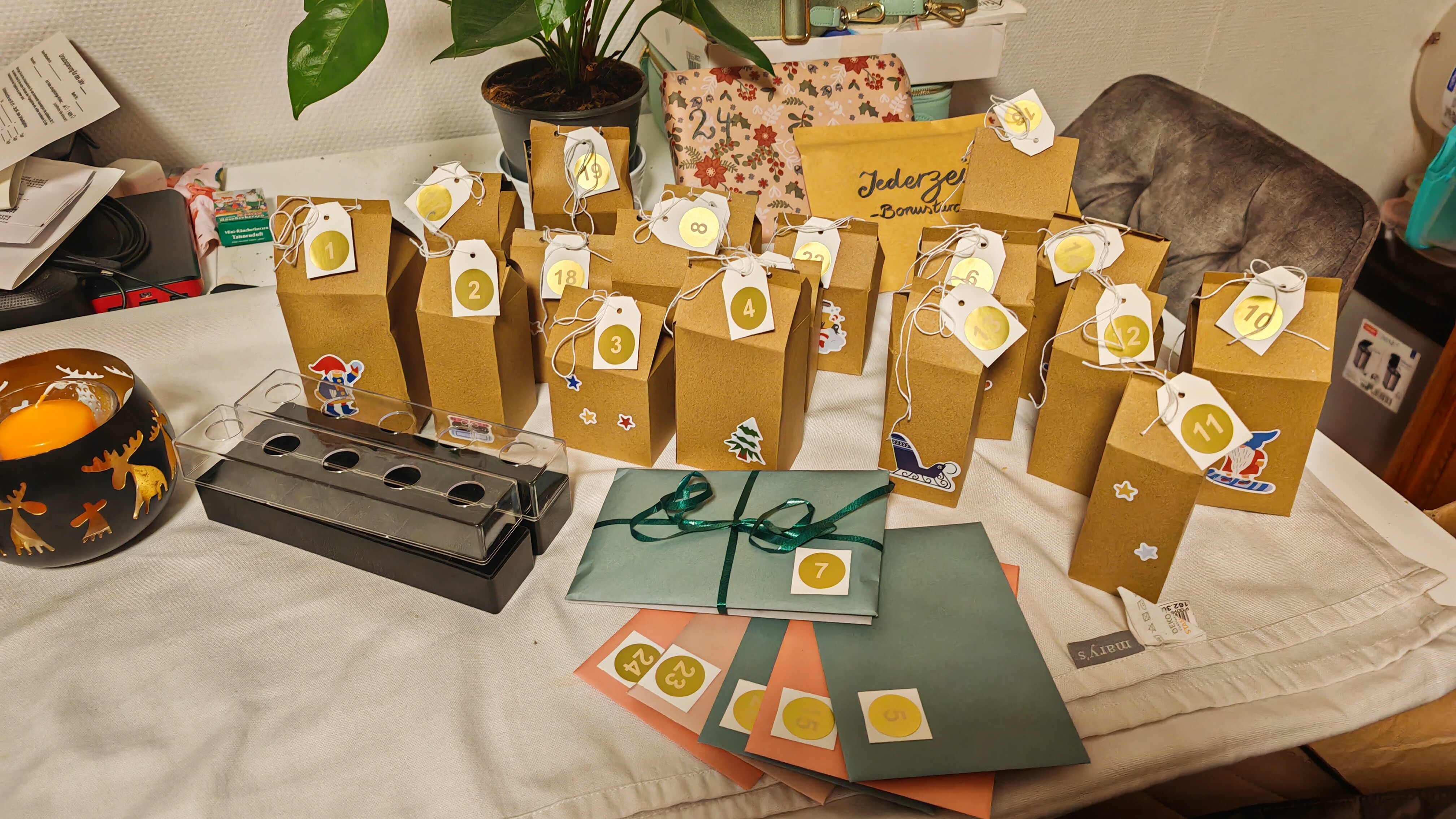 Der Kalender für mein Wichtelkind ist auch unterwegs und ich hab das Paket mit meinem auch schon erhalten. Bevor ich auspacken kann, muss ich aber erstmal noch aufräumen. Hier herrscht noch vom packen Chaos und auch schon von den Weihnachtsgeschenk-Vorbereitungen für Freunde und Familie xD