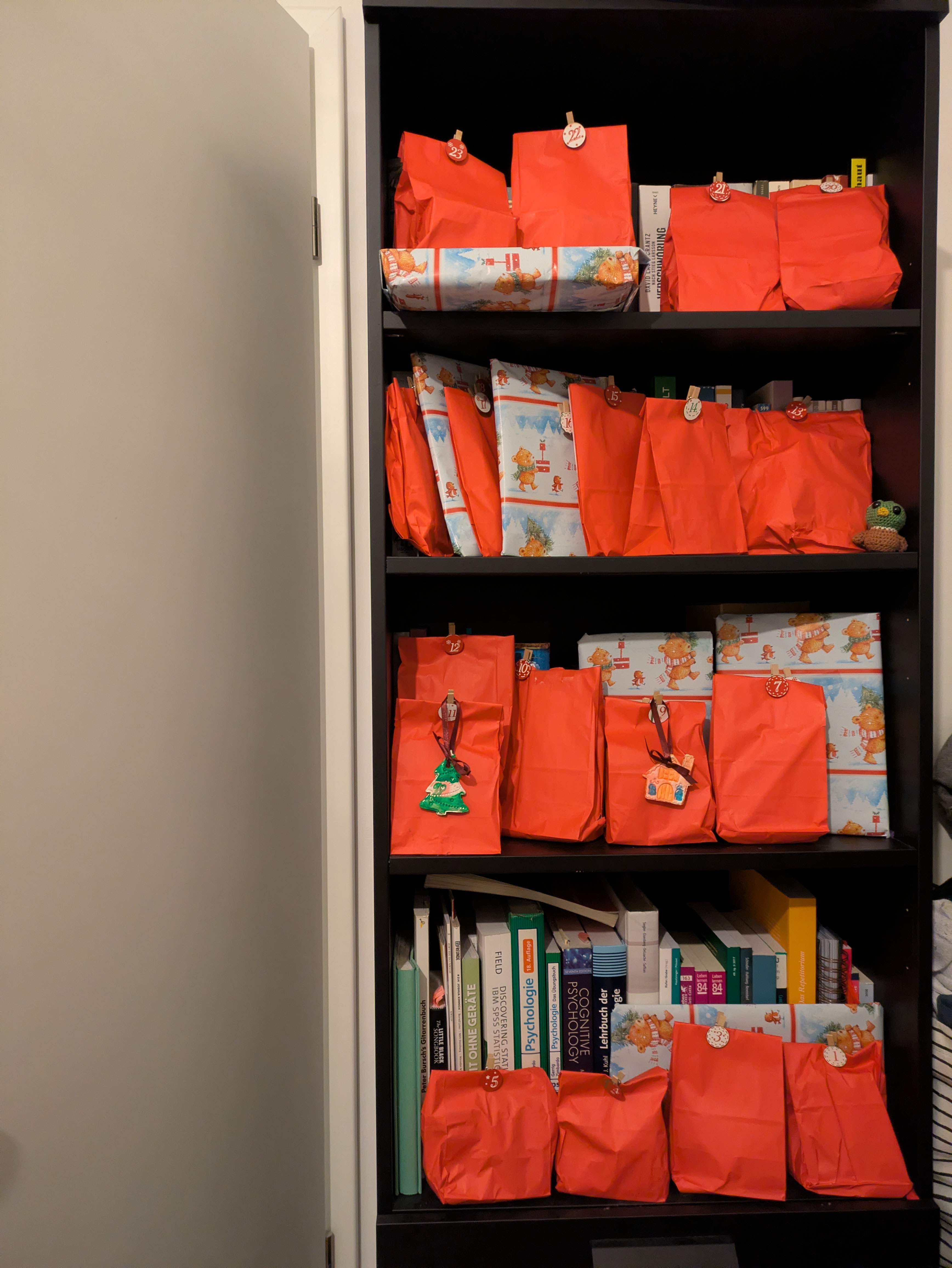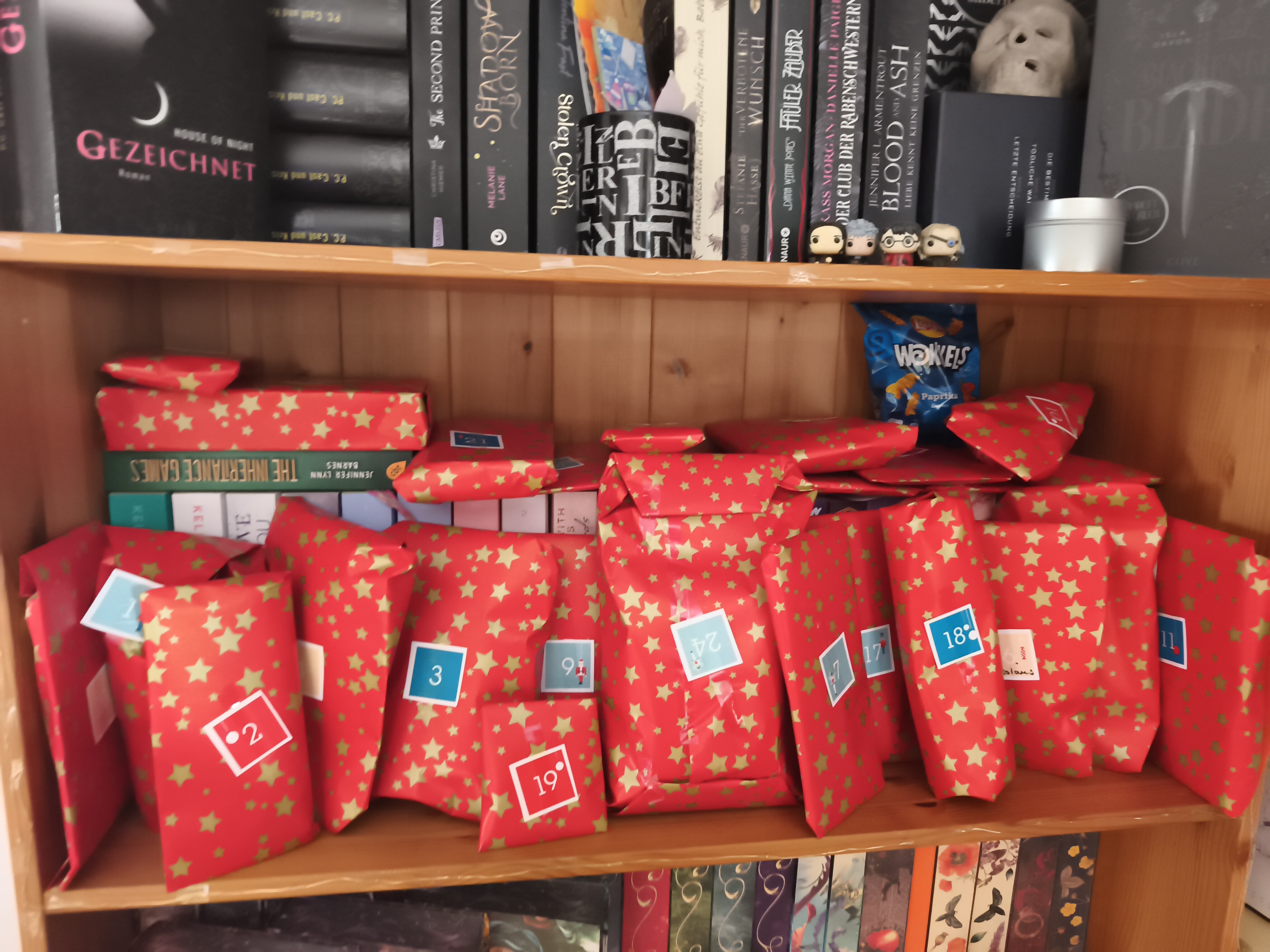 Hier ist mein einfacher Kalender, der riesig ist o.o Er nimmt tatsächlich unser gesamtes Bücherregal ein. (Die Bücher mit denen man etwas komisch wirken würde werden unten zum Glück verdeckt :D) Vielen lieben Dank an meinen Wichtel, der sich auch gleich geouted hat, ich werde aber damit andere noch raten können das erstmal geheim halten ;)