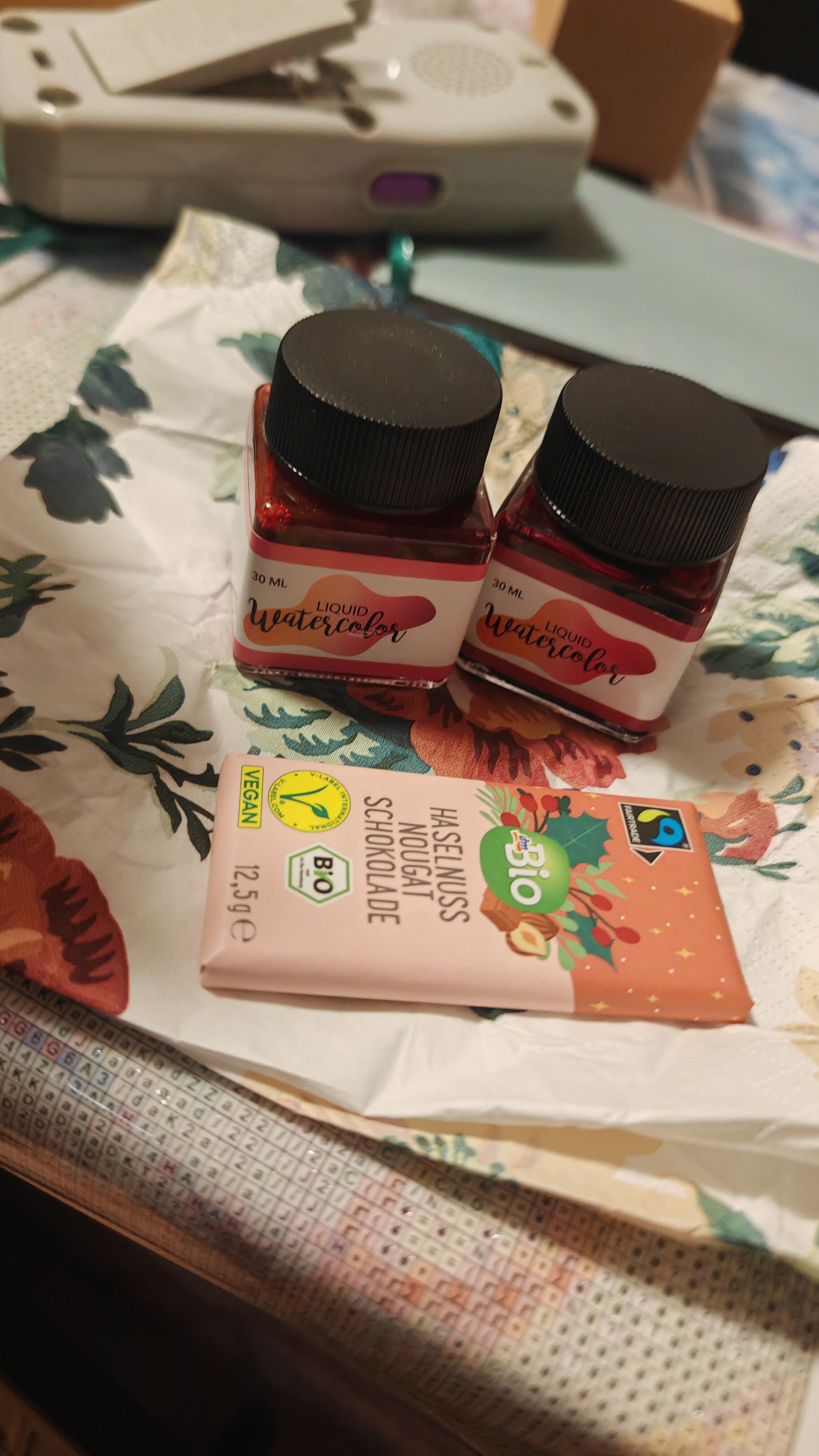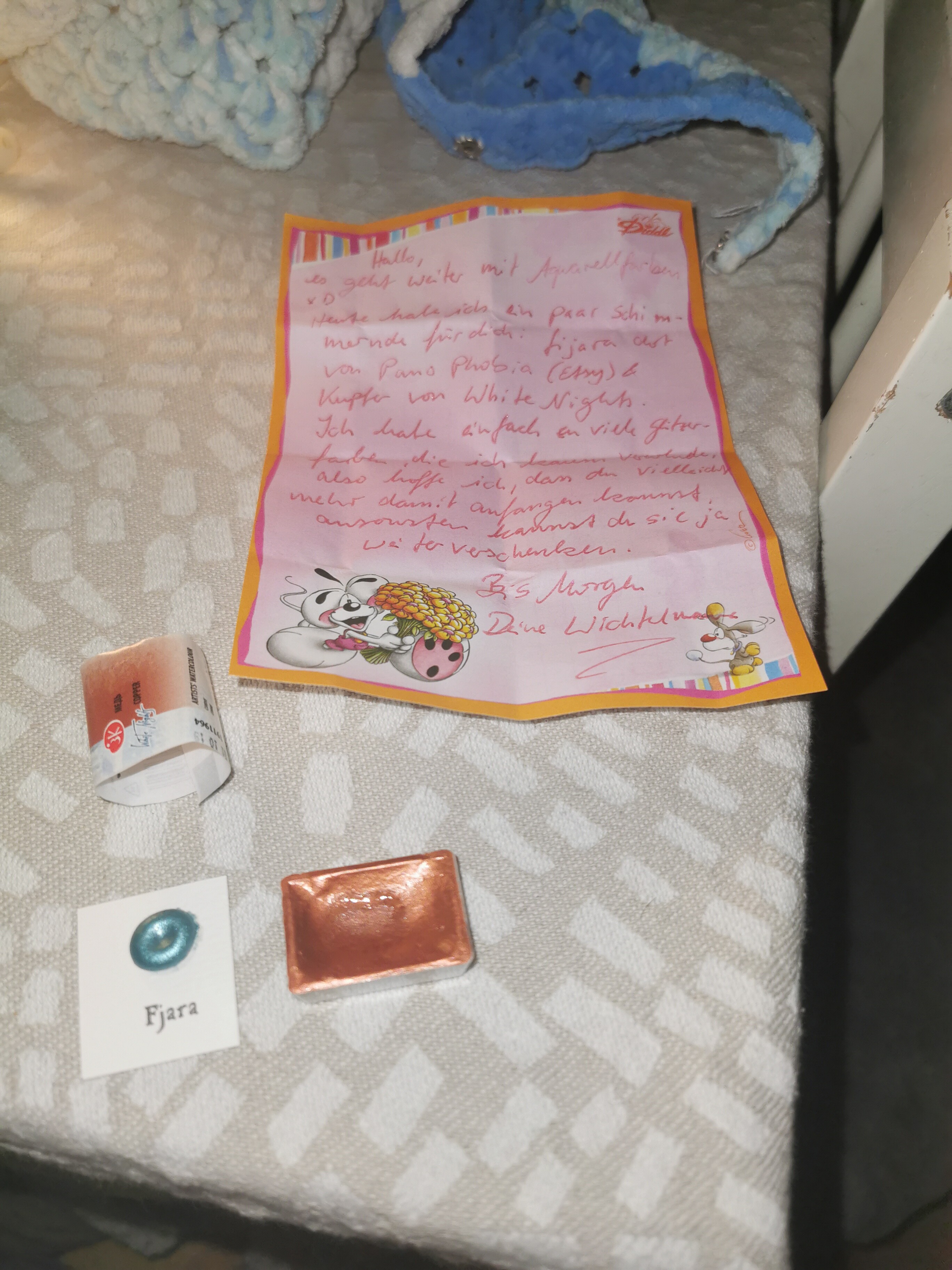 Heute gab es gleich 3 Aquarellfarben für mich, einmal Gletscher schwarz und Galaxy rosa von Schmincke und vermilion irise von sennelier. Die habe ich tatsächlich alle drei noch nicht, ich freue mich aufs swatchen! Ganz vielen Dank :3