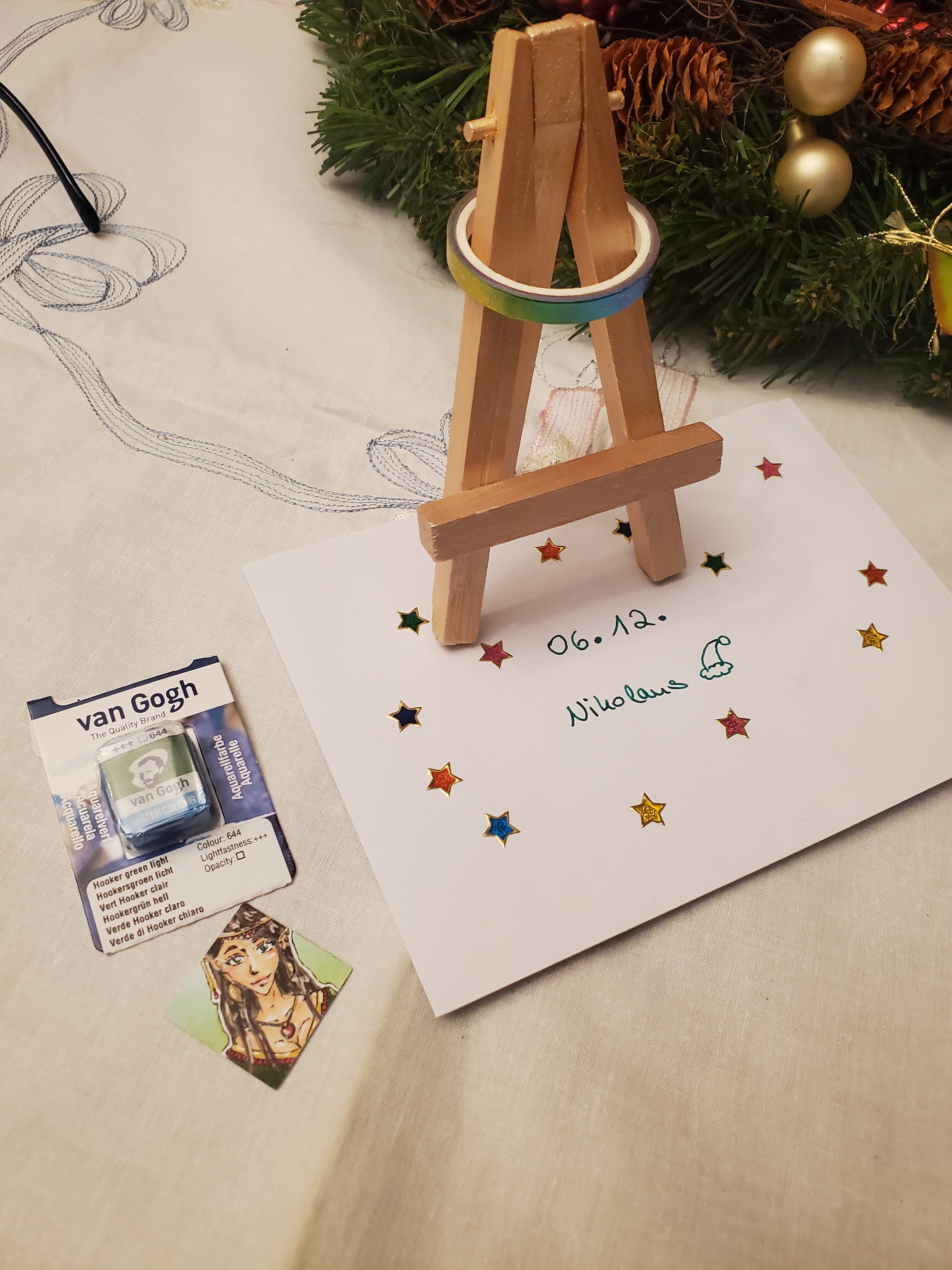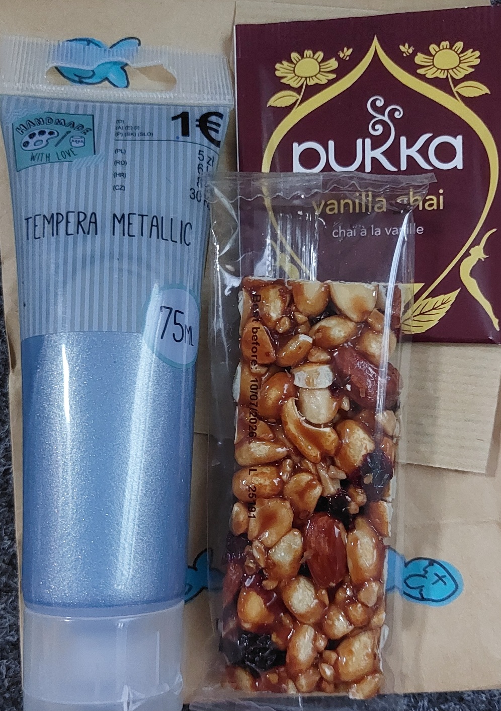 An Nikolaus habe ich eine Tube metallic Tempera Farbe von Tedi bekommen, dazu einen Tee und einen Nussriegel.