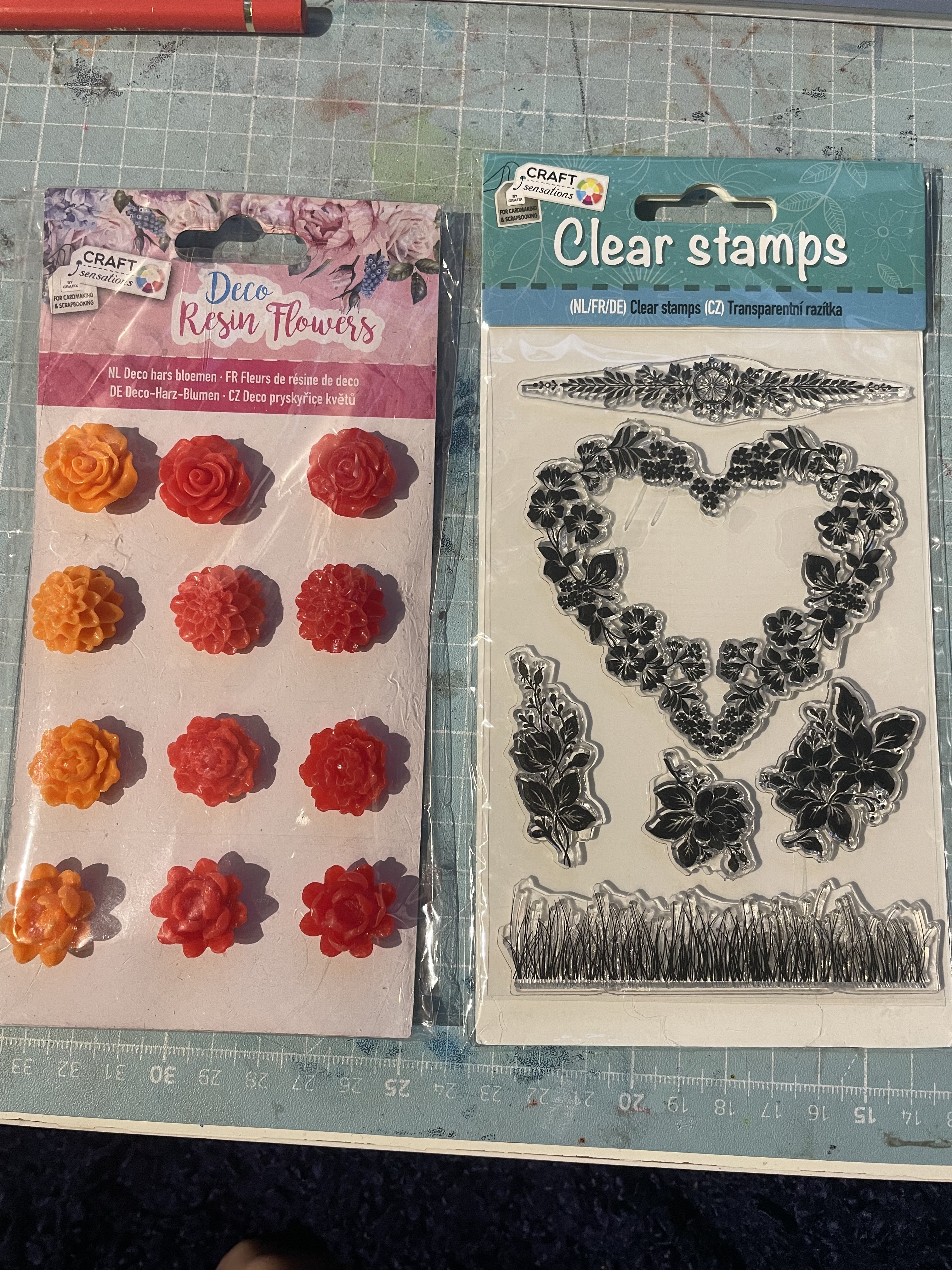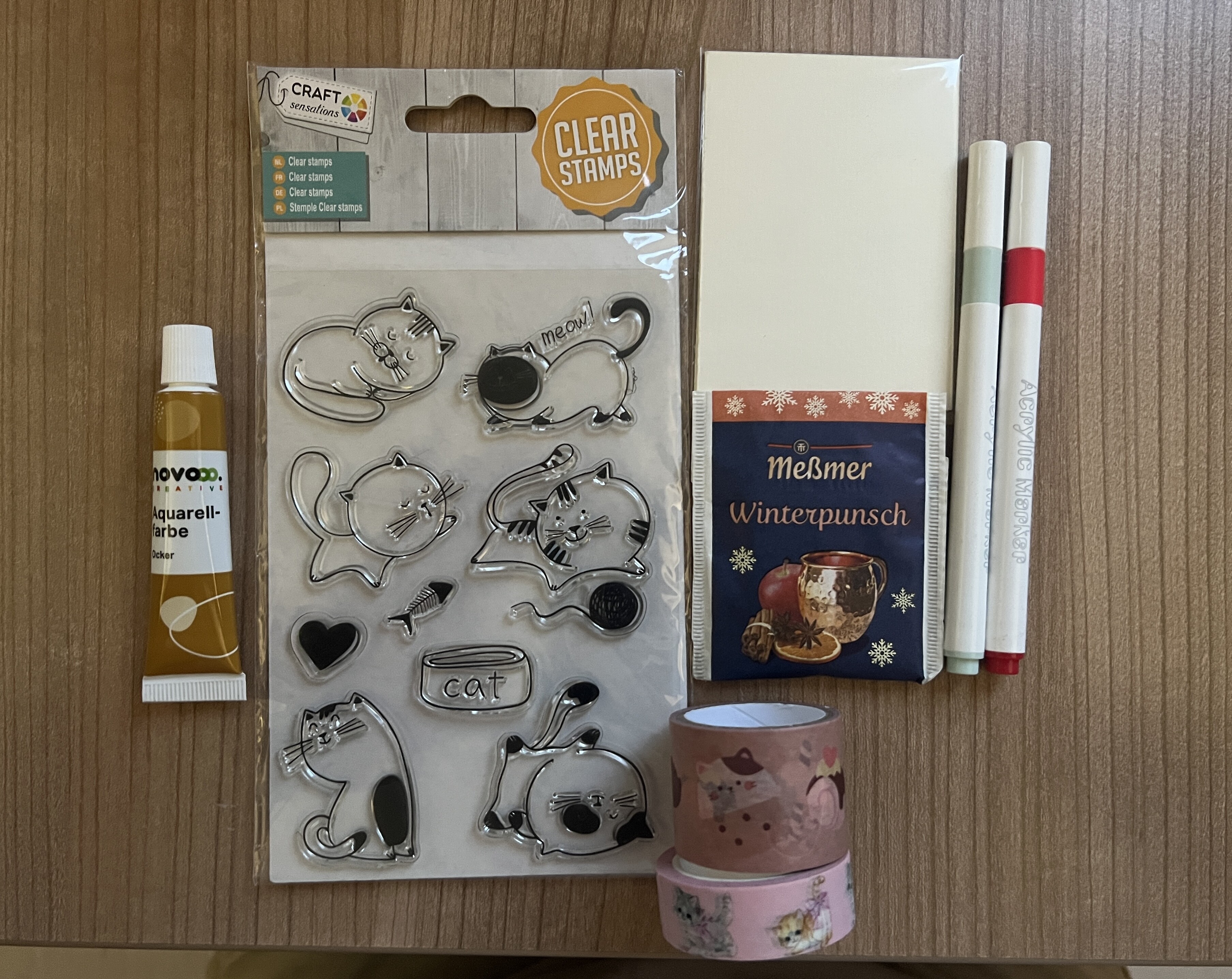 Gestern gab es dann ein paar sehr süße Stempel, zwei Acrylmarker, eine Aquarellfarbe, zwei Washi-Tapes und ein paar Bögchen mit unbekannten Papier, das schon auf Kakao Format zugeschnitten ist :)
