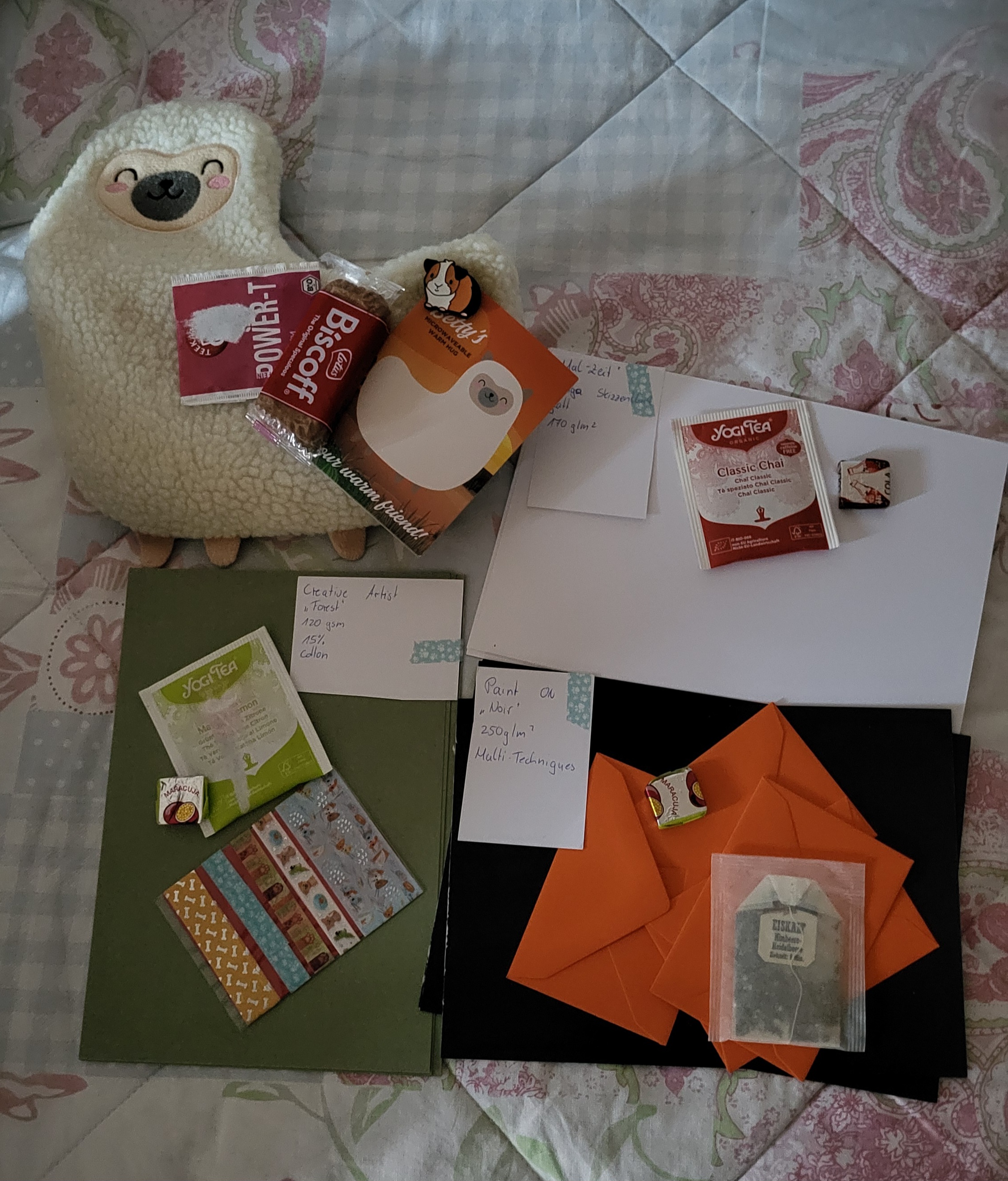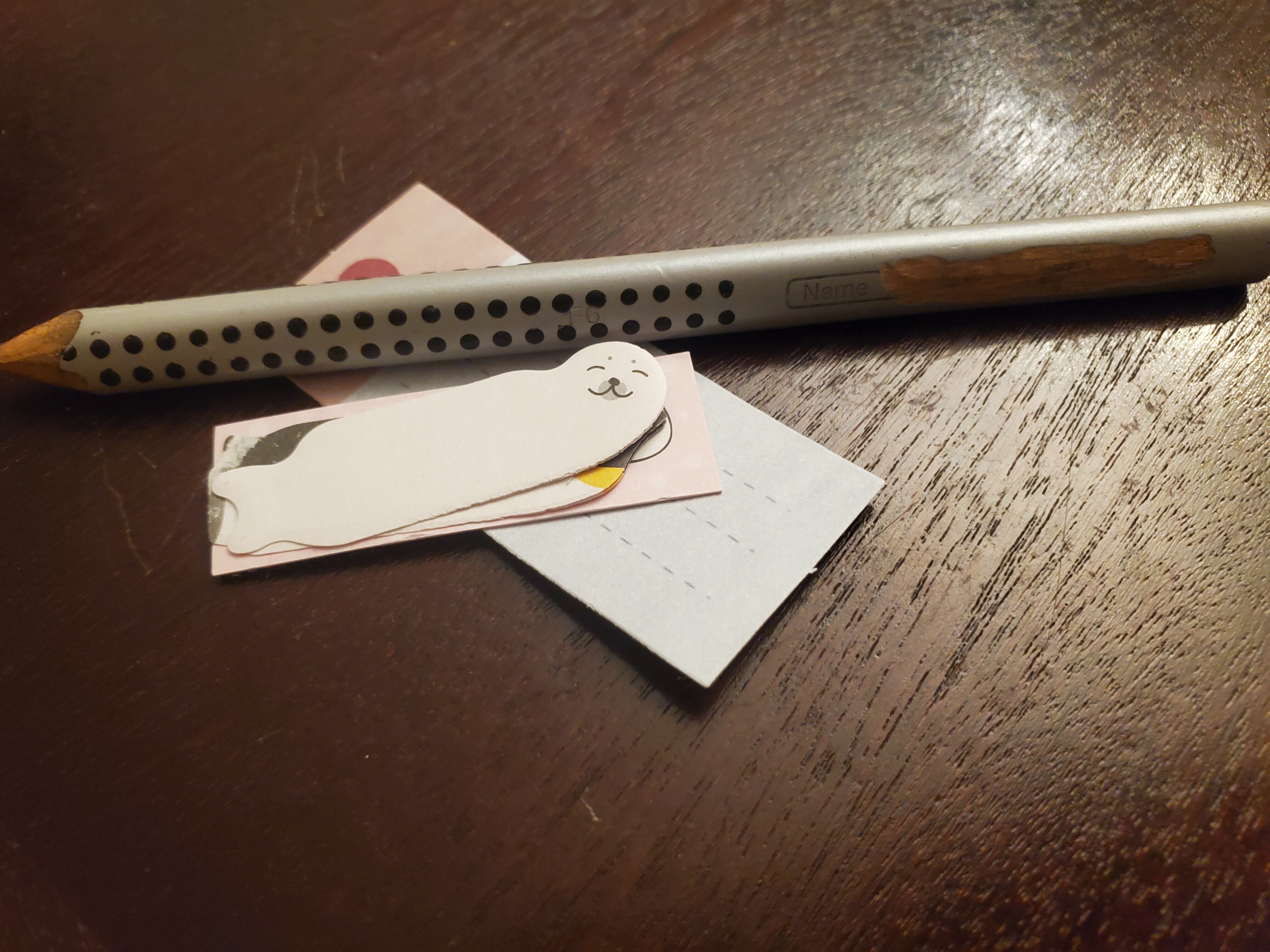 Und heute gab es dann noch mehr Papier (diesmal mit BEschriftung), einen Acrylmarker, eine Aquarellfarbe, einen Knetradiergummi (den ich echt gut gebrauchen konnte!) und eine Packung super süßer Sticker, die selbst gemacht aussehen :)