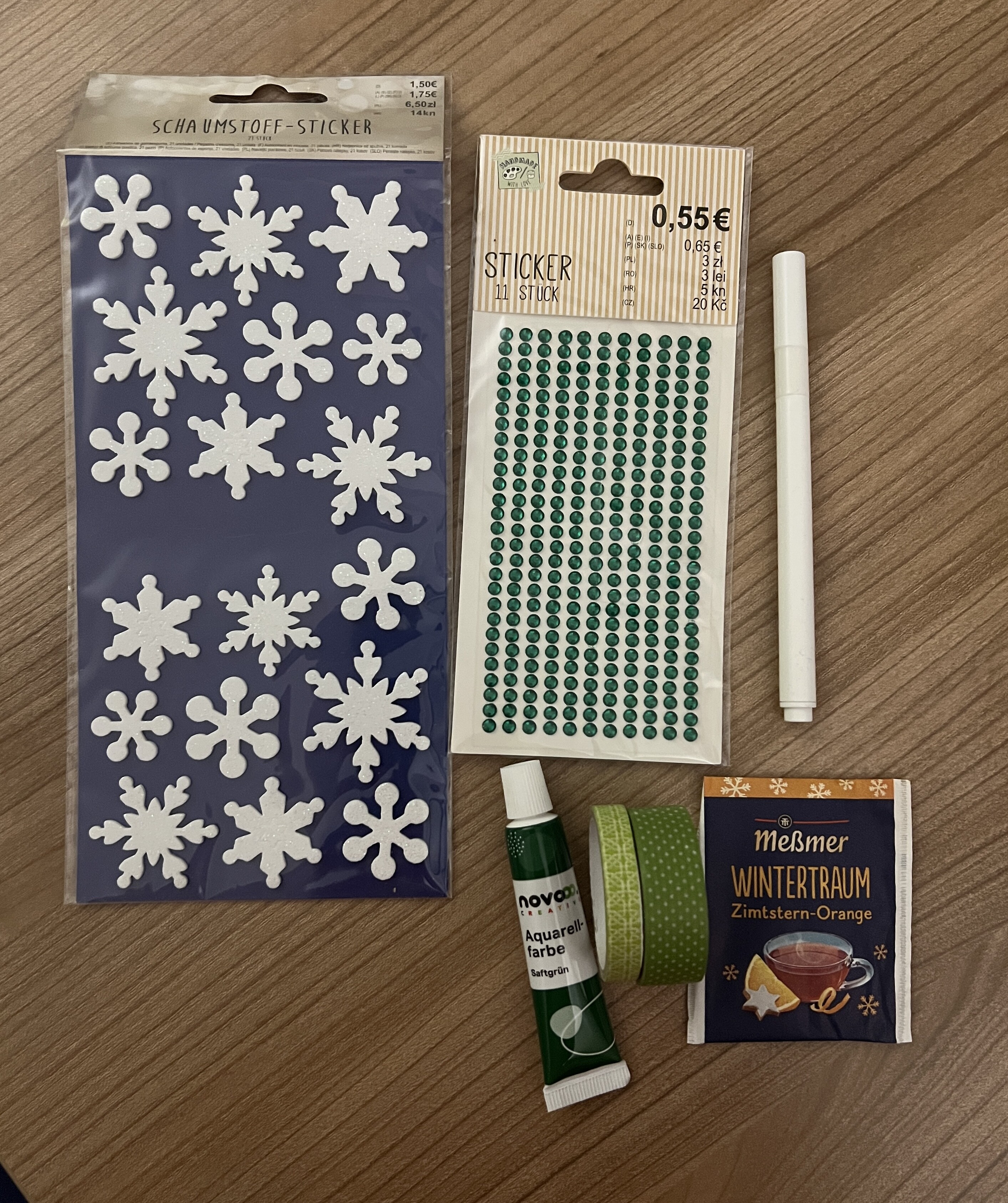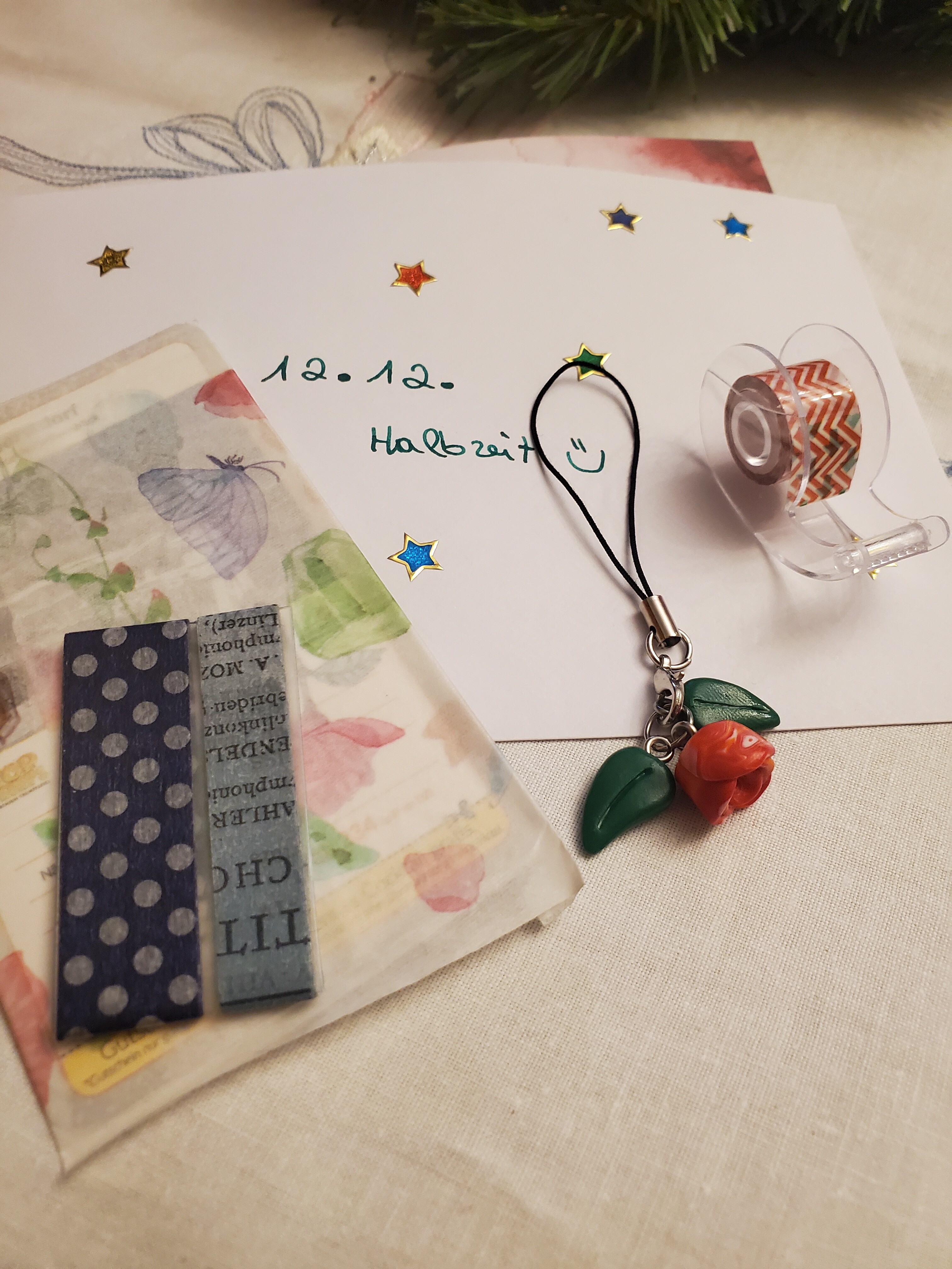 Am 8. Dezember gab es zwei mal Sticker Bögen, zwei Washi-Tapes, eine Aquarellfarbe, einen Acrylmarker und einen leckeren Tee :)