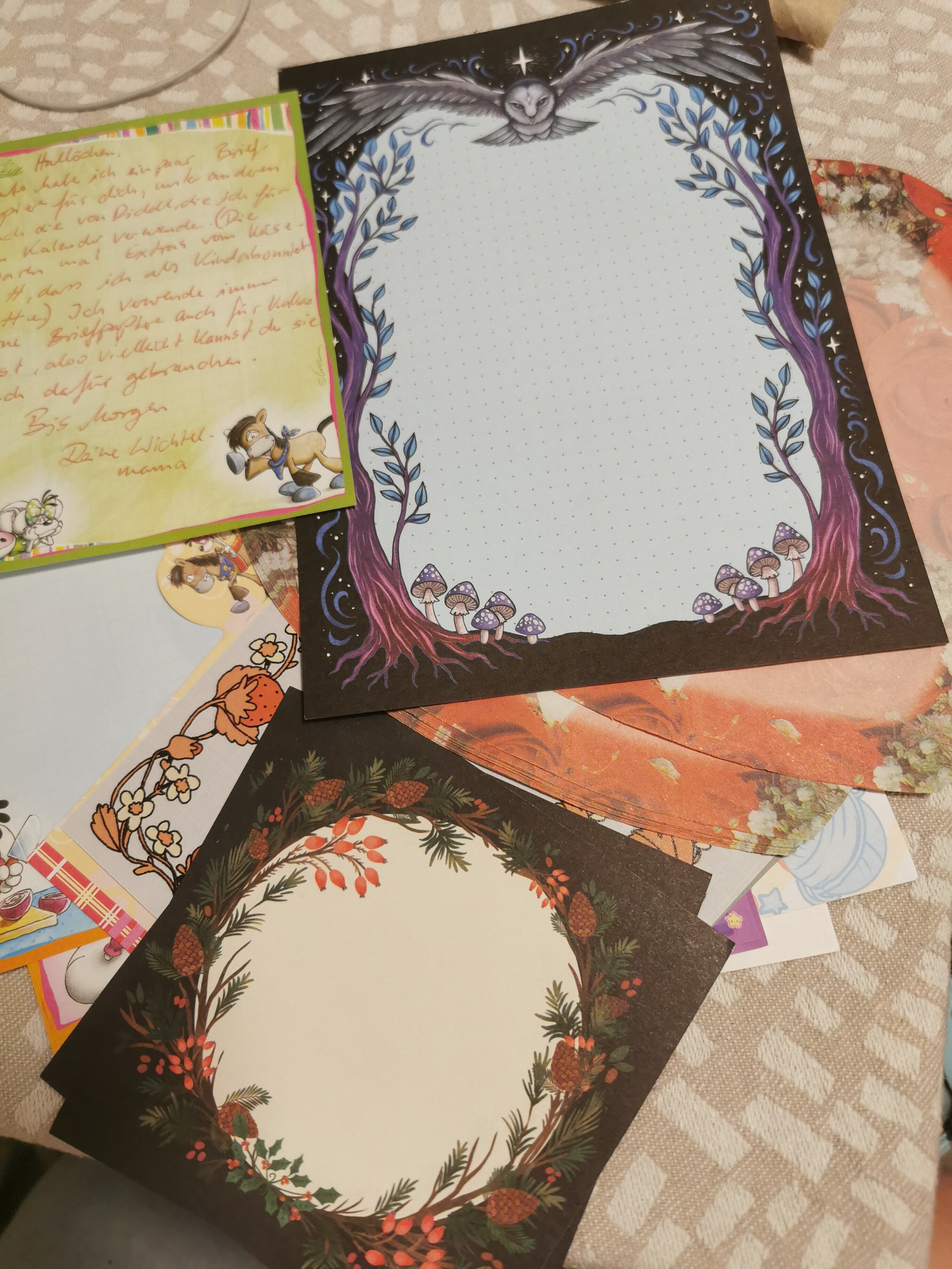 Ic hänge ein bisschen arg hinterher. Also mal eben Türchen 3-8. Es gab für mich viele spannende Papierproben, kleine Briefumschläge, ein Wärme Alpaka, ein Meerie Pin, coole Blöckchenseiten und Naschzeug und Tee, Schüttelmaterial und einen KK Slider Anhänger (und ich hoffe ich hab gerade nix vergessen)