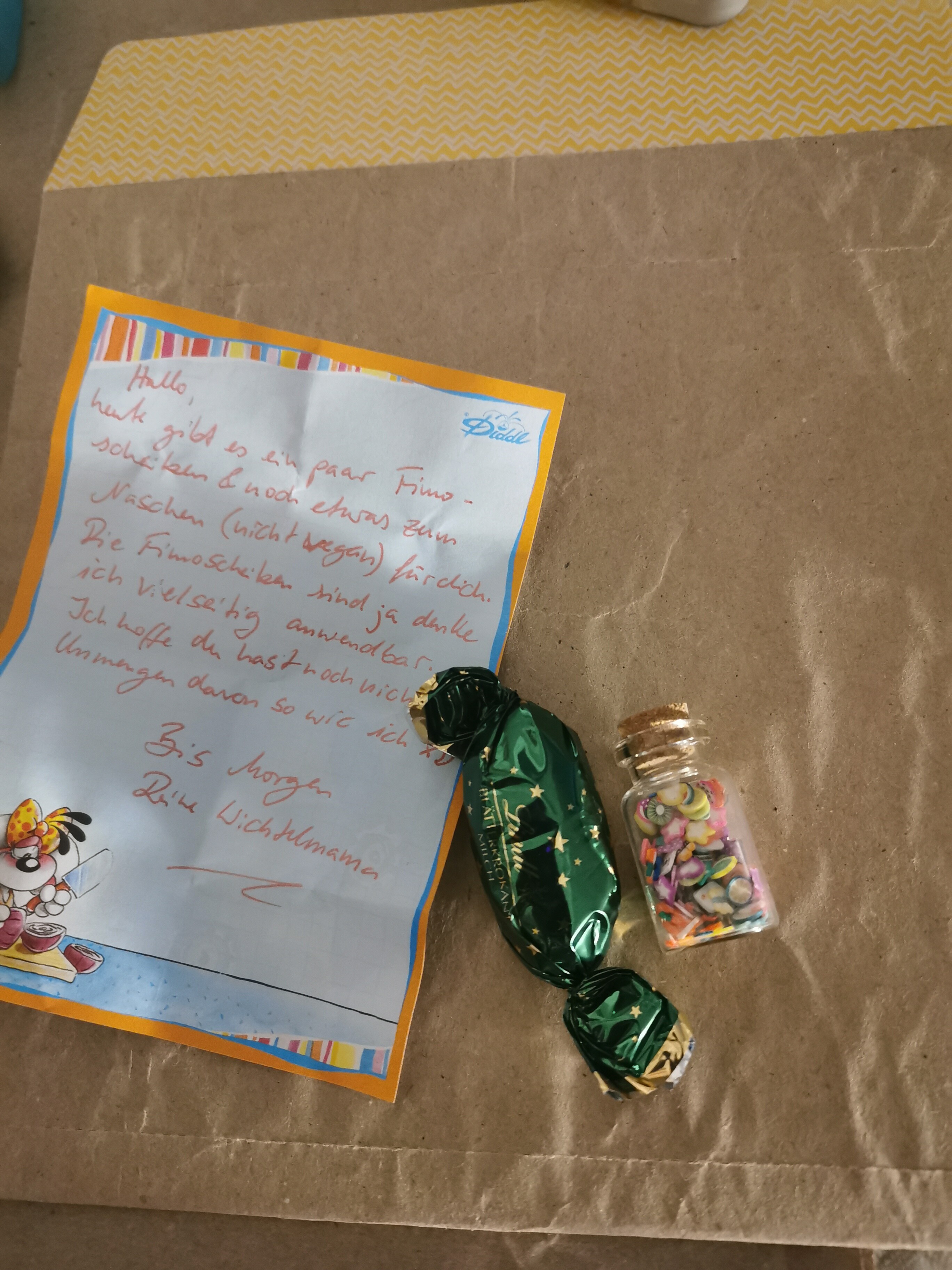 ), sowie einen Brief.Liebe Wichtelmama, ich hinke diesmal auch mit der Weihnachtsvorfreude hinterher, habe aber gestern endlich angefangen Plätzchen zu backen.