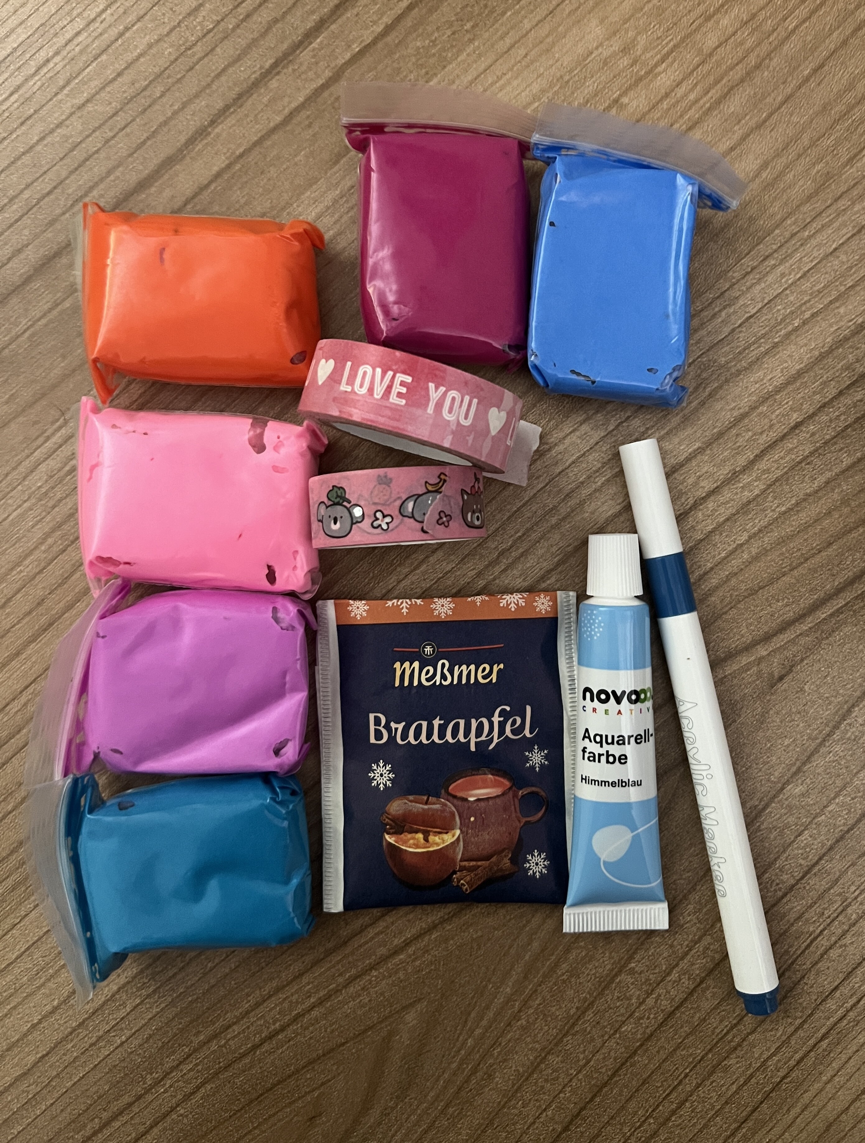 Am 4. Dezember gab es einige Packung an einer Knetmasse, wir planen schon lauter kleine Projekte damit :) Dann gab es noch einen Acrylmarker, zwei Washi-Tapes, eine Aquarellfarbe und einen leckeren Tee :)