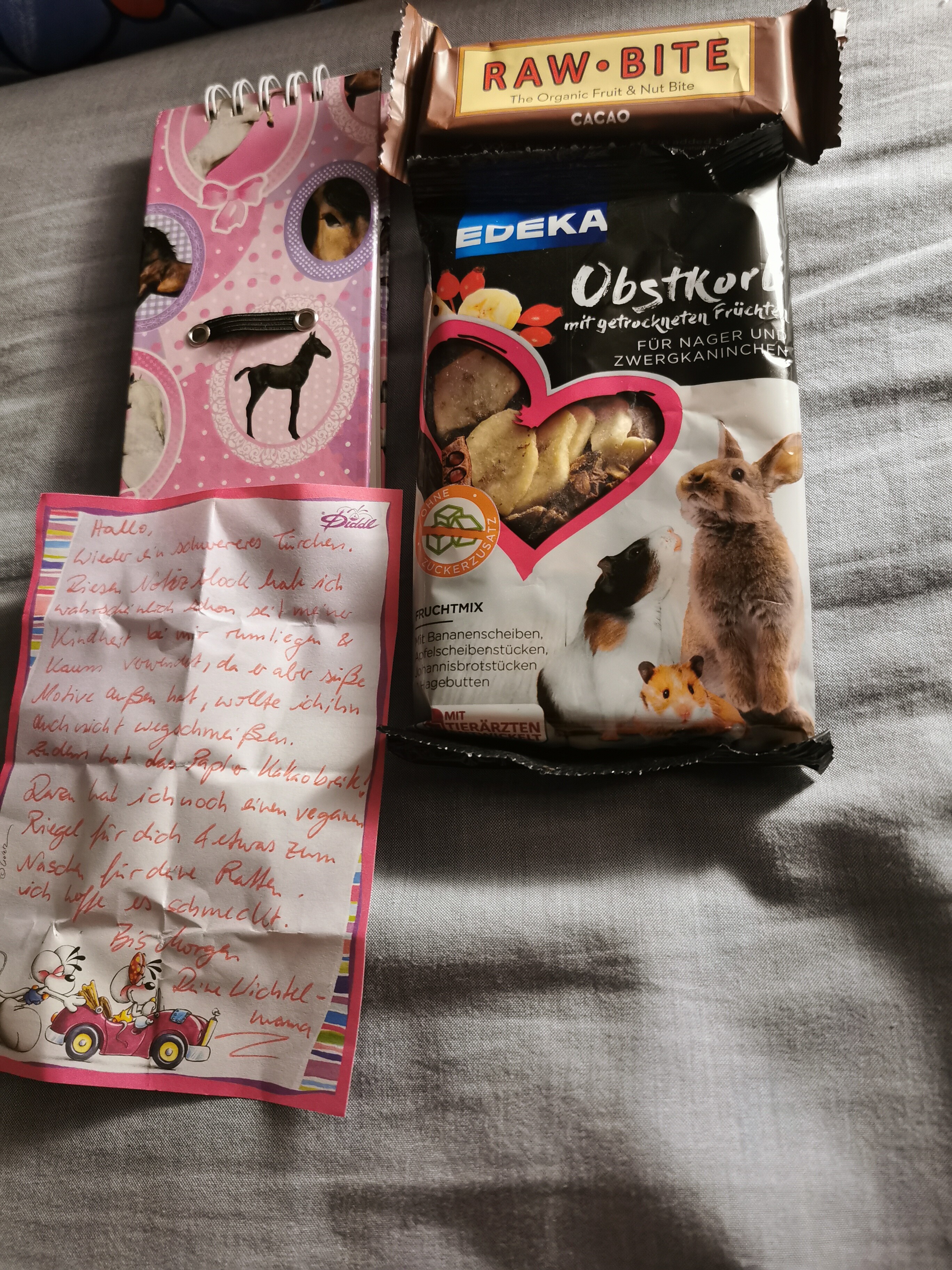 Und heute gab es Snacks für meine Ratten, ein Riegel für mich und einen Notizblock, der Kakaobreite hat. Den werde ich sicher für Skizzen nutzen.
