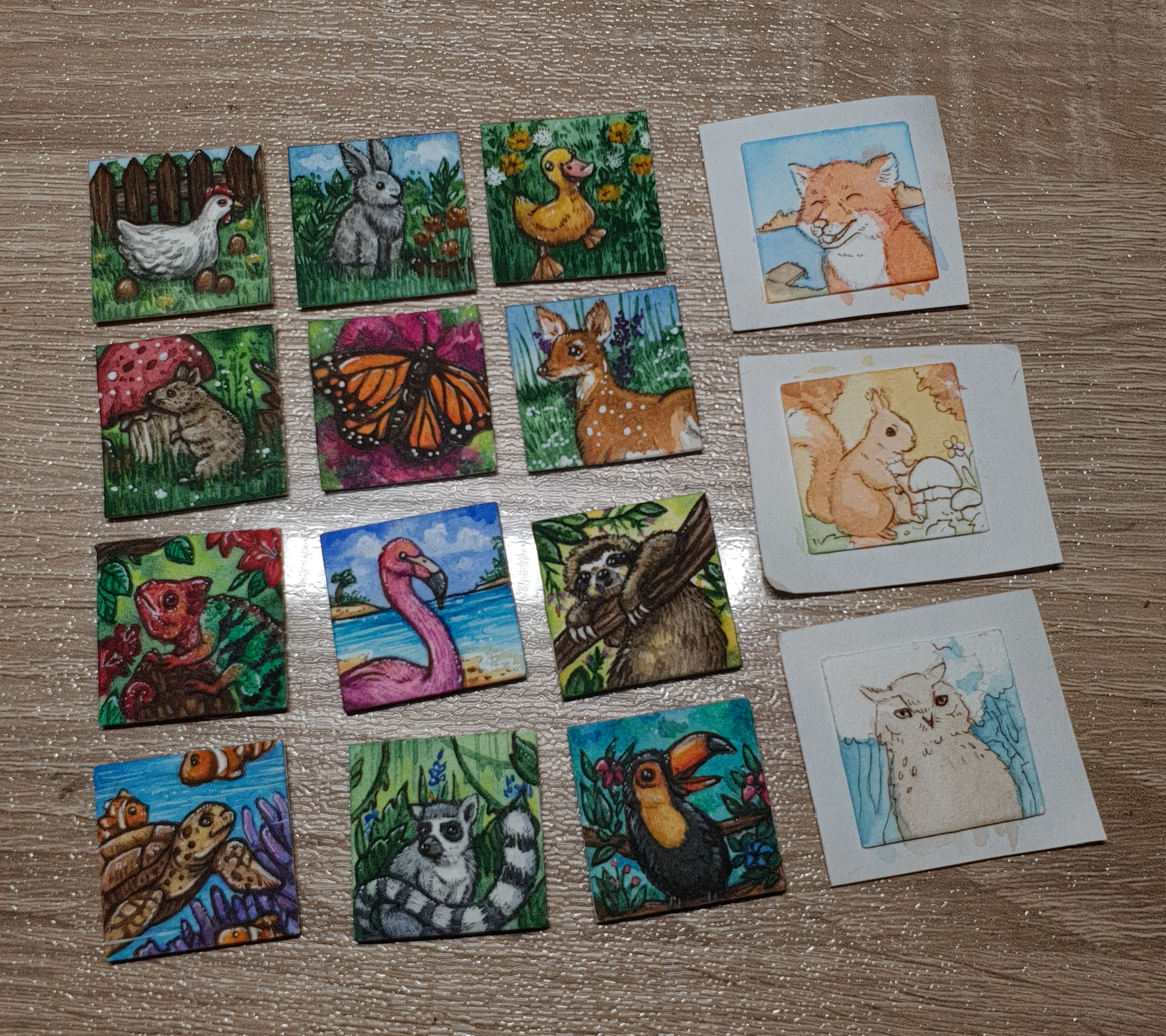 Mittlerweile 6 fertig, bei 12 ist der Aquarell-Schritt fertig (fehlen also nur noch Licht und Details mit Gouache) und die restlichen 6 sind in verschiedenen Aquarell-Stadien. Mit etwas Glück werden die sogar dieses Wochenende noch fertig :D