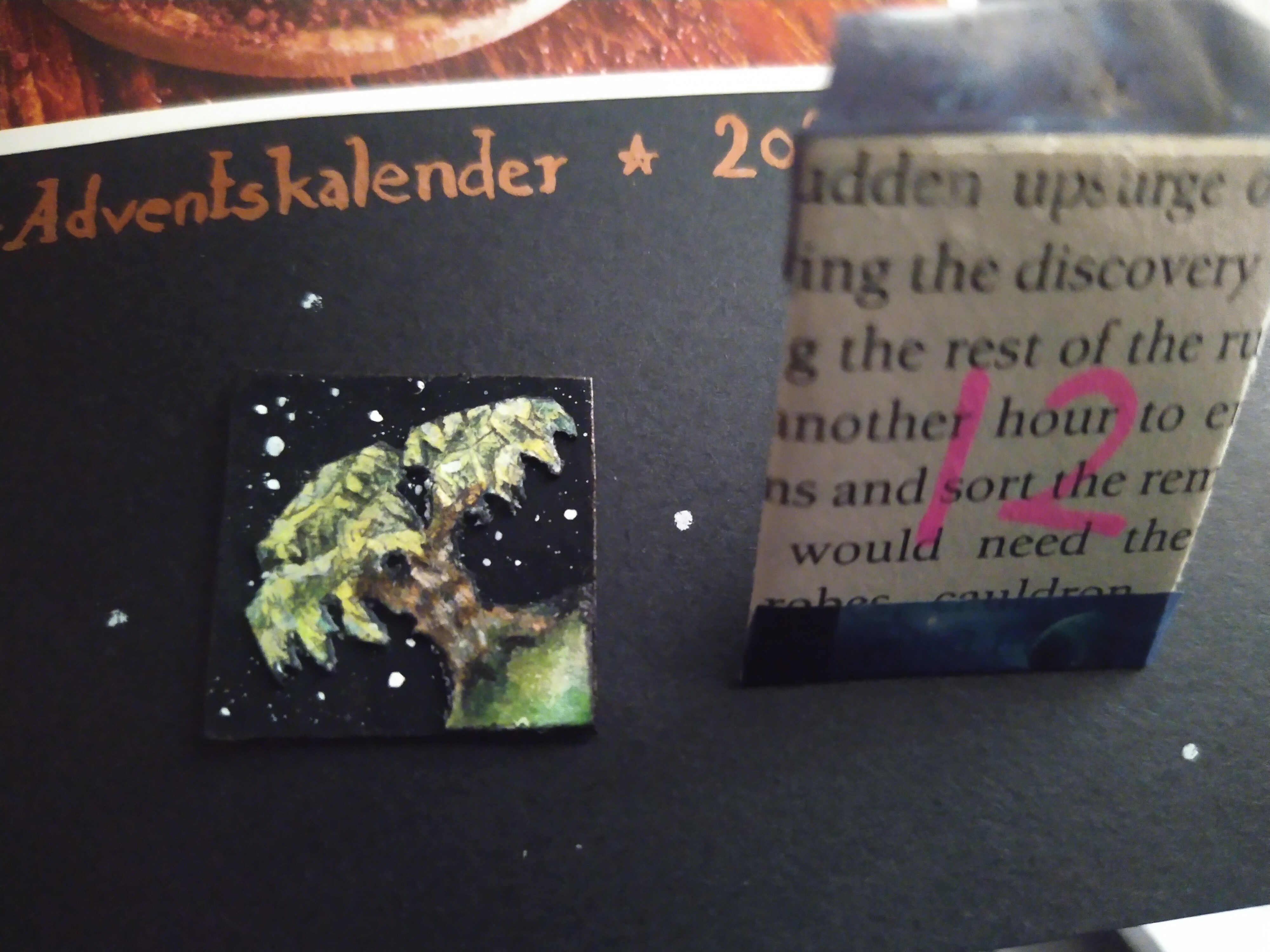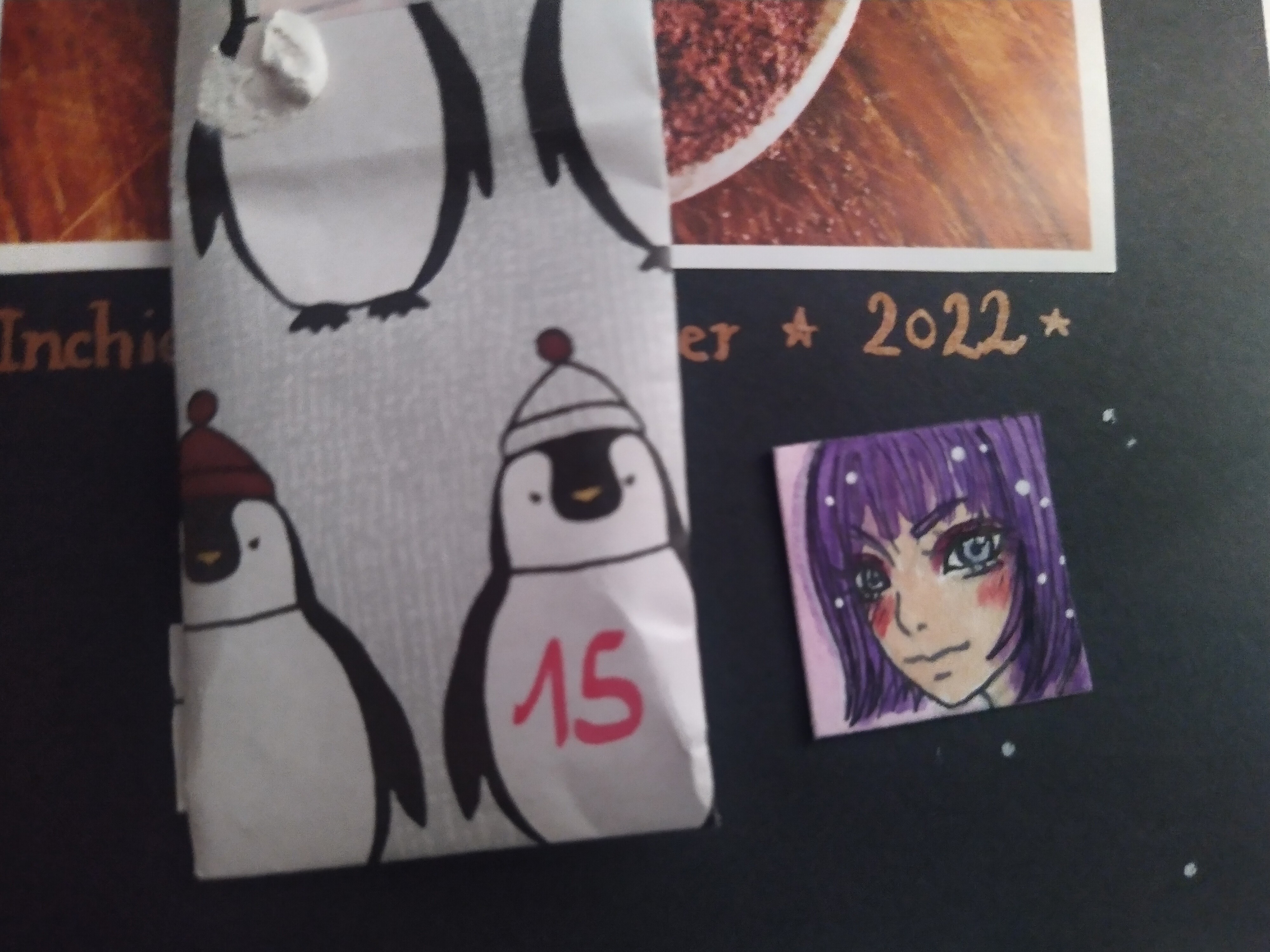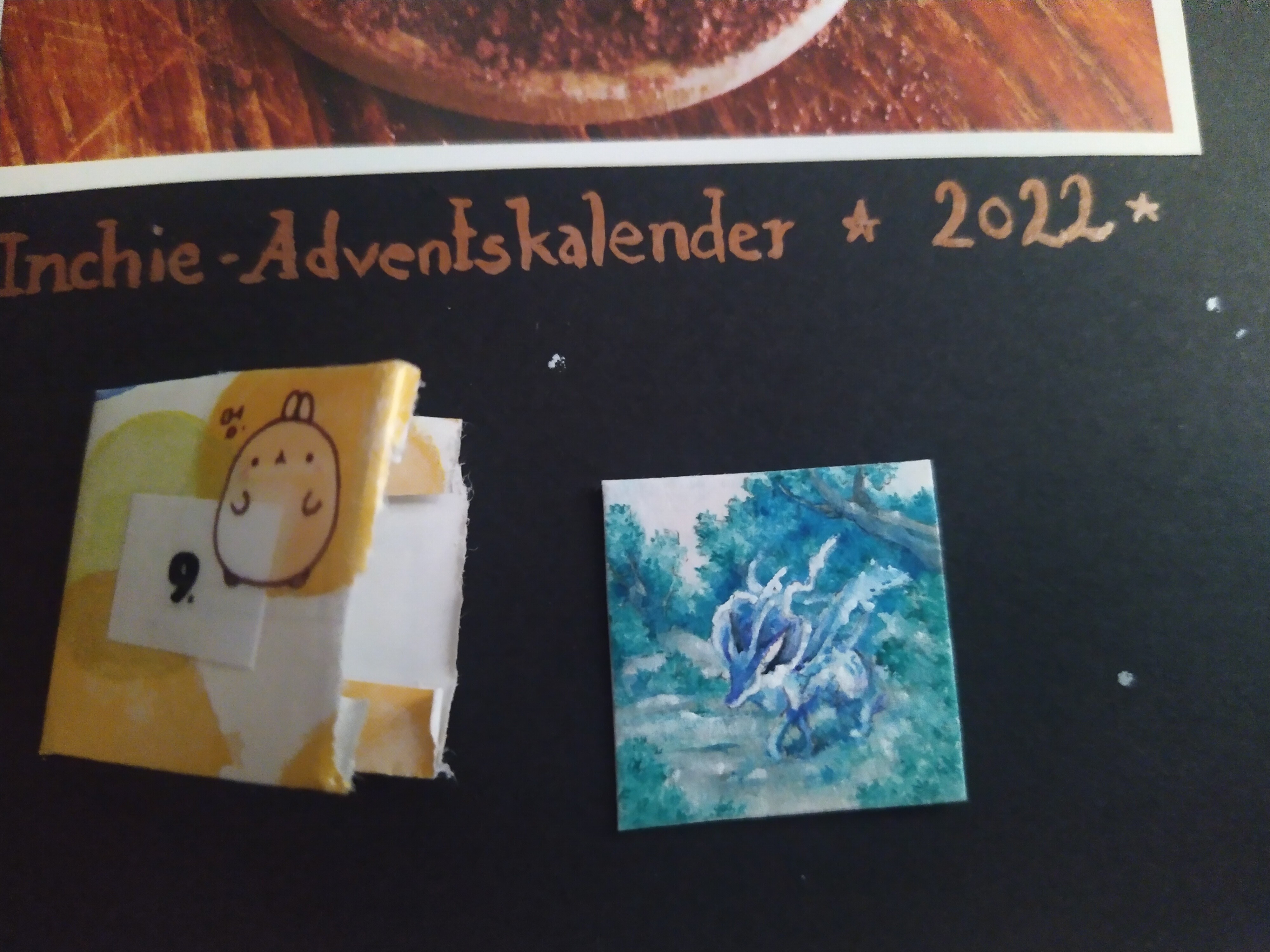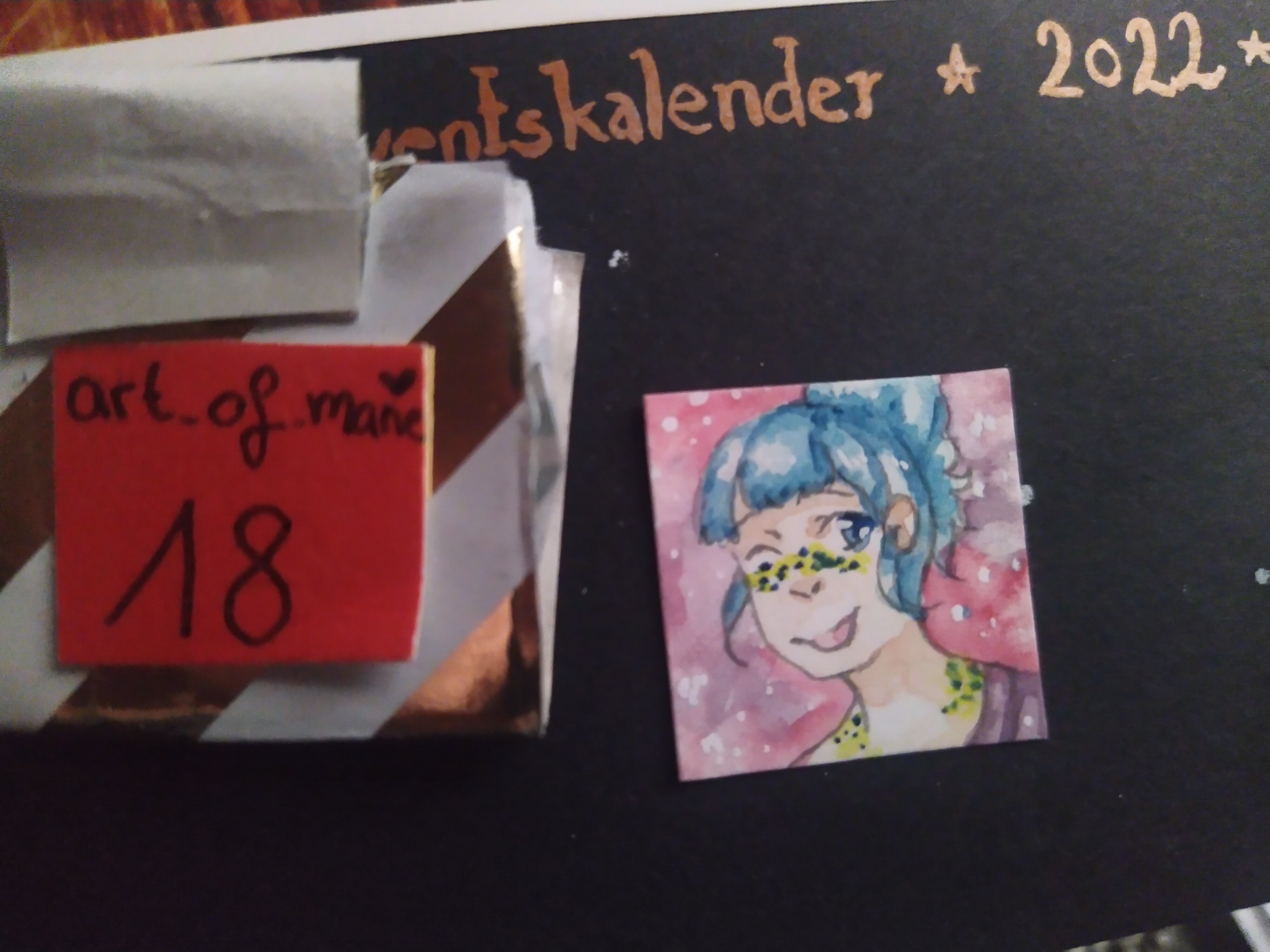 Hinter dem 20. Türchen schaute mich eine Promi-Toastbrottaube auf dem roten Teppich an :D Die anderen möchten auch gern im Mittelpunkt stehen XD. Die Details sind einfach beeindruckend ausgearbeitet. Besonders genial finde ich, dass es auf dünnem Holz gezeichnet wurde. Durch den goldenen Hintergrund passt es auch gut in die Weihnachtszeit :D Vielen lieben Dank an @Rea-Listin Du hast mir eine große Freude damit gemacht :)