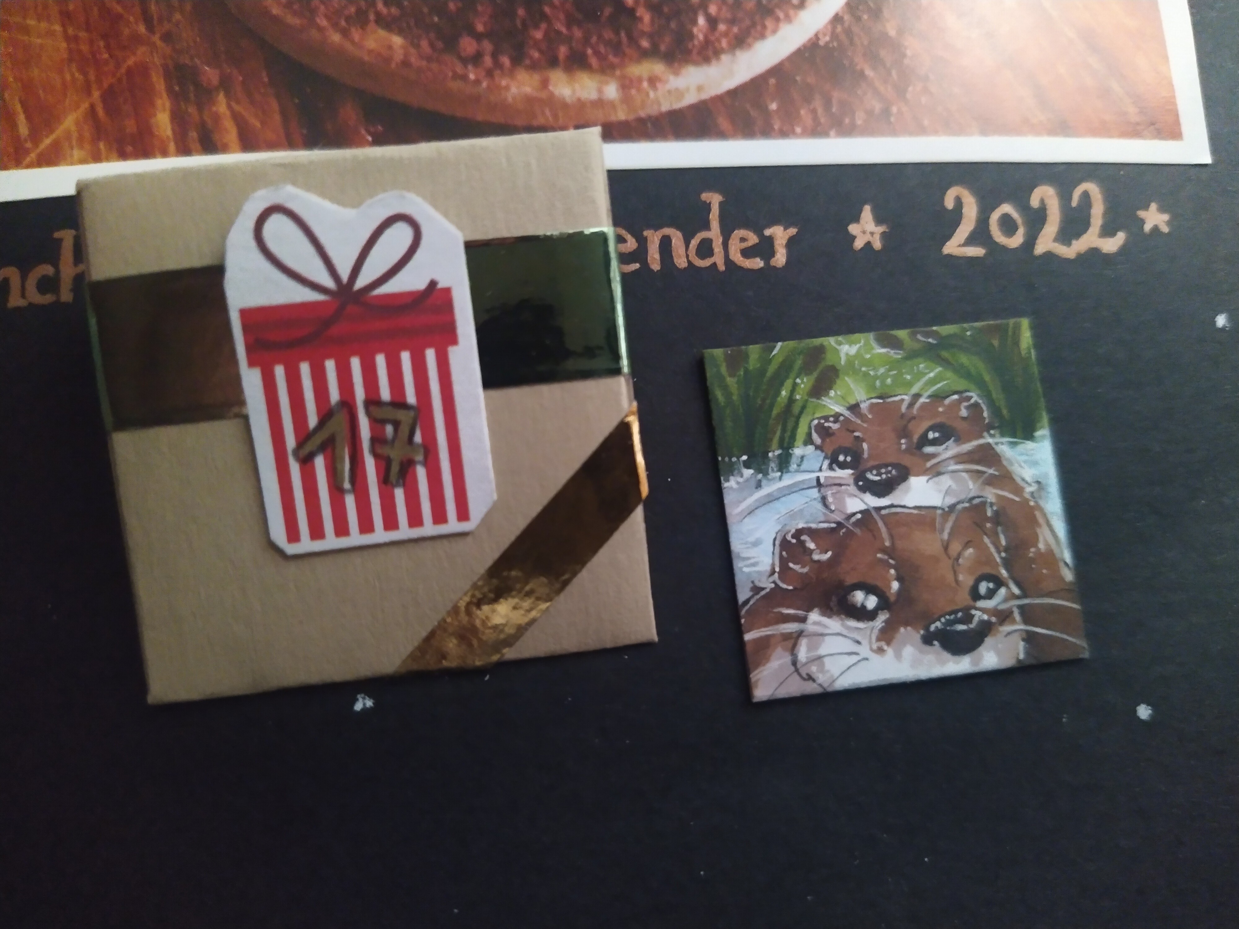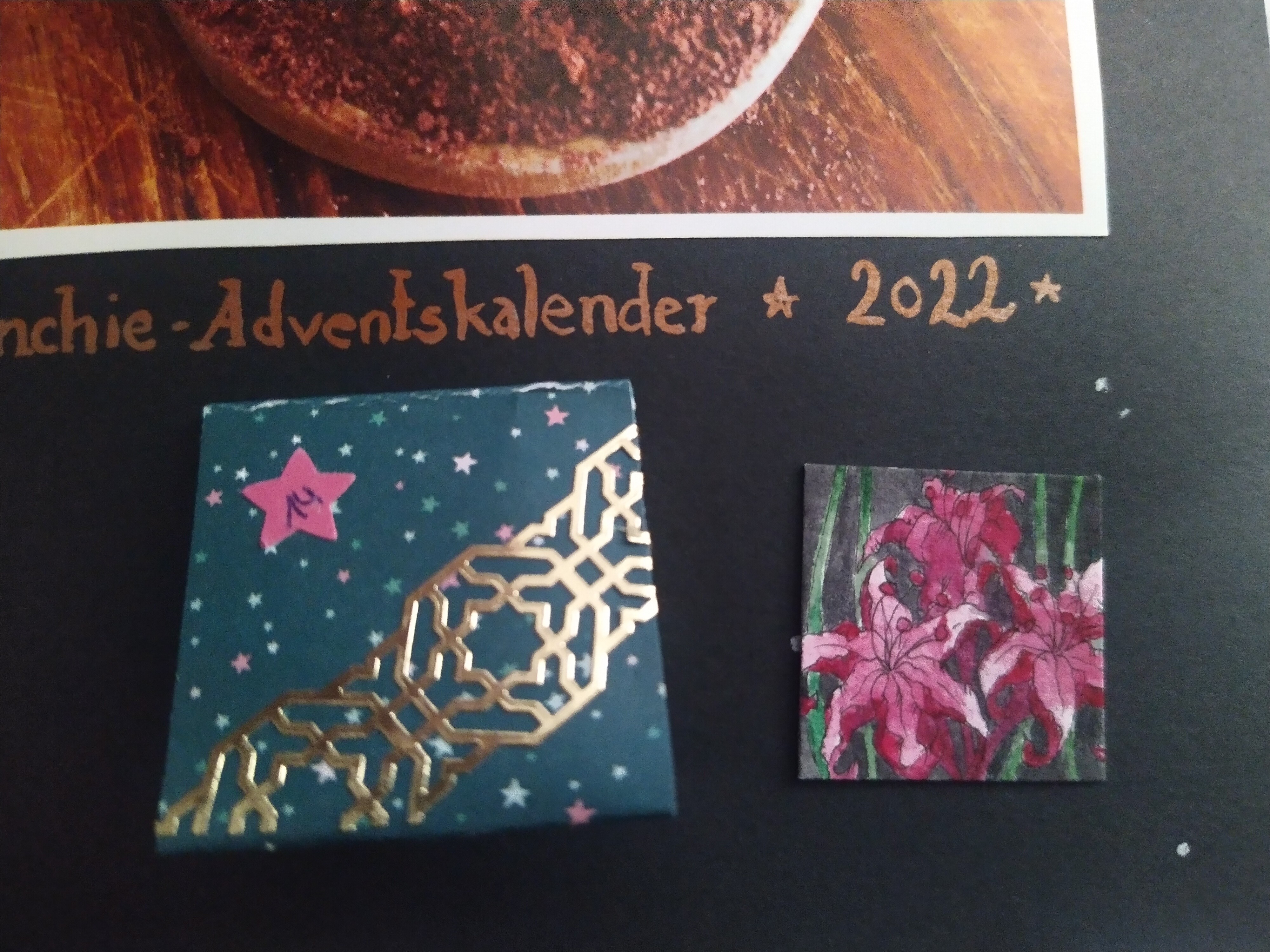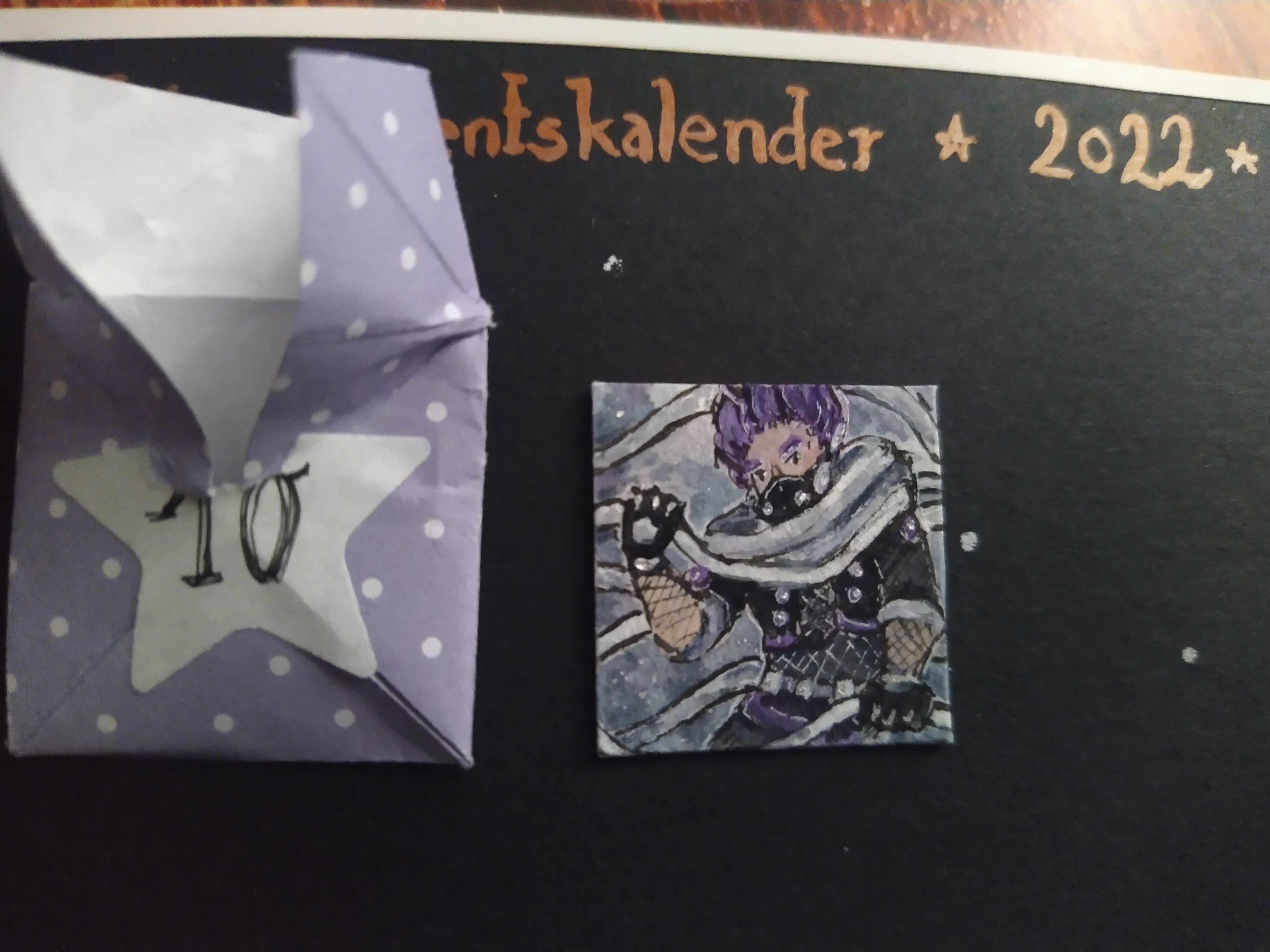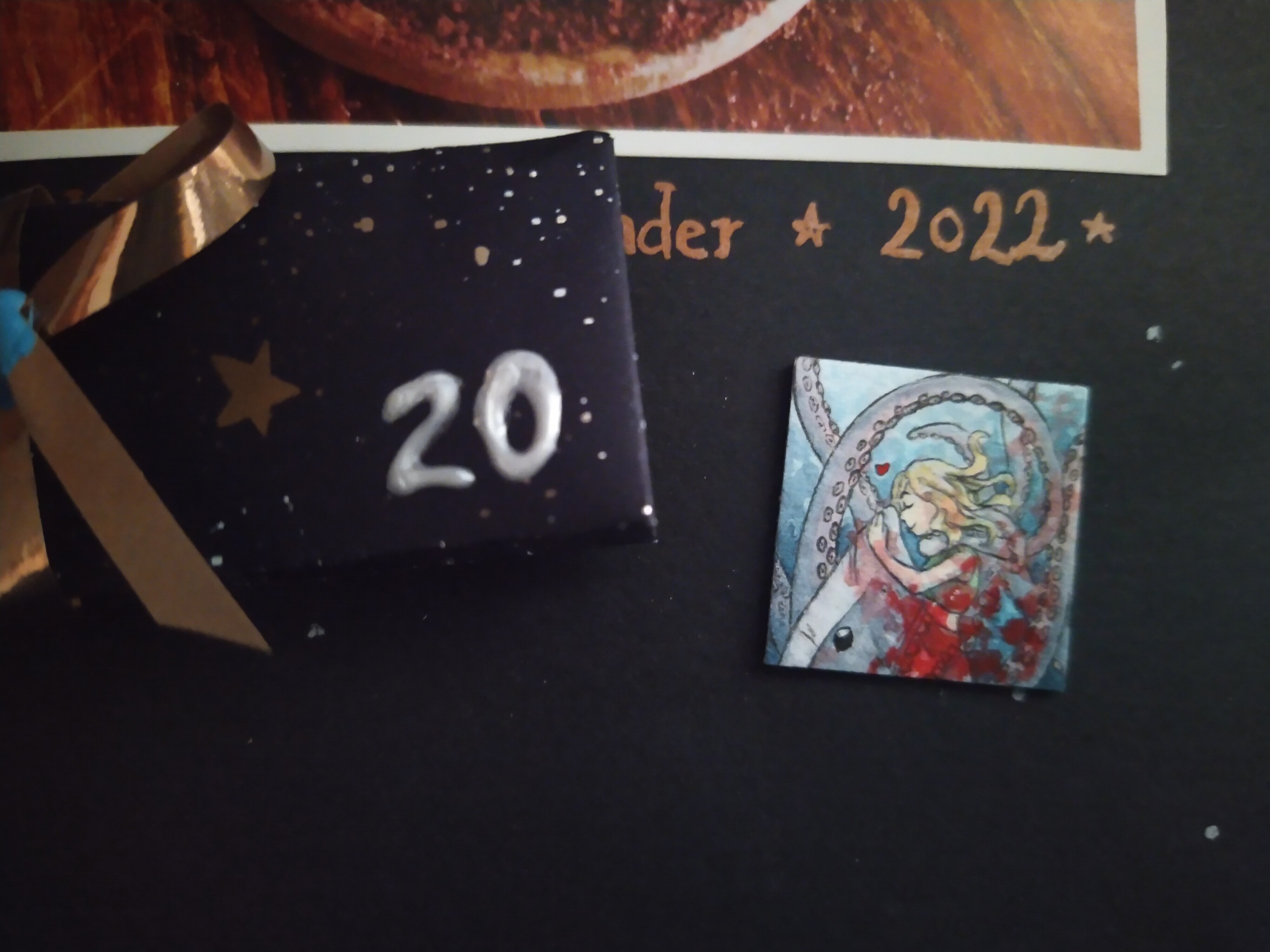Hinter dem 20. Türchen schaute mich eine Promi-Toastbrottaube auf dem roten Teppich an :D Die anderen möchten auch gern im Mittelpunkt stehen XD. Die Details sind einfach beeindruckend ausgearbeitet. Besonders genial finde ich, dass es auf dünnem Holz gezeichnet wurde. Durch den goldenen Hintergrund passt es auch gut in die Weihnachtszeit :D Vielen lieben Dank an @Rea-Listin Du hast mir eine große Freude damit gemacht :)