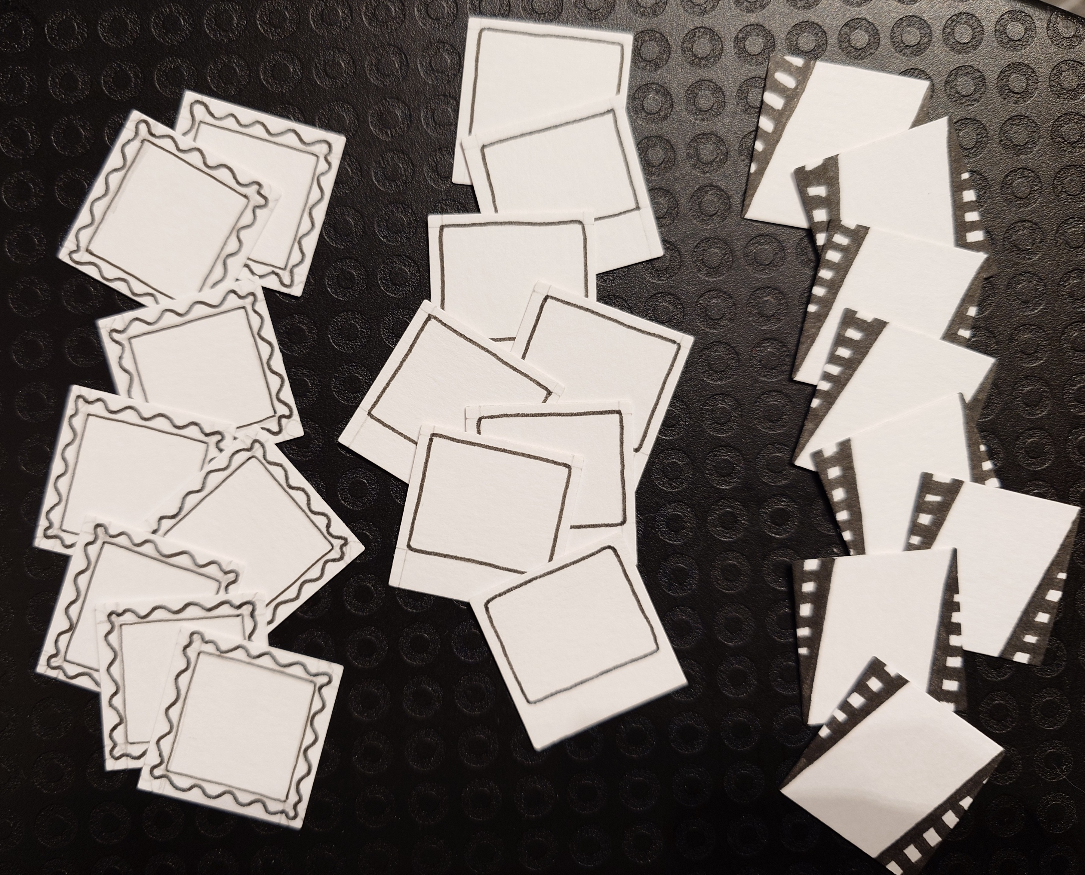 Ich hab die Rahmen meiner Inchies fertig. 8 Briefmarkenrahmen, 8 Polaroidrahmen und 8 Filmrahmen.