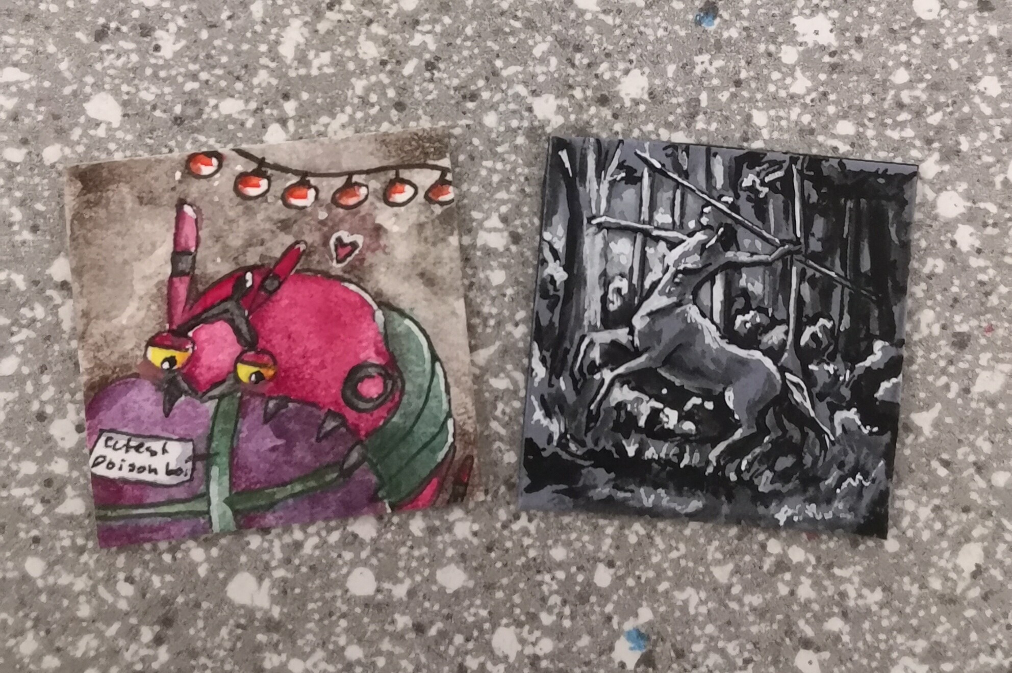Einmal der cutest poison boi von @Evolana am 13. Ich liebe ihn. Das Inchie ist so niedlich. Und ein absolut genial beleuchteter Zentauer von @Wuestenpfeil Es ist Wahnsinn, wie klein du malen kannst.