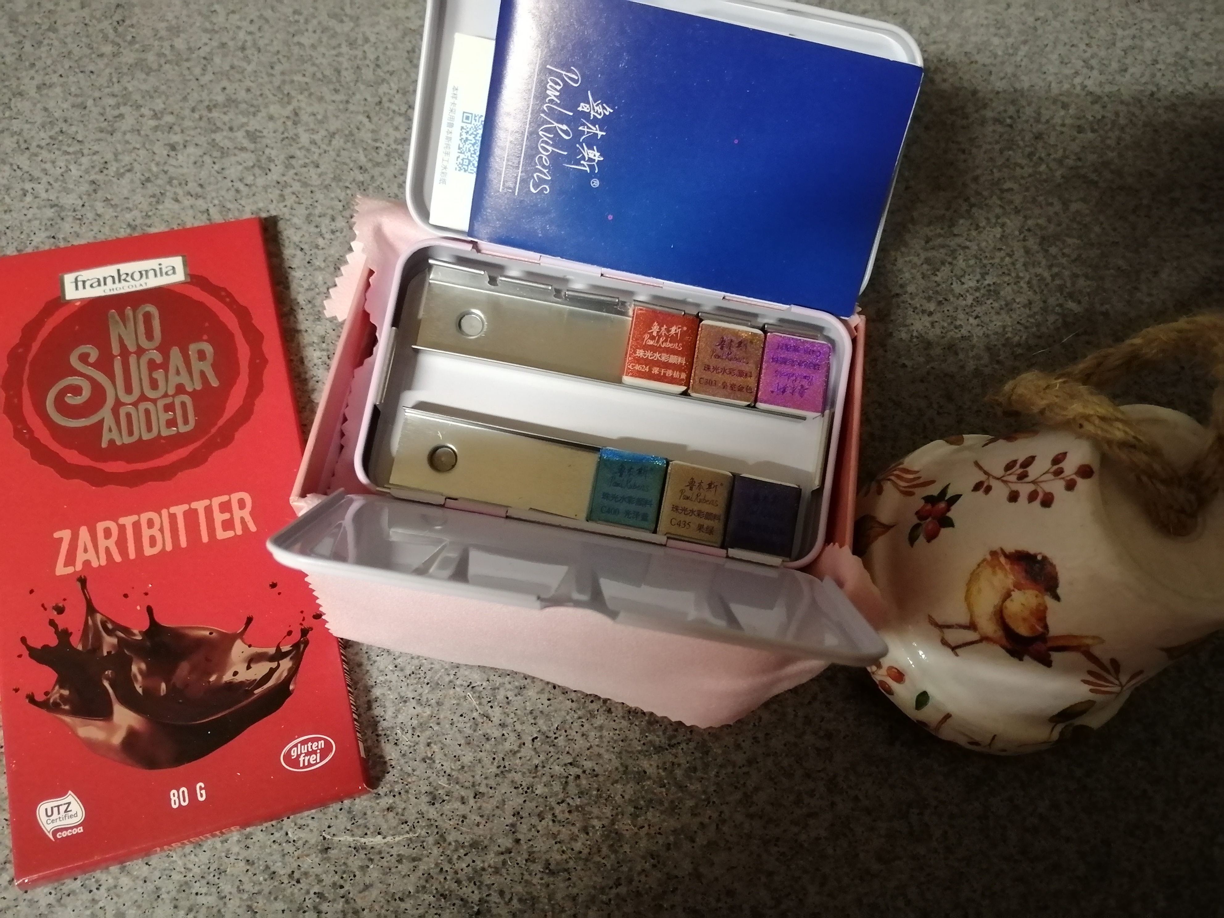 Heute gab es dann gleich Material für verschiedene Bereiche. Zum einen Stoff - Aquarellle!!! - Farbe … ich wusste ja garnicht dass es sowas gibt, sehr cool ! & einen Beutel. Ich freue mich schon die gemeinsam zu verwenden : ) dazu habe ich jetzt auch noch ein neues Aquarellenäpfchen mit einem interessant aussehenden grünton & noch ein Notizheft