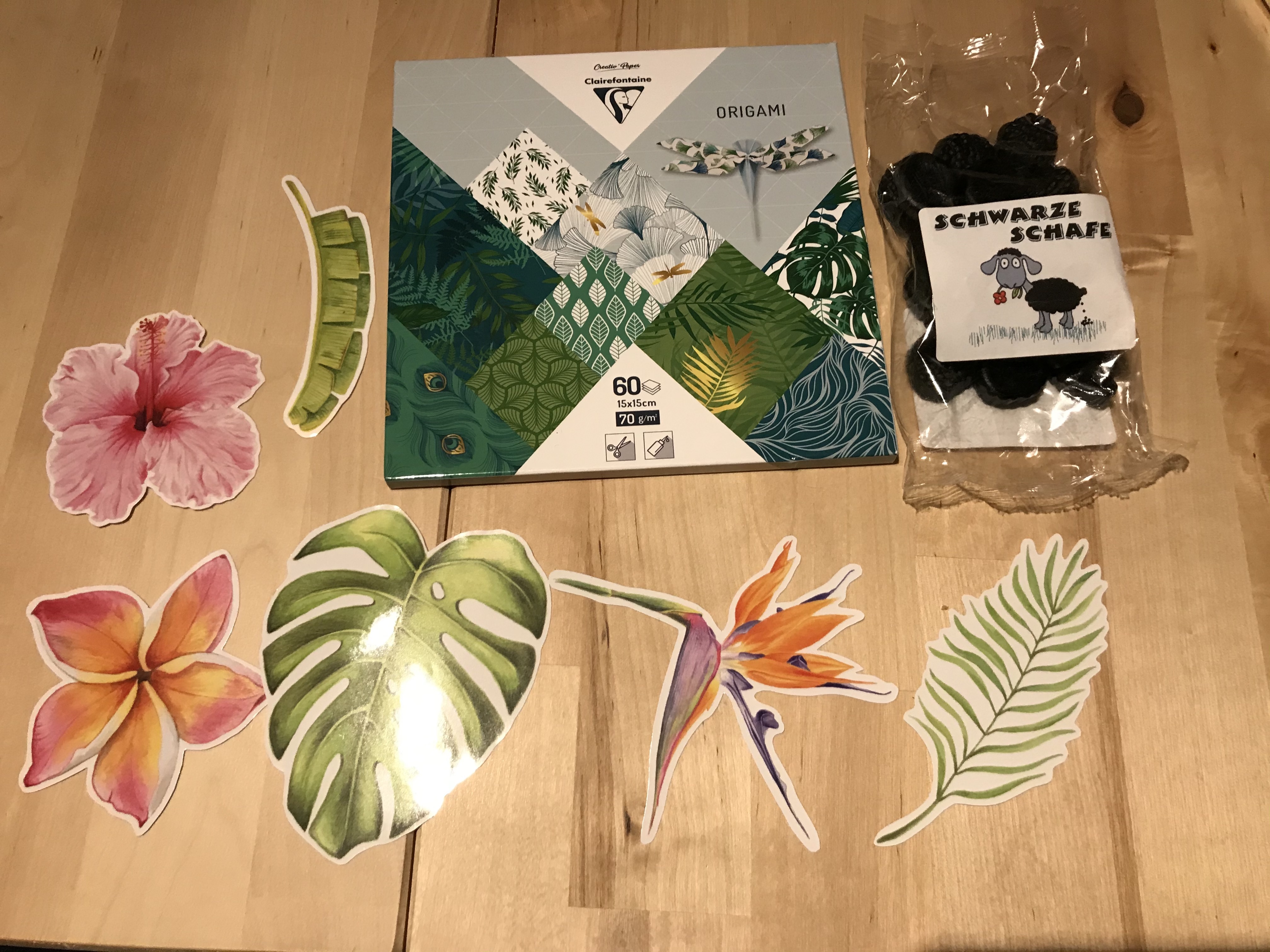 Meine botanische Ausbeute bestand aus einigen wundervollen Stickern und Origamipapier mit insgesamt 30 (!) verschiedenen Motiven. Das ist natürlich super zum Kakaokarten und Rückseiten gestalten, aber ich mag tatsächlich auch Origami-Falten sehr und habe mich schon an einem Kranich probiert :-)