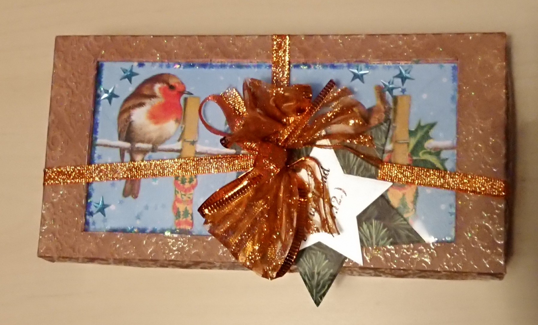 Das letzte Päckchen ist nun auch geöffnet ,in Ihm befand sich ein 12er Kasten Paul Rubens Farben ,meine Wichtelmama fenschu hat gleich einen ganzen Kasten für mich gekauft und im Kalender verteilt .Was für einen tolle Überraschung ganz herzlichen Dank dafür ,die ersten 6 habe ich bereits getestet und finde sie Klasse .Eine Tafel Schokolade , diese Marke kenne ich nicht , werde ich zu einem späteren Zeitpunkt probieren .Und eine wunderschöne Meisenglocke in Servietten Technik die wird nachher gleich zu den Vogelhäuschen im Garten gehängt ,da werden sich unsere vielen gefiederten Gäste freuen .Vielen lieben Dank fenschu für den wundervollen Kalender den Du für mich zusammen gestellt und gebastelt hast ,du hast genau ins schwarze getroffen und mir mit jedem Päckchen eine grosse Freude bereitet .