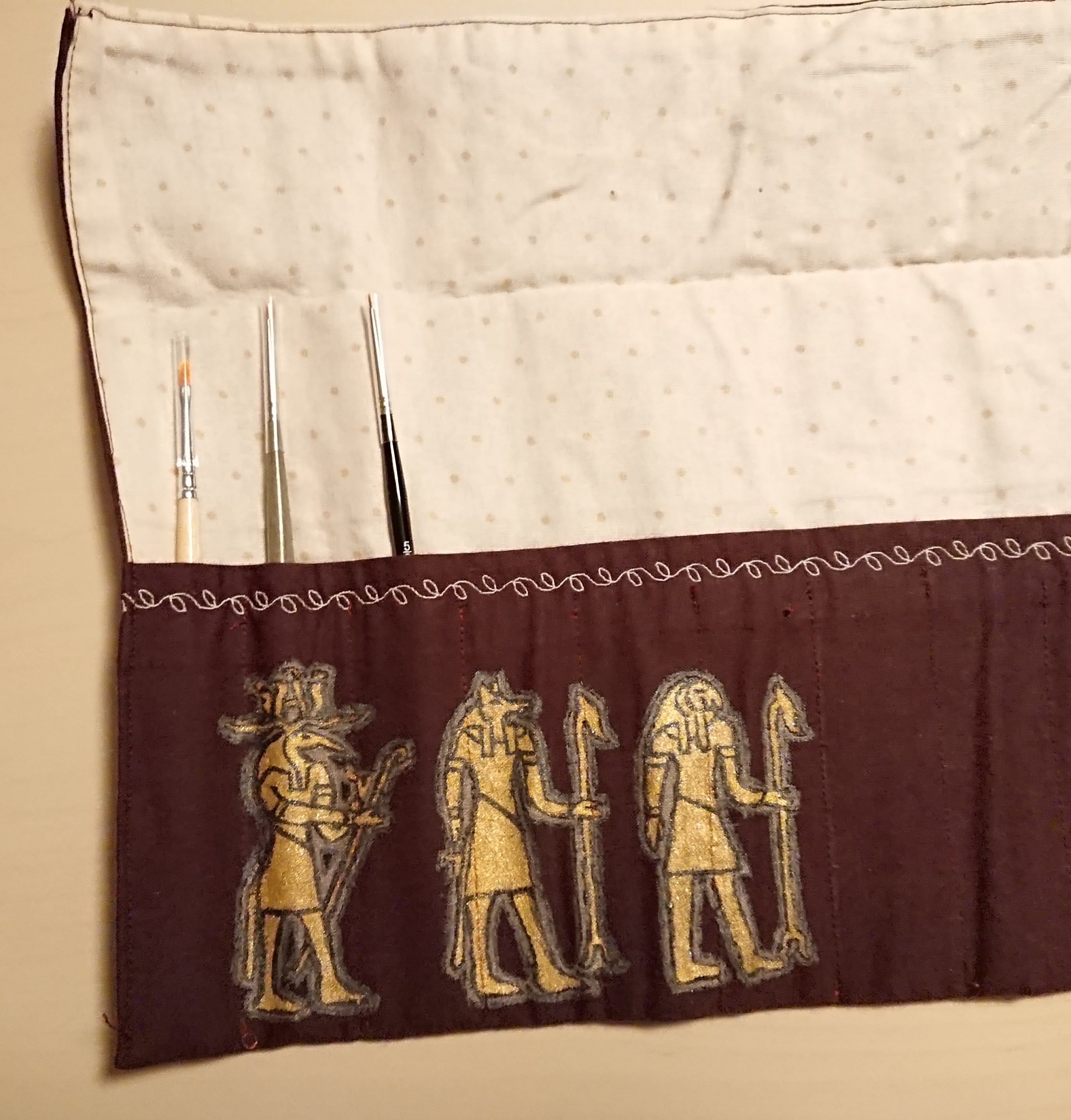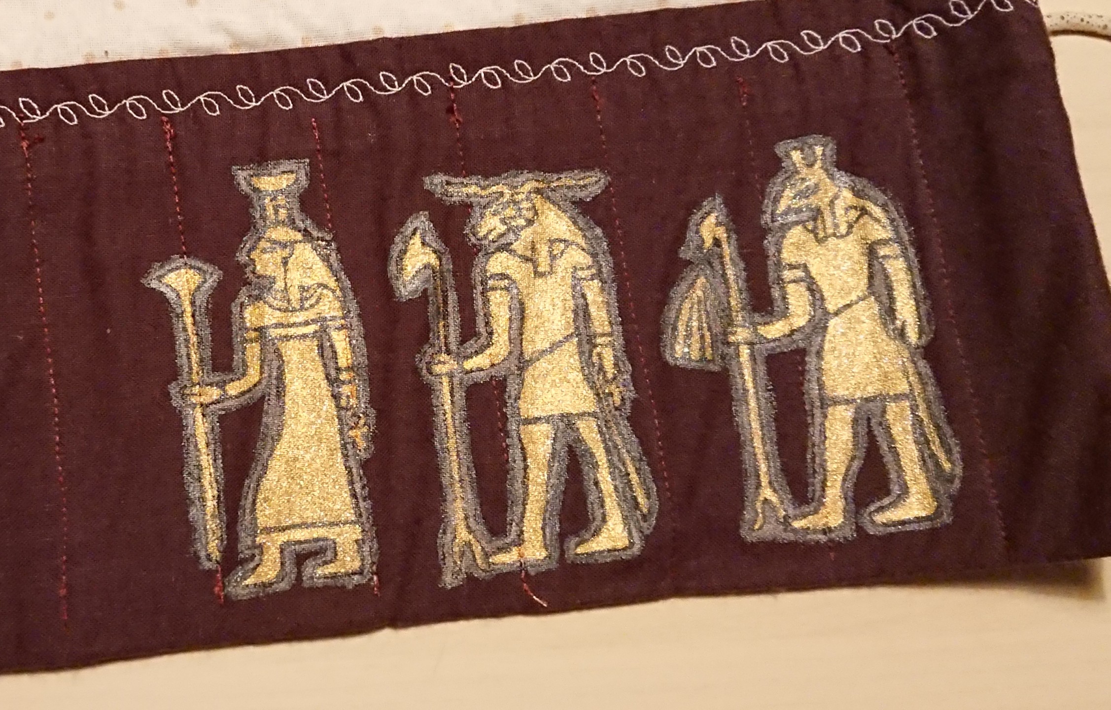 wtf. Selbst genäht (mit einem echt coolen Blätterranke als Zierstich) und dann auch noch gleich mit ägyptischen Göttern und Symbolen bemalt!