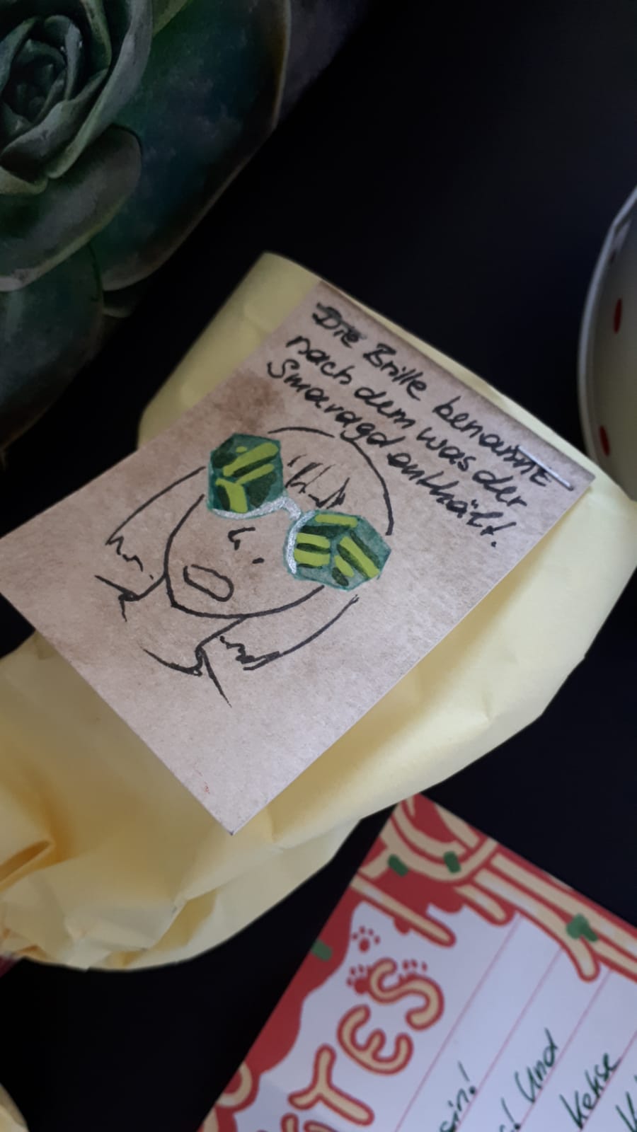 Türchen 2 (Tag 4)Beryllium Päckchen mit der Brille. Zuerst war ich mir sicher, dass es Chrom sein müsste beim Brillenpäckchen, da Wikipedia sagte, das würde für die Farbe sorgen