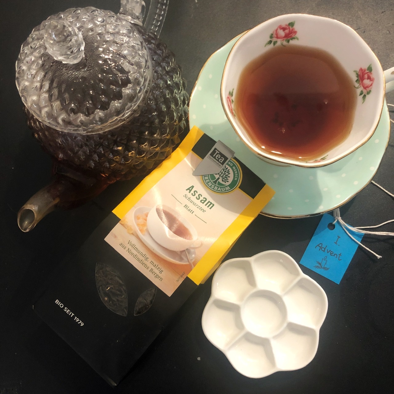 Hinterm ersten Türchen Ginkopapier verbirgt sich ein Tee, der mich sicher durch den Advent bringen soll, in der leckeren Sorte Assam