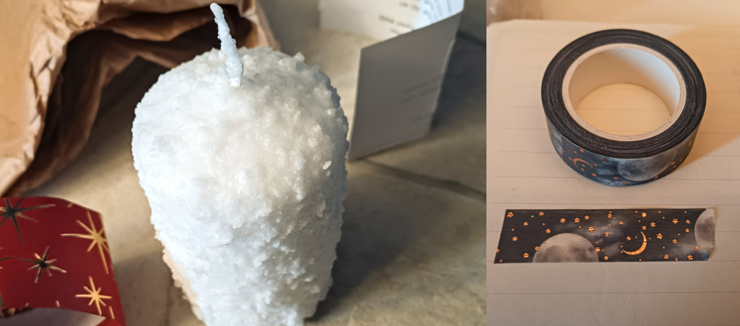 Darin erwartete mich eine große Kerze in Schneeoptik. Die ist total cool, so ein wenig bauschig und richtig winterlich. Das gibt bestimmt eine schöne Stimmung, freu mich sehr darauf, sie anzuzünden! <3