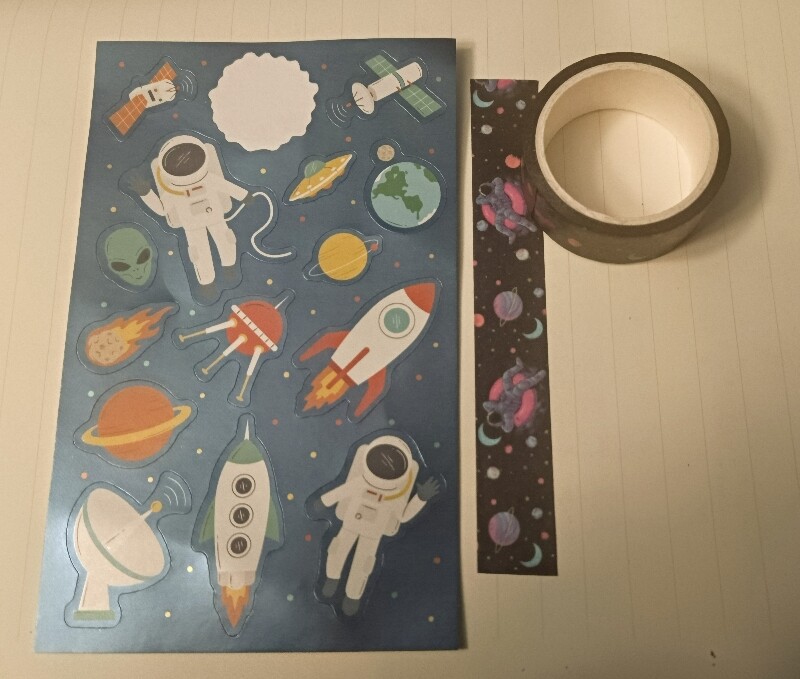 Für mich gabs gestern ein cooles Weltraumtape und thematisch passend dazu diese Sticker hier, vielen Dank dafür! Die Sonne hab ich direkt runter geklaut und in mein neues Skizzenbuch geklebt, so schnell konnte mein Handy gar kein Foto machen XD<3