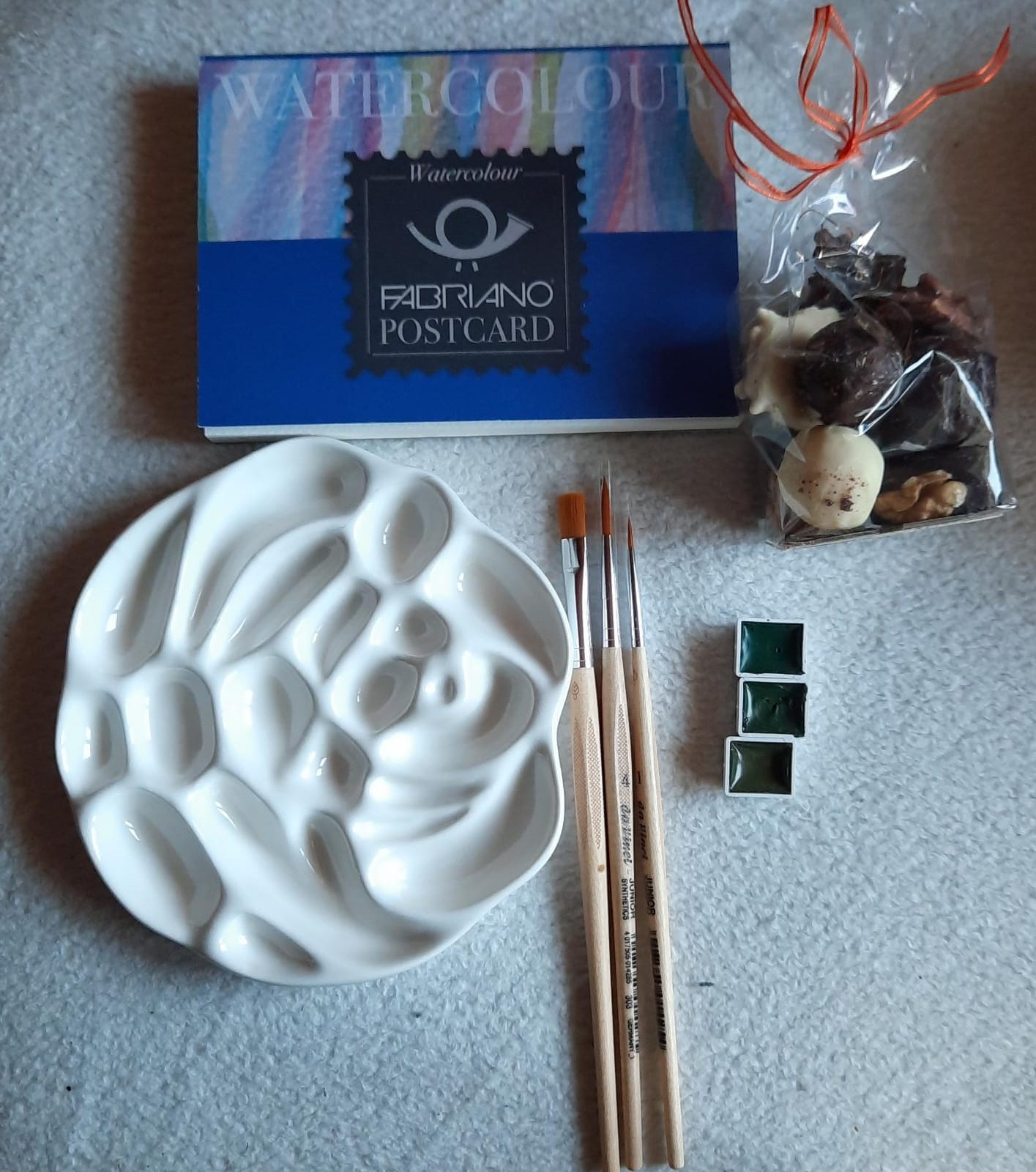 Gott ich liebe Pralinen. Verschiedne Grüntöne über die ich mich mega freue, ich hab vor ein paar Wochen meinen neuen Aquarellkasten eingeweiht und war tot traurig dass ich bei 48 Farben lediglich nur 3 verschiedenen Grüntöne hatte, wer zum Geier kam auf die Schnappsidee in einen großen Aquarellkarten NUR 3 Grüntöne reinzutun. Dafür wurde ich mit allerhand Geld Orange und Rot zugeworfen. Jedenfalls genial die neuen Tone die ich kaum erwarten kann einzuweihen. Dann hast du sogar meine Lieblingspinselmarke ausgesucht