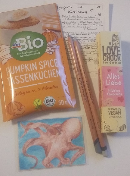 Heute gab es eine andere Schoki (die aber auch nicht lange überlebt hat…), eine Mischung Pumpkin Spice Tassenkuchen (die es vermutlich höchstens bis morgen schafft), ein leckerklingendes Rezept für Spaghetti mit Kürbismus, 2 weitere Lighfast-Stifte in Grautönen UND eine KakaoKarte mit einem Oktopus! Ich bin total begeistert von den ganzen Details (die vielen Kringel, die Schattierungen, die unterschiedlichen Posen der Arme) <3 Eine ganz tolle Karte!