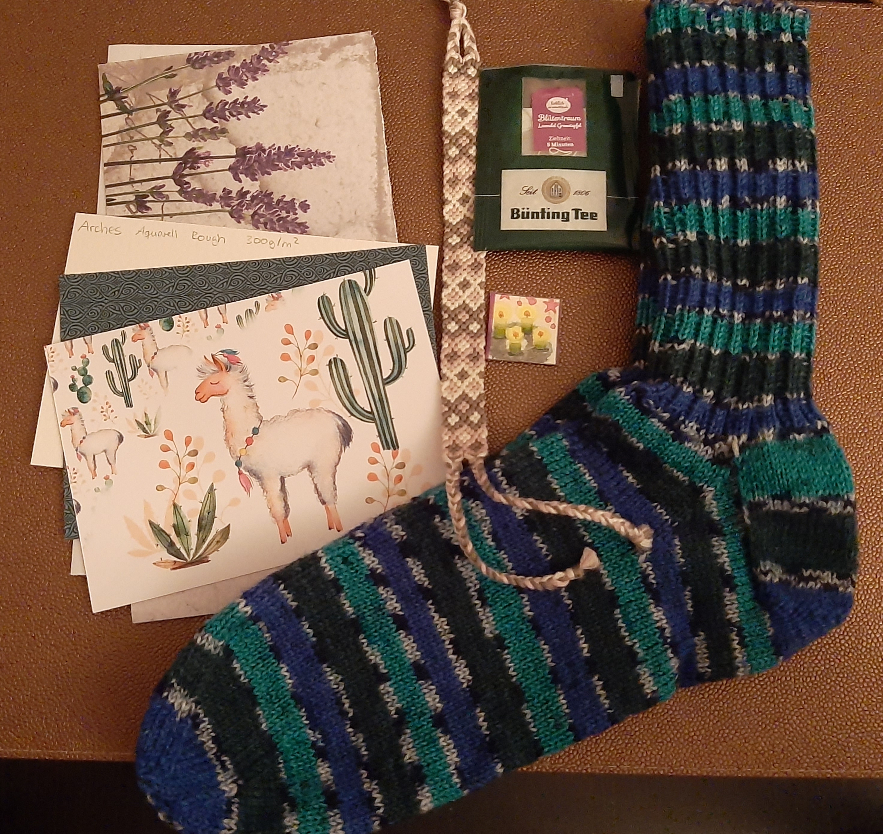 Am 4. Advent hat sich ein Traum erfüllt für mich Frostbeule: ich habe wunderschöne selbstgestrickte Socken bekommen! * ____ * Sie passen perfekt und hätten zu keinem besseren Zeitpunkt in mein Leben treten können. Ich danke dir sehr! Außerdem gab es ein wunderhübsches Armband (und was für ein Ding, das Muster ist fantastisch! ), lecker Tee, Papierprobe, Motivpapier und selbstverständlich das zuckersüße Inchie!