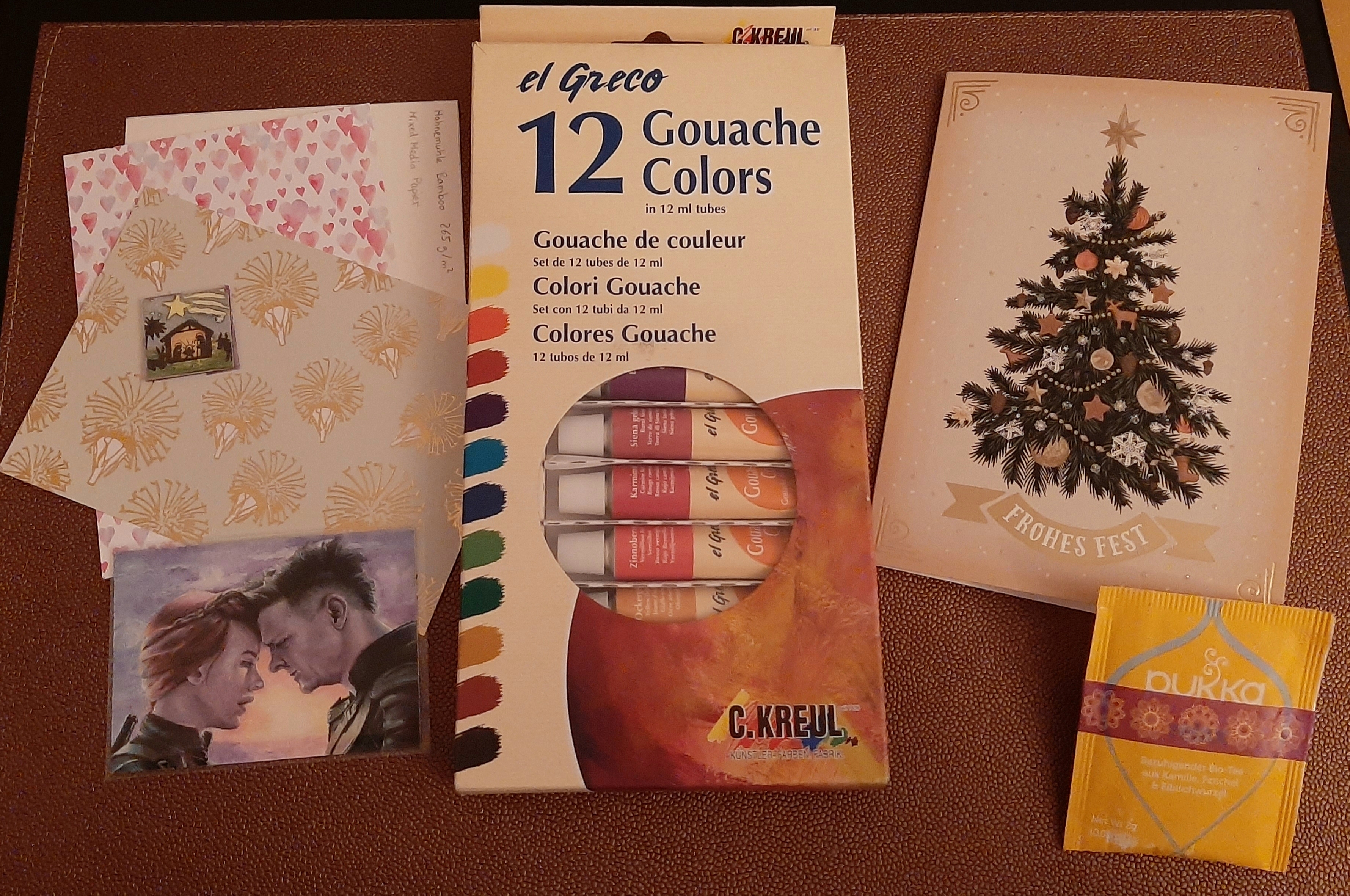 Und die “üblichen Verdächtigen” haben auch am Heiligen Abend nicht gefehlt: lecker Tee, Motivpapiere, Papierprobe und ein lieber Brief.