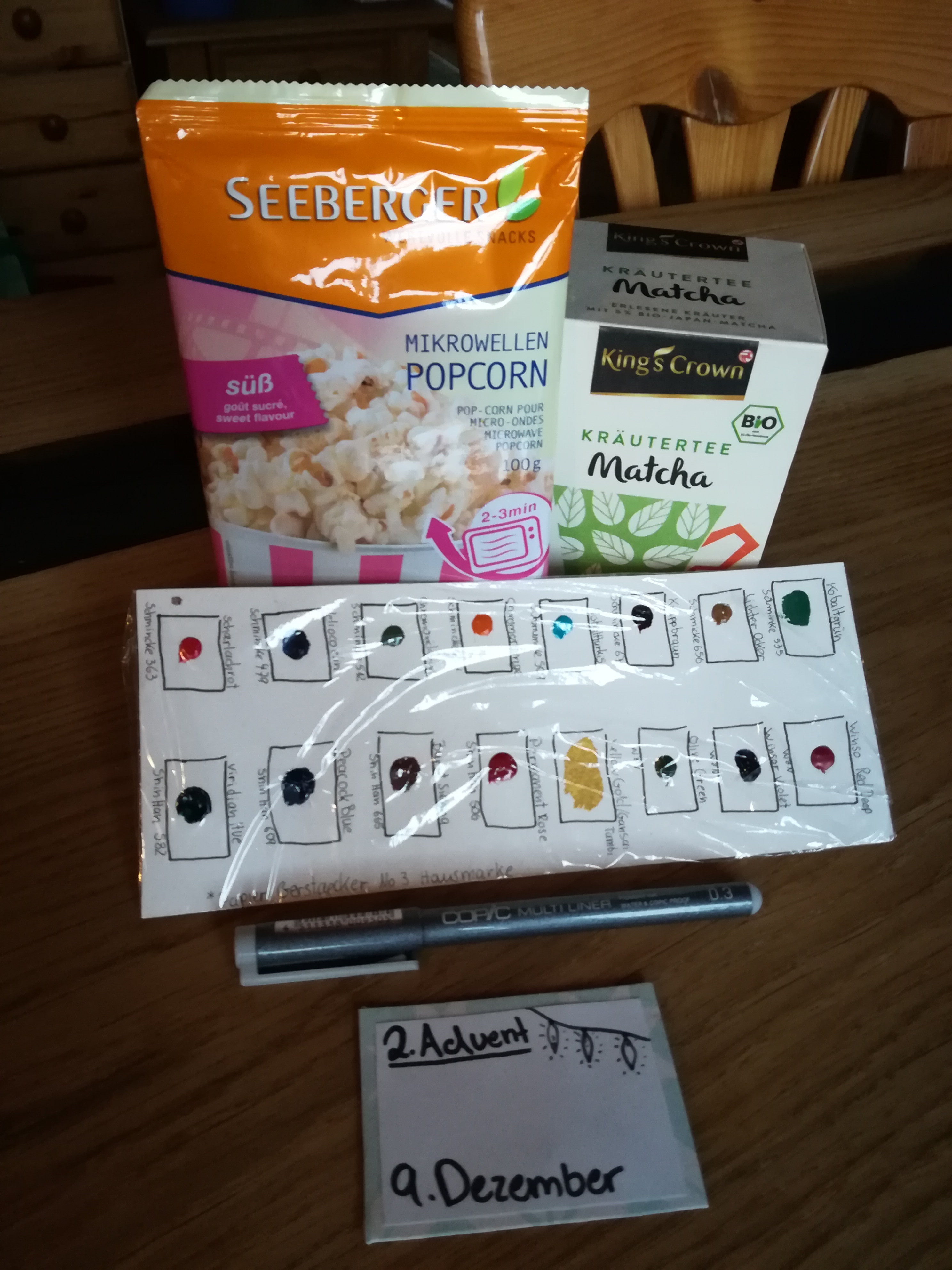 Drin waren ein Multiliner von Copic in grau, Matcha Tee (yes, yes, yes!!! 1111!!), Popcorn (der nächste Heißhunger ist gedeckt) und Mini Pröbchen (oder schon Mikro Pröbchen? XD) von verschiedenen Aquarellfarben. Dabei sind Farben von Schmincke, W&N und Shin Han. Achso und ein Goldton von Gansai Tambi. Ich finde das eine super Idee. Anstatt mir gleich ganze Näpfe zu schenken, gibt es kleine (viele) Proben. Wenn ich am Ende alles doof finde, brauch ich mich nicht ärgern, dass ich die rumliegen habe. Und wenn, dann hätte ich wahrscheinlich mindestens einen Abnehmer. XD