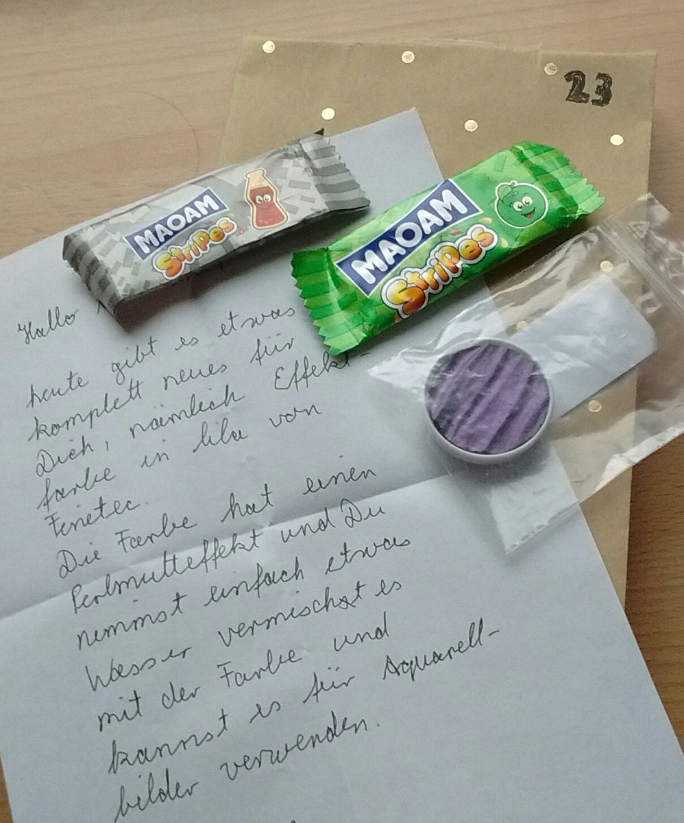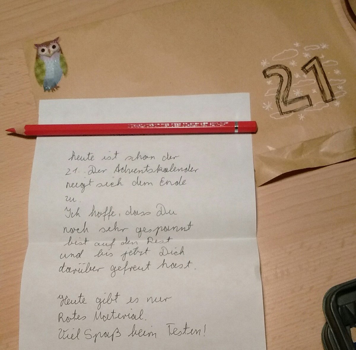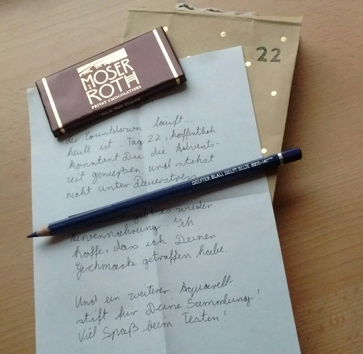 In den Endspurt des Adventskalenders startete ich mit einem weiteren Täfelchen Bitterschokolade, einer Aquarellprobe und einer flüssigen Aquarellfarbe von Rohrer & Klingner in der Farbe Ocker. Ich kenne von der Marke bisher nur die Tuschen und wusste gar nicht, dass sie auch flüssige Aquarellfarben herstellen. Ich bin schon sehr neugierig, wie sie im Vergleich zu den Colorex Farben sind.