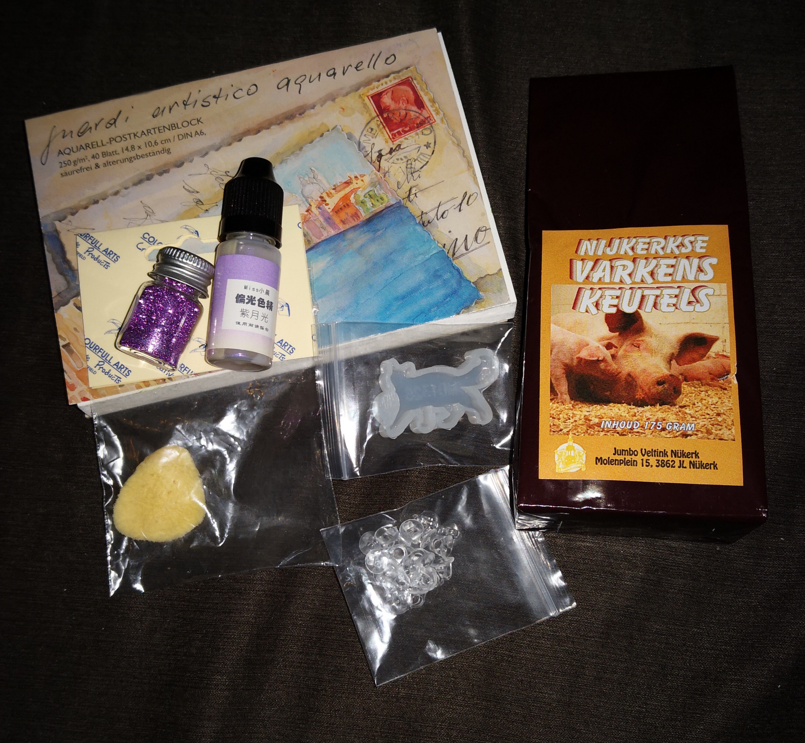 Die Süßigkeiten haben es nicht mehr aufs Bild geschafft, aber drin waren Gummitiere und Nougat. Dazu eine sehr schöne Auswahl an Motivpapieren und Stanzteilen, von denen ich am meisten die Efeuranken mag.