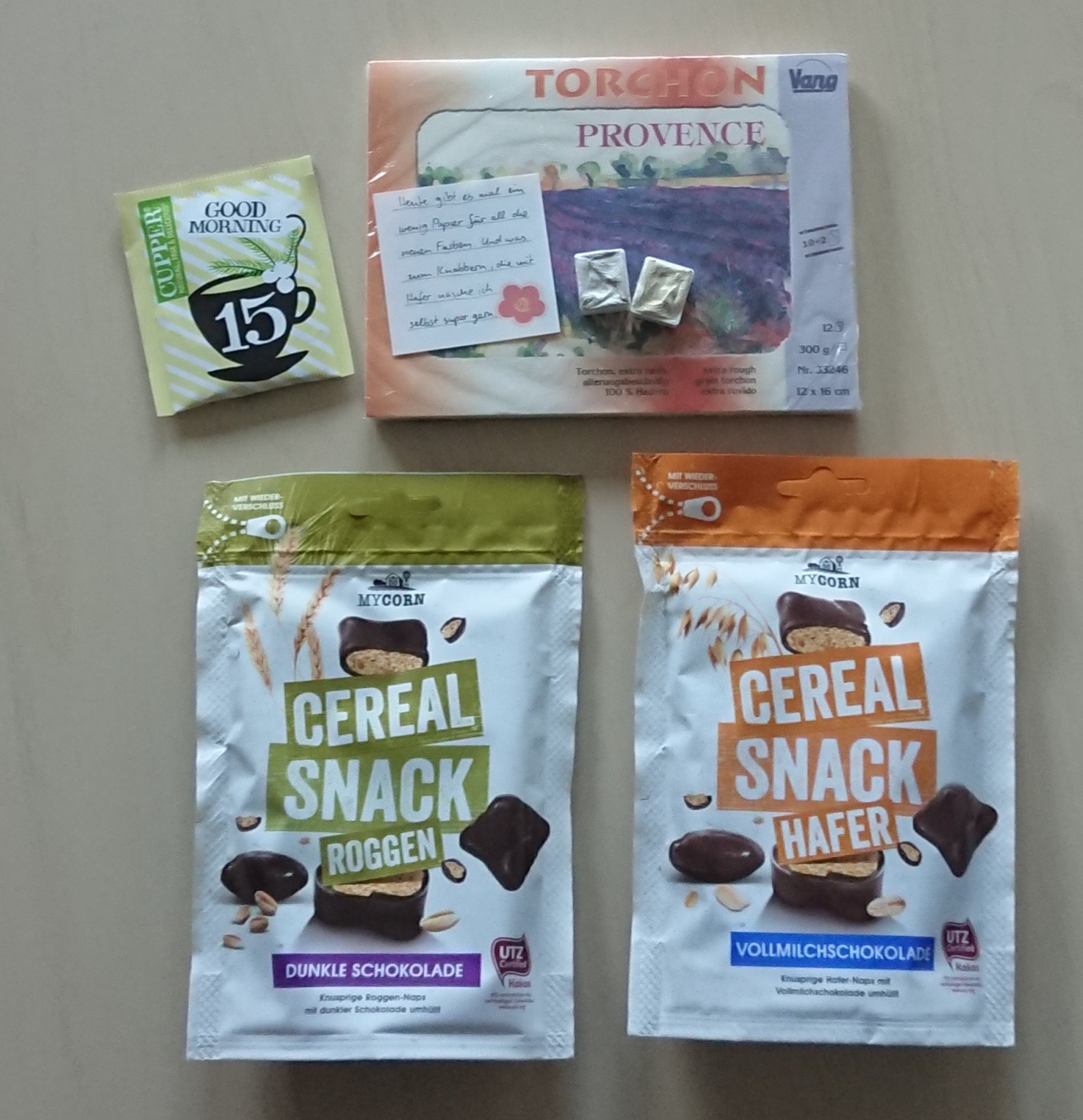 Außerdem dabei: leckere Schoko-Kaffeebohnen, die ich gerade eifrig vernichte. (Die machen echt süchtig!)