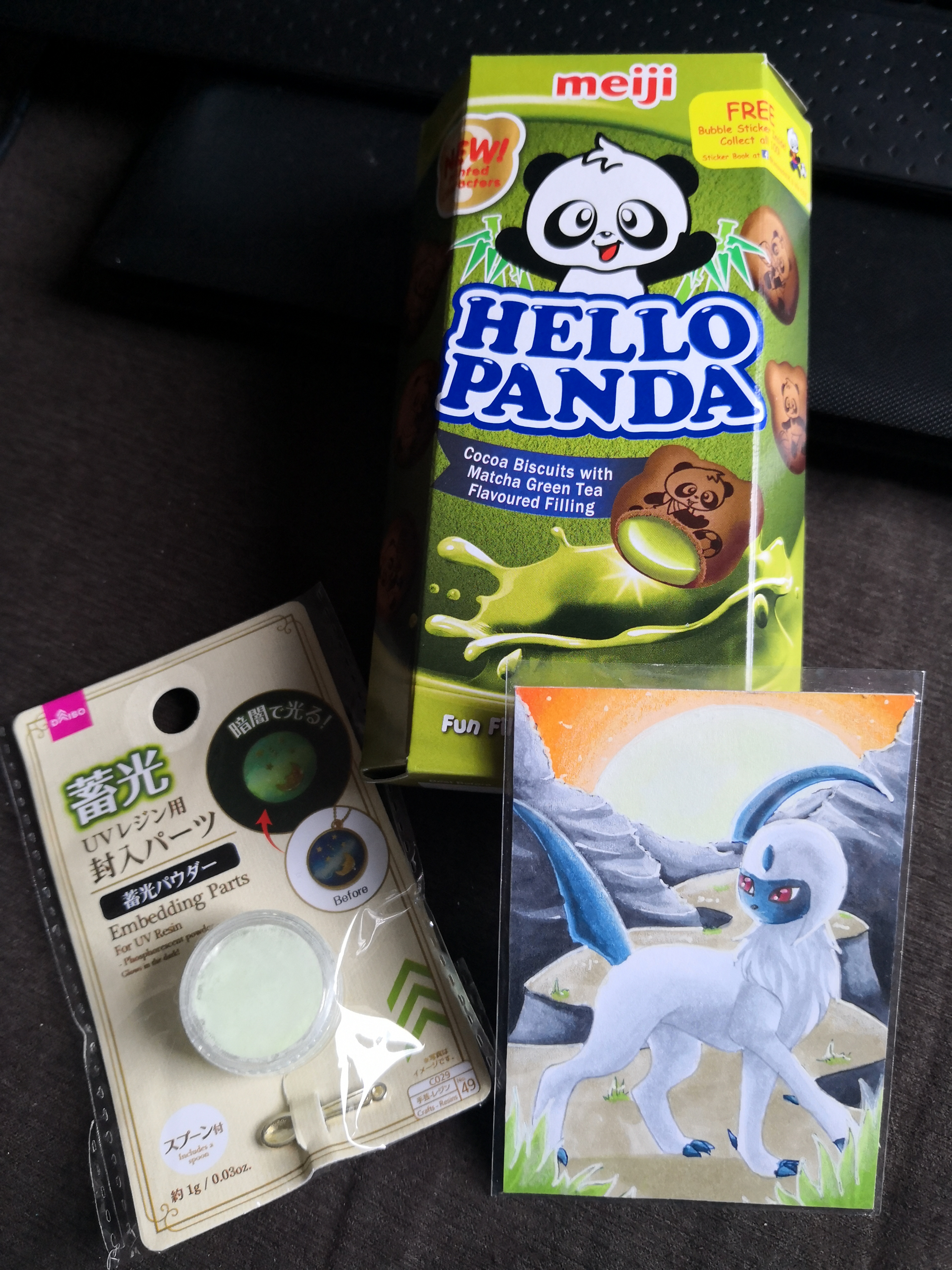 Auf dem Bild sind noch Nachtleuchtpigmente aus meinem Japankalender und eine Kakao-Karte von @Flaemmchen aus einem zirkelinternen Minikalender auf animexx.