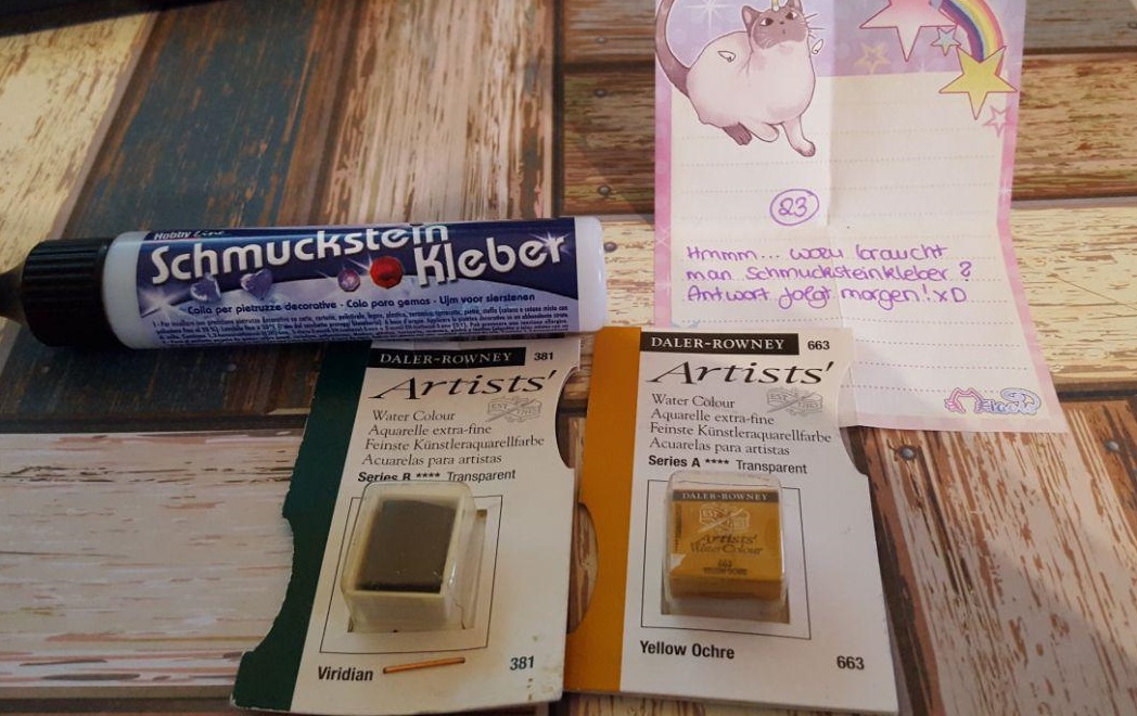 Bekommen habe ich wie gesagt einen tollen Schmucksteinkleber. (Den kann man so oder so für vieles Gebrauchen, manchmal klebe ich mit dem auch andere Applikationen als nur Schmucksteine <3 ;) Und dann noch 2 tolle Aquarell Farben in Viridian und Yellow Ochre. Da bin ich echt gespannt wie transparent die sind, ich glaube sollche besitze ich noch gar nicht :-O <3