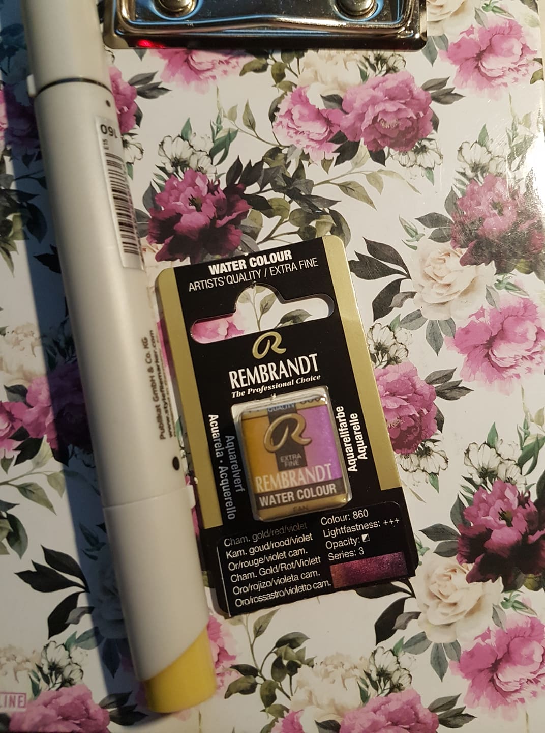 An Tag 9 fand ich in einer hübschen Box gleich mehrere tolle und nützliche Dinge vor: Eine Pinselseife, einen Maskierstift, Vergoldermilch für Schlagmetall und einen Mini-Leinwand-Magneten! Gerade auf die Arbeit mit der Vergoldermilch freue ich mich sehr, da ich mit dem Stift so meine Scherereien hatte und das einer der Gründe ist, weshalb ich mein Blattmetall kaum nutze. Und solche Leinwandmagneten kannte ich noch überhaupt nicht, mal sehen, was ich da draufpinsele~