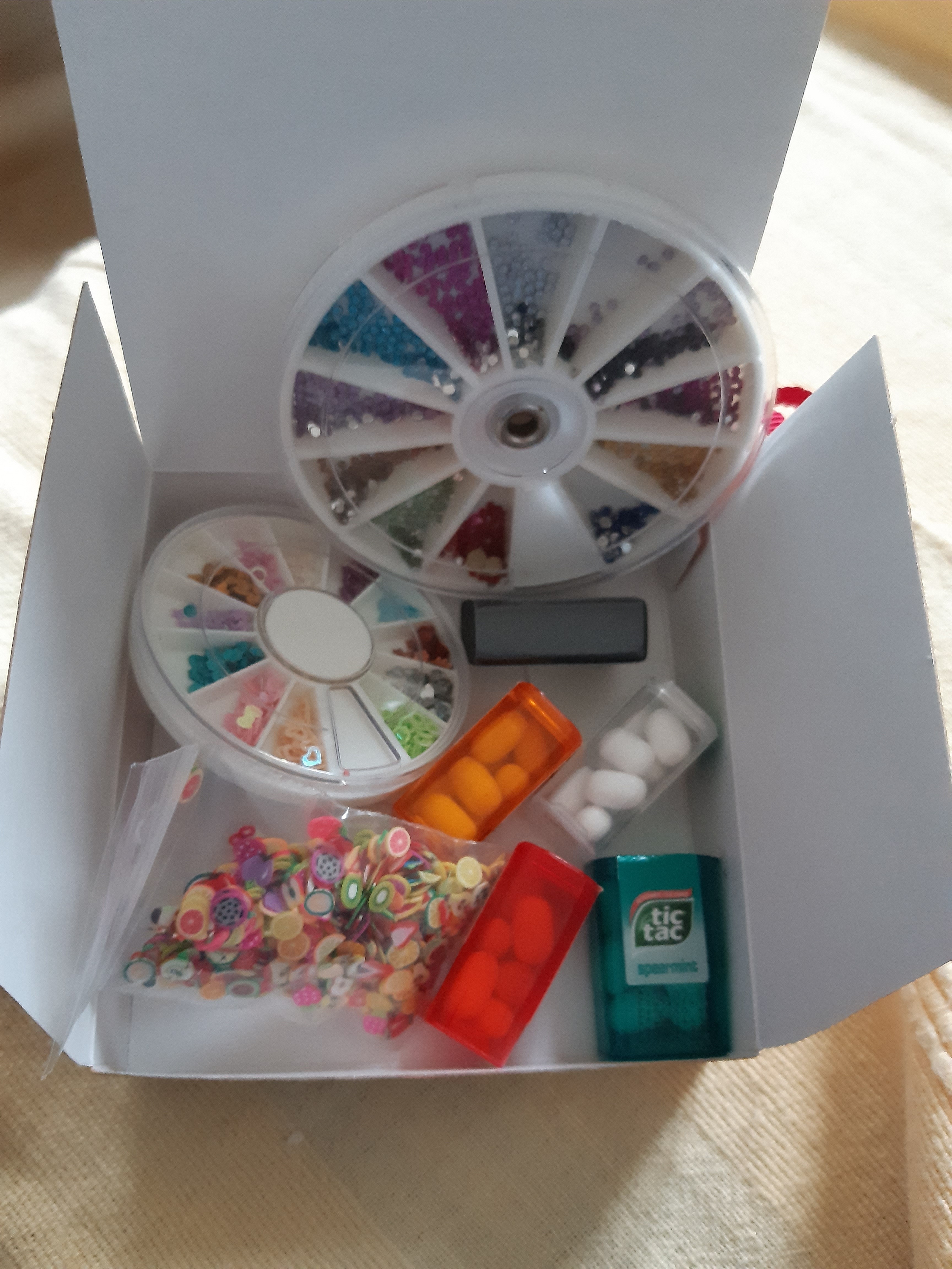 Einen Mini-Kiste^^ mit einem schön weichen Radiergummi, Glitzer und TikTaks :D Die mag ich tatsächlich gerne und das Radiergummi wird gleich ausprobiert^^