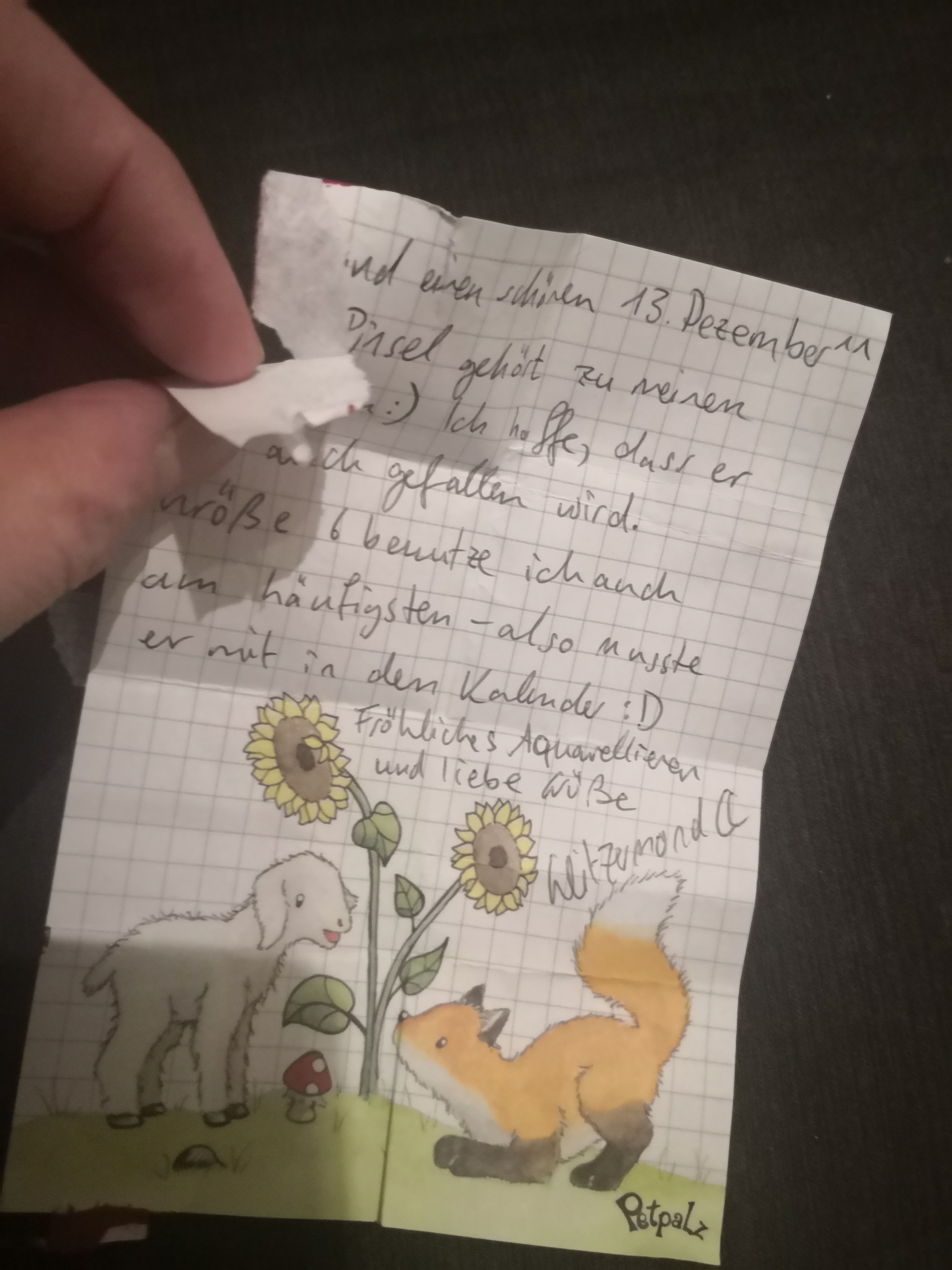 Der Inhalt war ein Stück von Simon’s Cat ;-) und eine weitere Gouache in weiß. Das gesiegelte Briefchen fing dann auch mit “Ja, ja, noch eine Gouache…” an.
