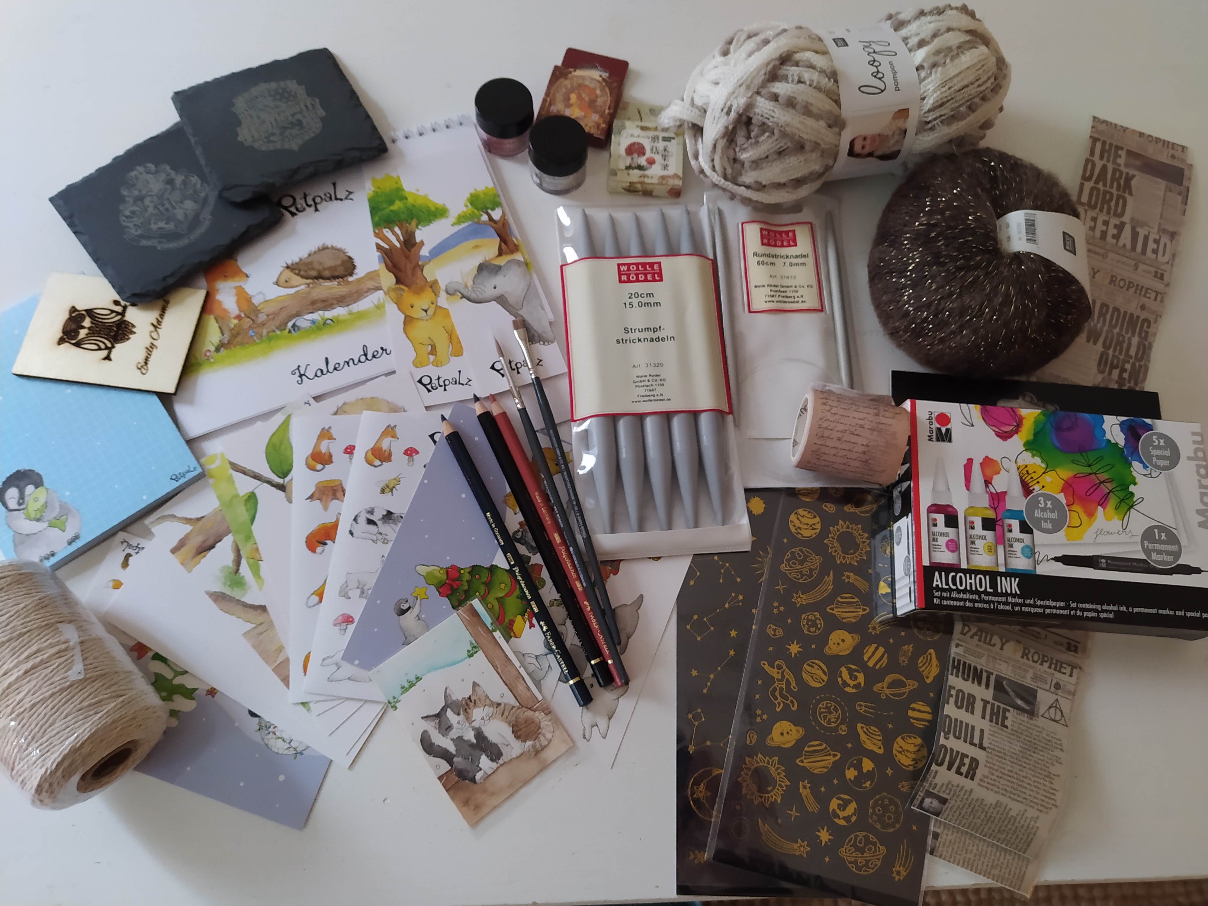 Ich habe hier nochmal all die tollen Inhalte (minus die Geschichtszettel und den Süßigkeiten) zusammengesammelt. Ich hoffe ich habe nichts vergessen, denn vieles war bereits im Einsatz, weswegen ich es von meinem Zeichentisch erstmal wieder zusammensammeln musste