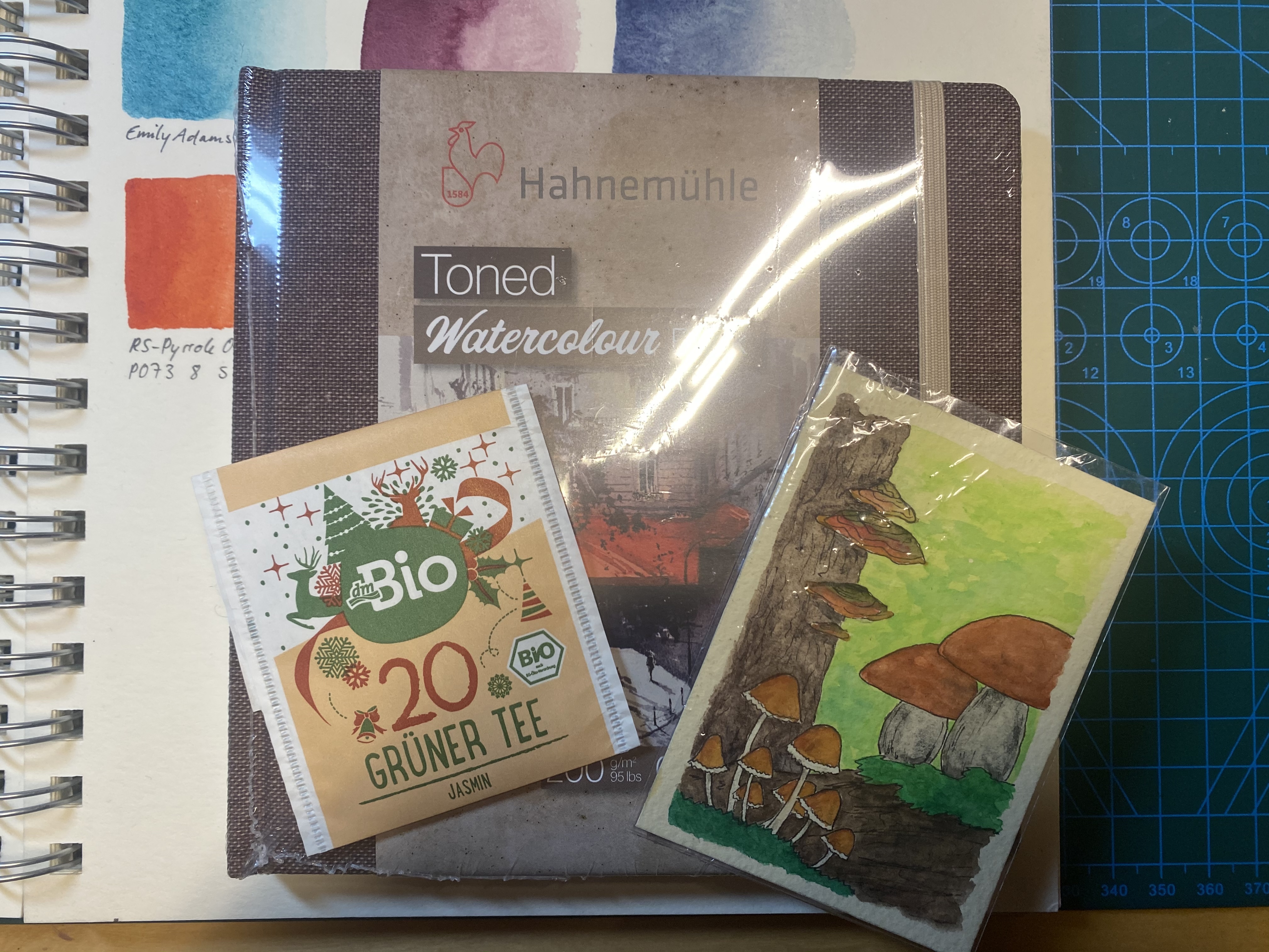 An Tag 20 habe ich eine richtig tolle Pilzkarte bekommen, sowie ein getöntes Aquarellskizzenbuch von Hahnemühle und einen Tee. Kann ich alles gut gebrauchen, vielen Dank!
