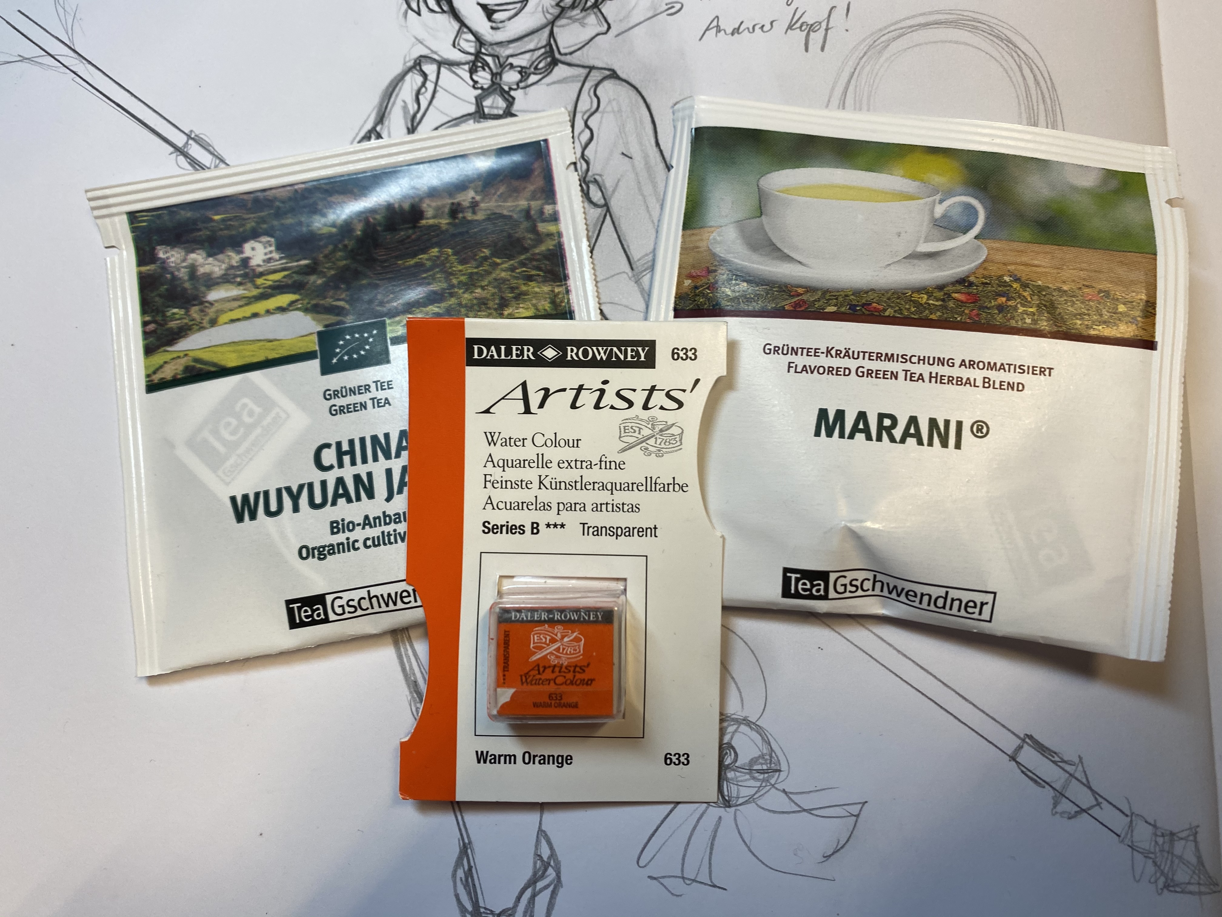 Und auch ein Dankeschön für die Aquarellfarbe und den Tee. So ein knalliges Orange habe ich wirklich noch nicht.