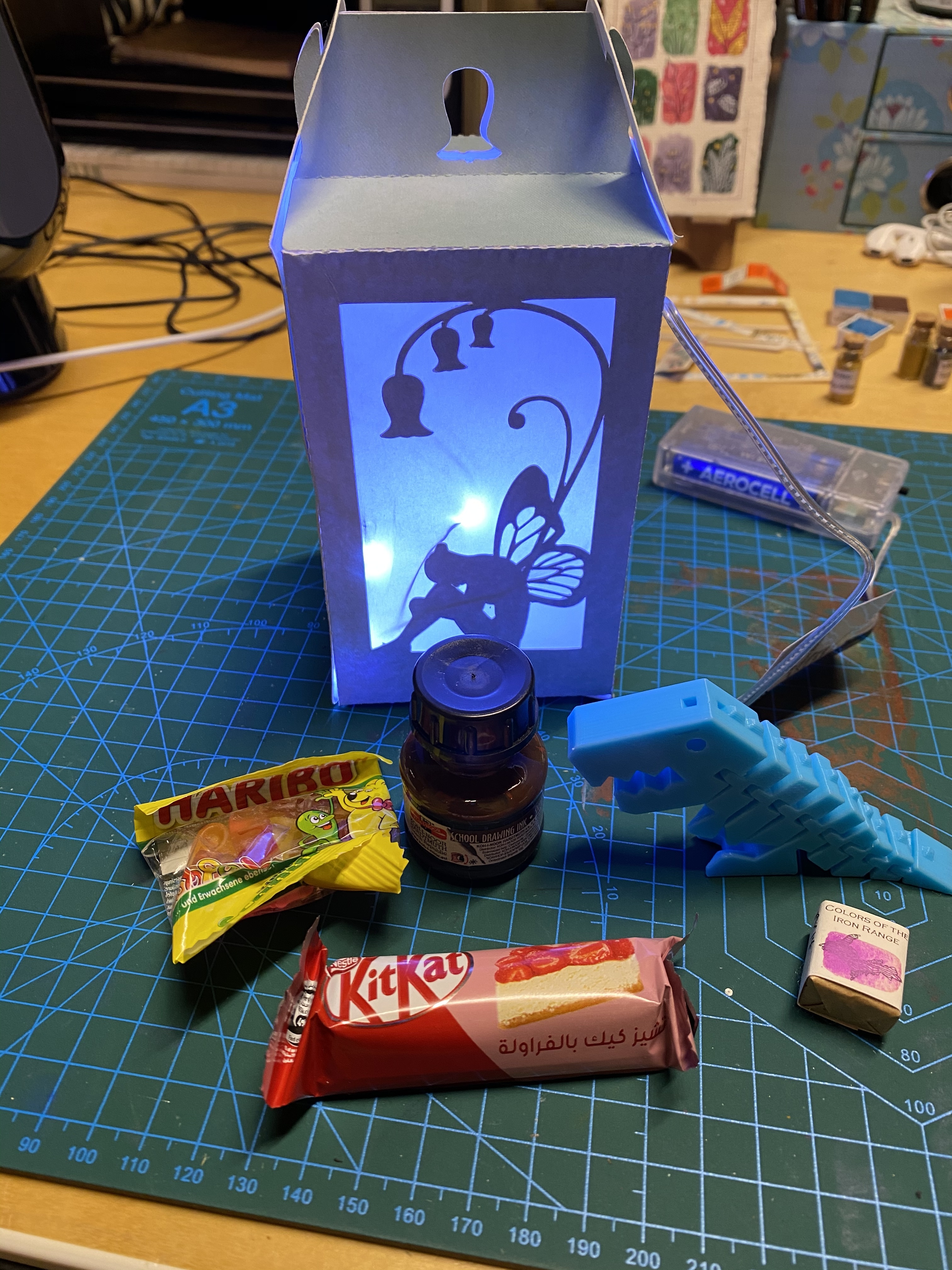 An dem Tag habe ich die hübsche Laterne öffnen dürfen. Der Inhalt ist richtig toll. Ich mag den Dino total gerne. Die Tusche und die Aquarellfarbe sind auch echt schön. Der Süßkram wurde sofort vernichtet!